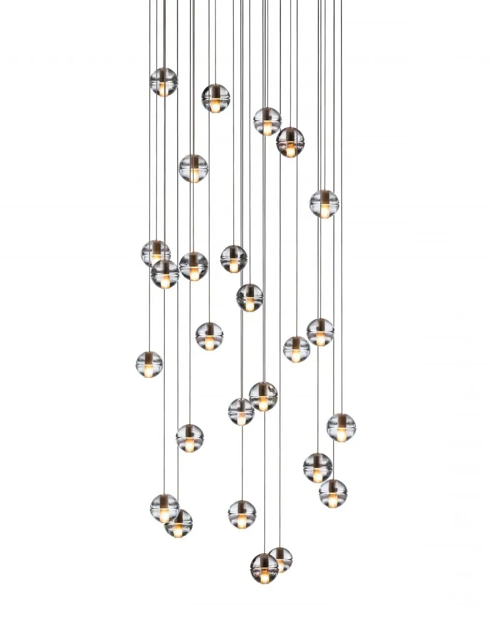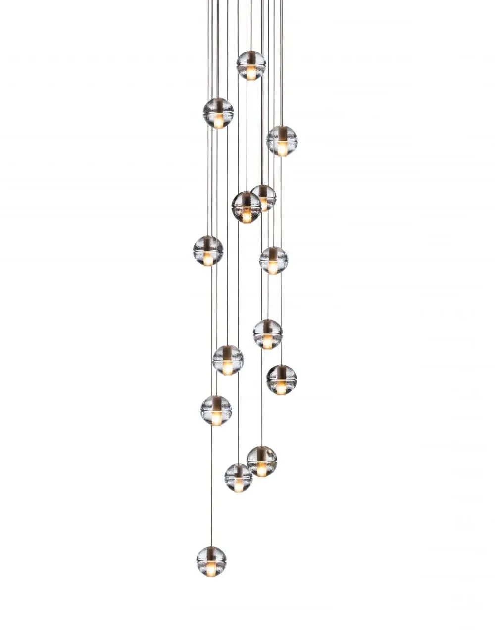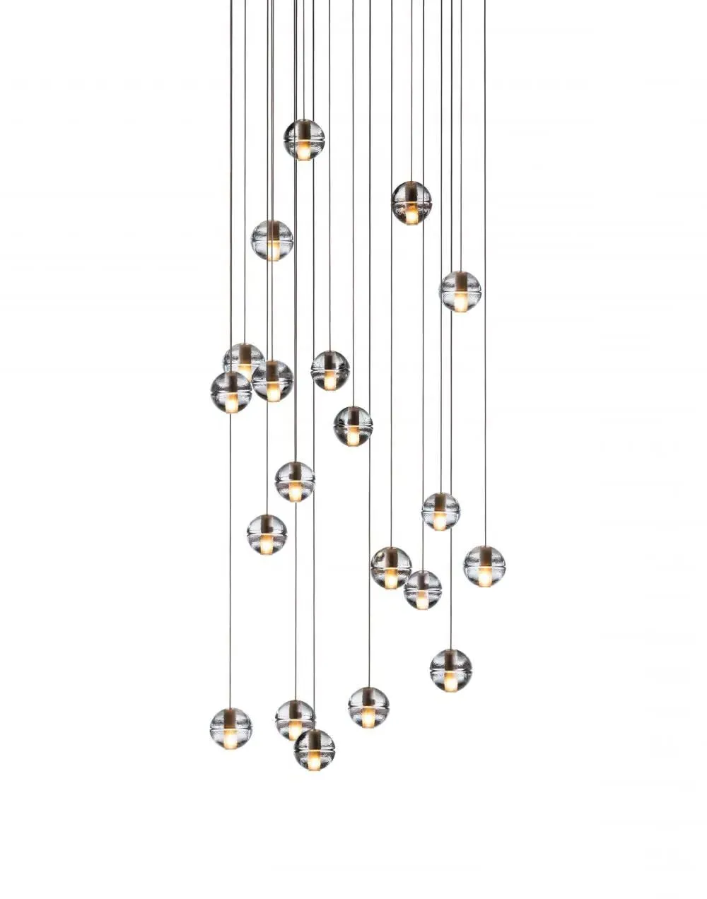 Designed by Omer Arbel, the Series 14 pendant light 11 - 36 pieces by Bocci casts a refined glow which pairs well with the cascading formation of the lights. Constructed from a handblown, seamed cast glass sphere with a frosted cylindrical void creating the look of an artistic snowglobe (which houses either a low voltage bulb or replaceable LED). Each light is unique as they each have varying amounts of trapped air bubbles which form as the glass sets. The Series 14 pendant light 11 - 36 pieces lend themselves to an industrial or eclectic aesthetic. This light is suitable for residential and hospitality settings and is perfect for lighting up all living areas. Standard comes with a round brushed nickel ceiling rose. White available at extra cost. CE approved. Available with up to thirty-six pendants. Two bulb options available. Extra cable is available. For more information please email sales@hollowwaysofludlow.com.