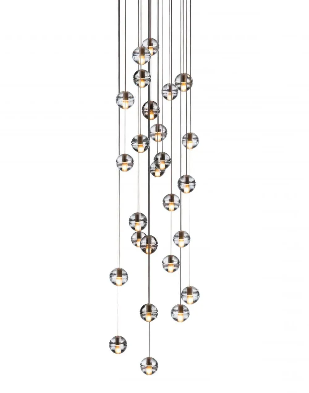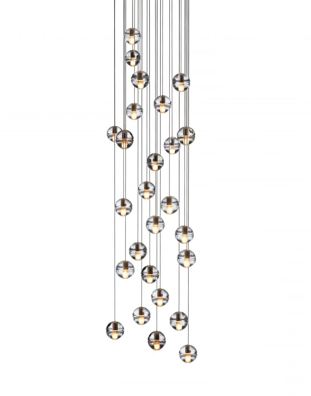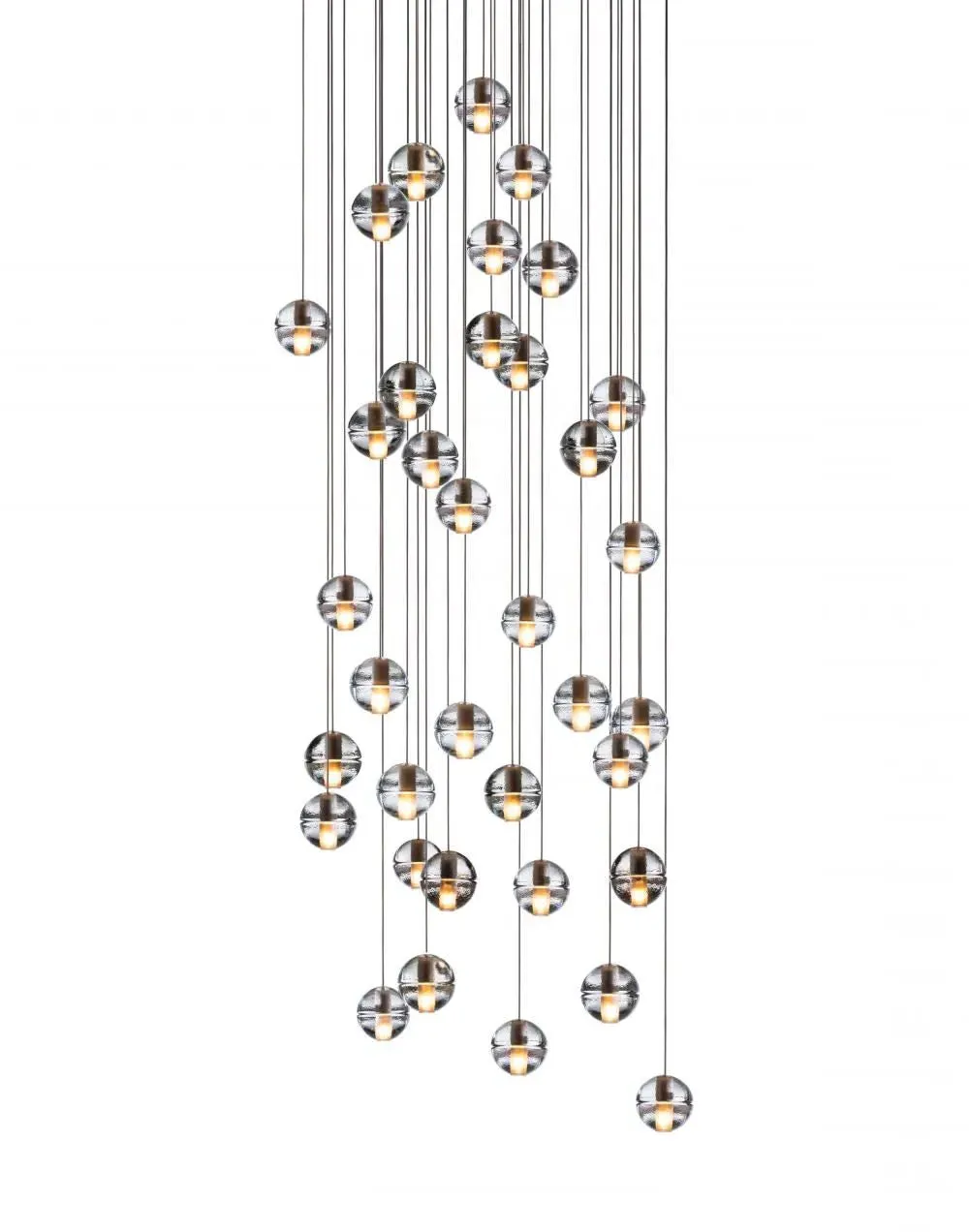 Designed by Omer Arbel, the Series 14 pendant light 11 - 36 pieces by Bocci casts a refined glow which pairs well with the cascading formation of the lights. Constructed from a handblown, seamed cast glass sphere with a frosted cylindrical void creating the look of an artistic snowglobe (which houses either a low voltage bulb or replaceable LED). Each light is unique as they each have varying amounts of trapped air bubbles which form as the glass sets. The Series 14 pendant light 11 - 36 pieces lend themselves to an industrial or eclectic aesthetic. This light is suitable for residential and hospitality settings and is perfect for lighting up all living areas. Standard comes with a round brushed nickel ceiling rose. White available at extra cost. CE approved. Available with up to thirty-six pendants. Two bulb options available. Extra cable is available. For more information please email sales@hollowwaysofludlow.com.