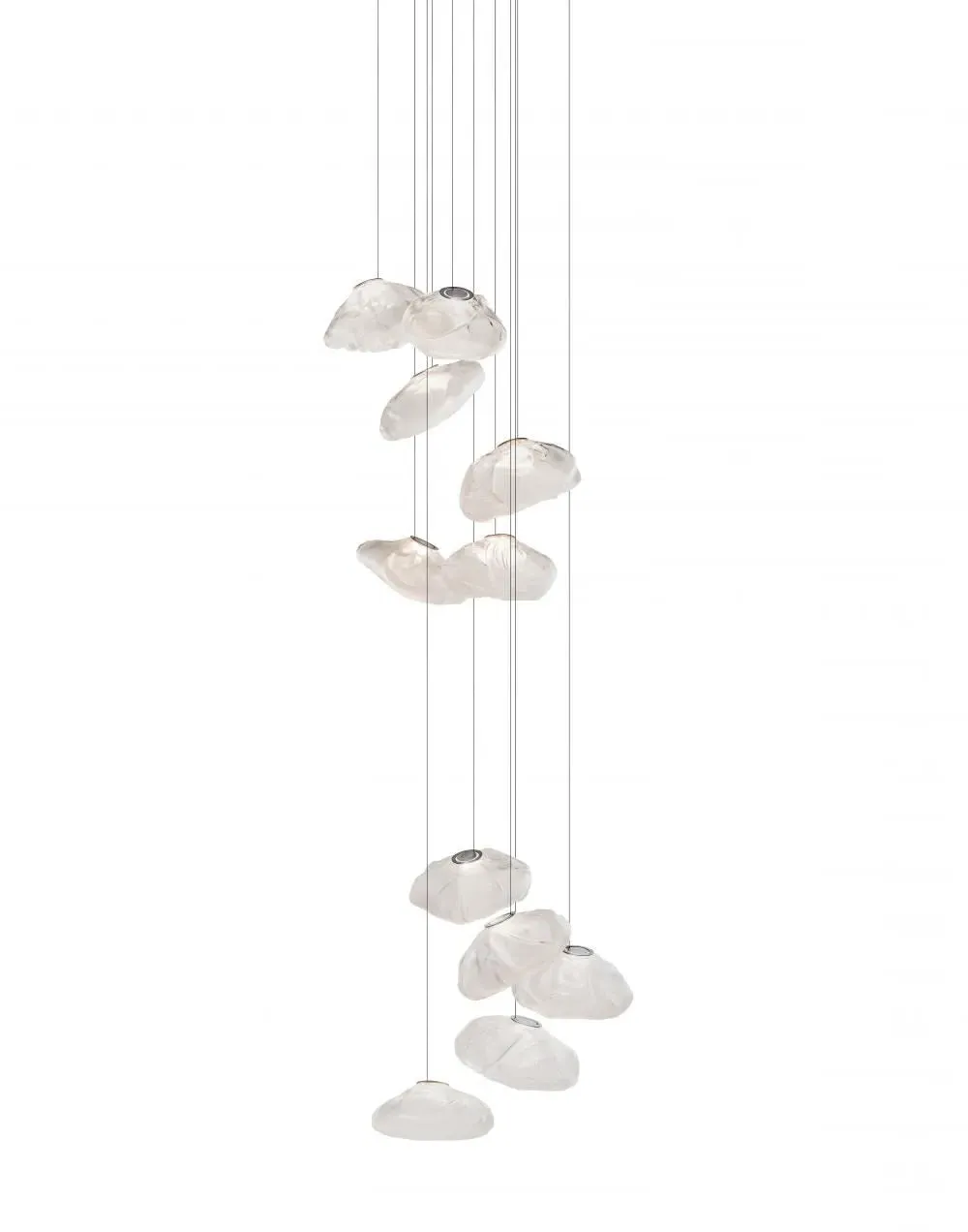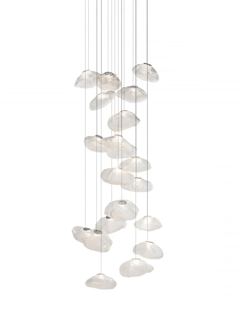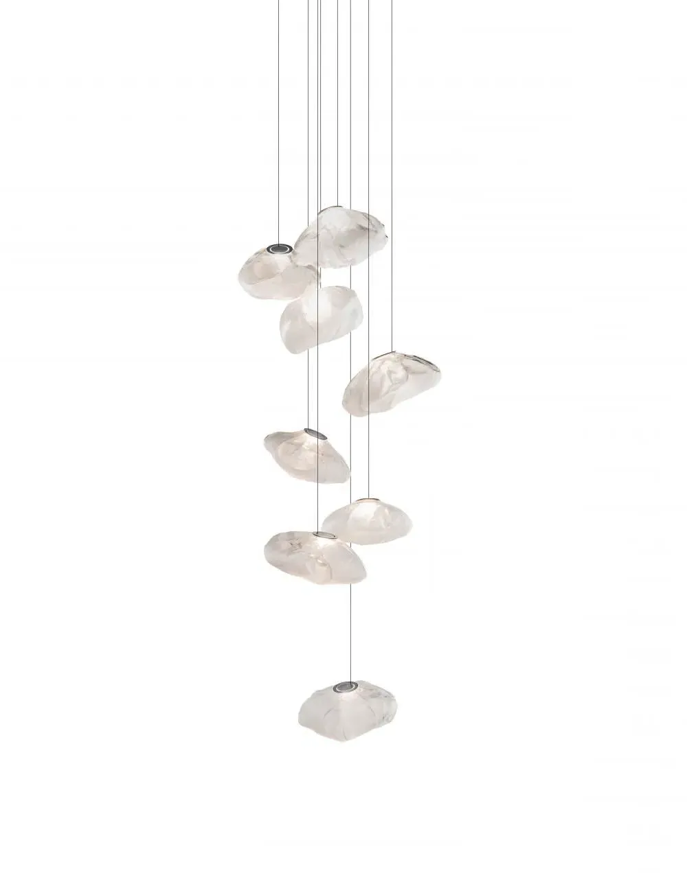 Designed by Omer Arbel, the Series 73 pendant light 8 - 20 pieces by Bocci is constructed using liquid glass that is blown into a folded and highly heat-resistant ceramic fabric vessel, the end result is a shape that has a loose fabric and textural expression reminiscent of carved clothing in ancient Greek sculptures. Each light also includes a flat LED within its delicately crafted glass, resulting in a refined illumination. Rated IP65 this light is suitable for use in wet spaces like your bathroom, and with robust flex cables it is also perfect for use in your living room or hallway. Such lights as the Series 73 pendant light 8 - 20 pieces complement a modern or contemporary aesthetic. With its textured fabric-esque design and metallic/pearlescent finish it can even lend itself to an industrial aesthetic. UL and CE listed. Available with up to twenty pendants. Multiple canopy options, and three glass colours available. Due to the hand-crafting process the size as well as colour and tonality will vary. Extra cable is available. For more information please email sales@hollowwaysofludlow.com Please view ‘Colours, finishes, and styles’ for ceiling rose examples.