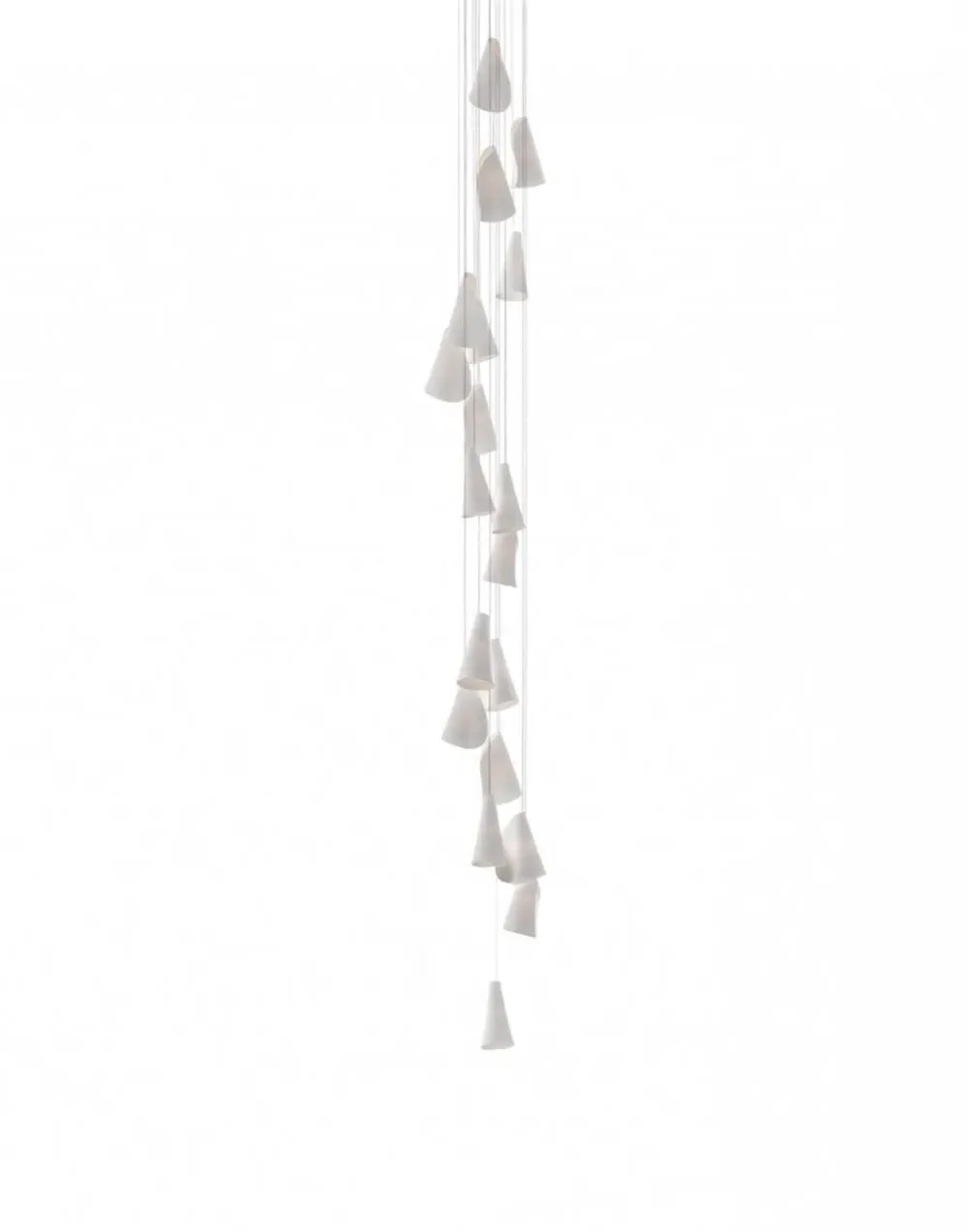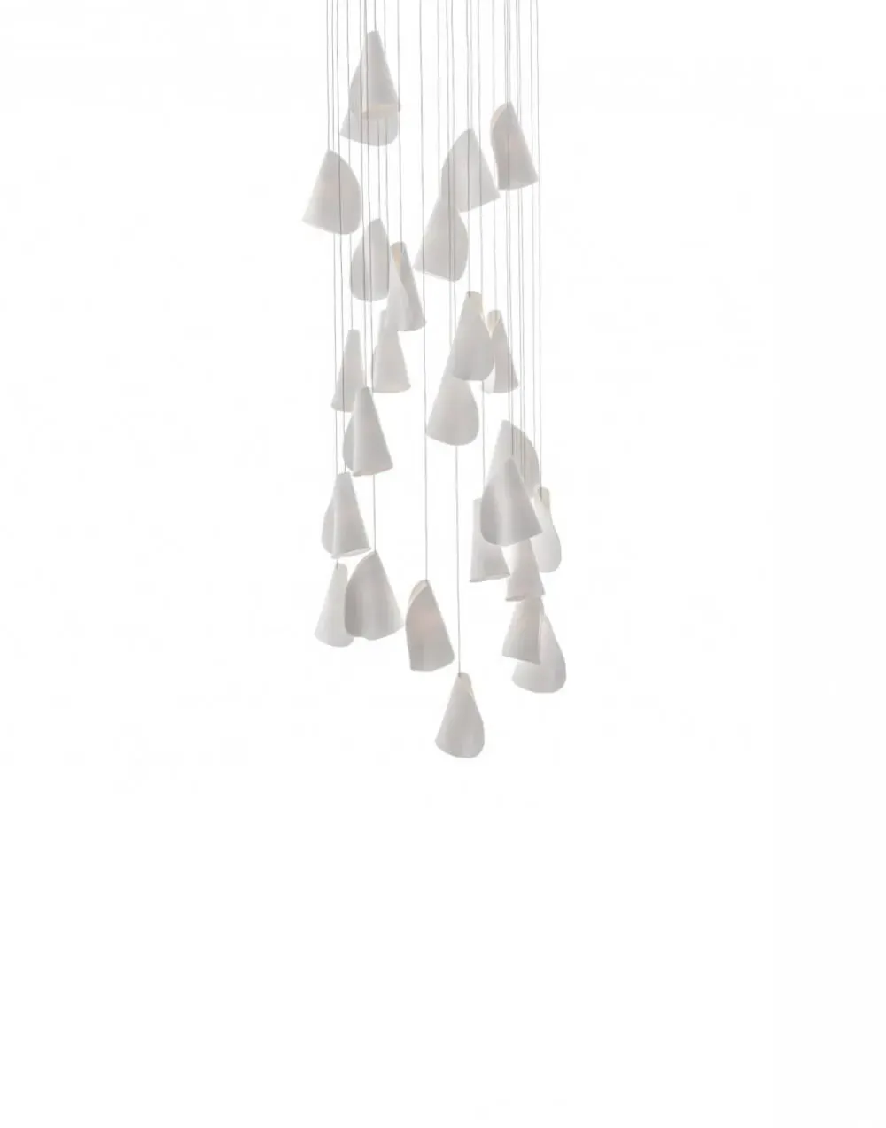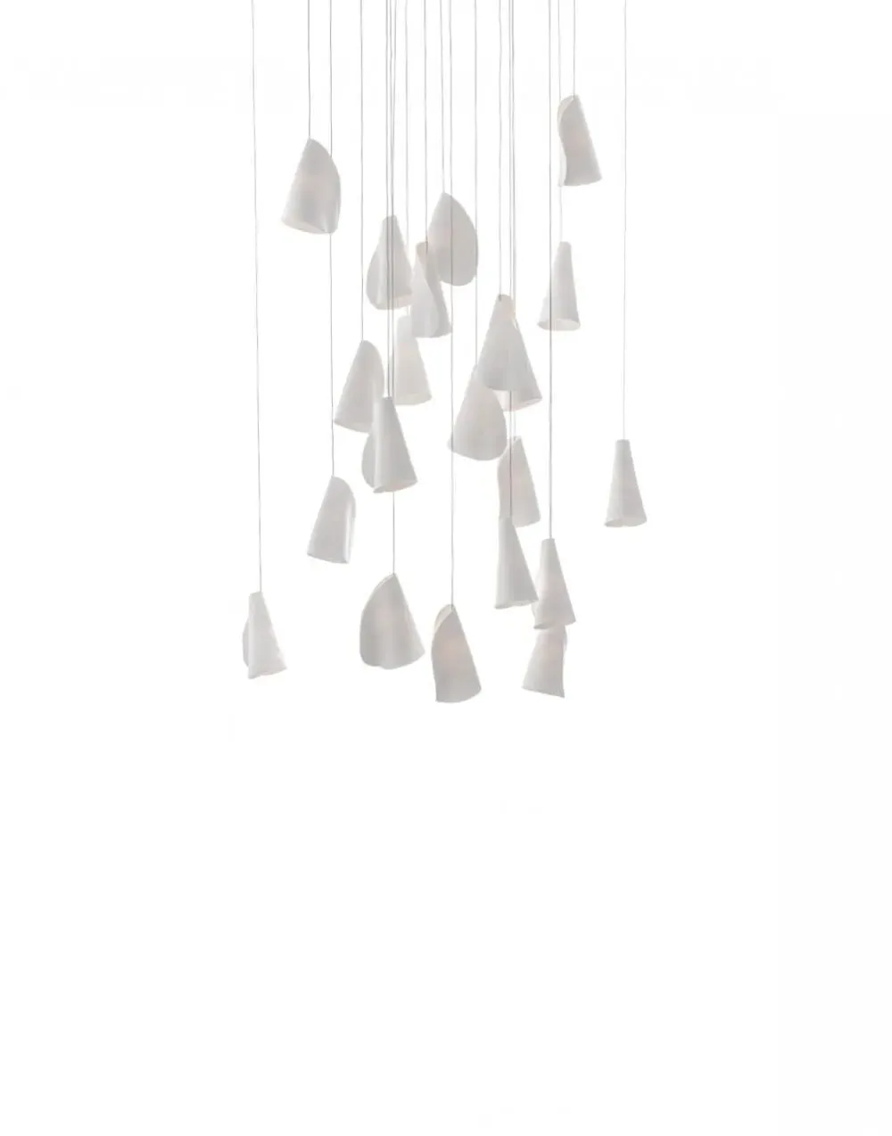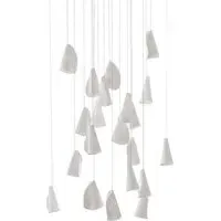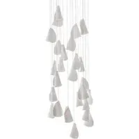 The Series 21 pendant light 11 - 61 pieces by Bocci has a textured shape reminiscent of a calla lily with its organically formed curves. This light is crafted from a random amount of raw porcelain that is flattened and rolled into a pancake shape, then it is wrapped around a frosted borosilicate glass inverted trumpet diffuser. This porcelain is allowed to flop over the diffuser, allowing each of the lights to have an individual and unique shape. Designed for both residential and hospitality settings this light can be placed in a hallway, above a stairwell or in a lobby. The Series 21 pendant light 11 - 61 pieces complements a modern and minimalist aesthetics with its smooth design. Available with up to sixty-one pendants. Two bulb options available. Extra cable is available. For more information please email sales@hollowwaysofludlow.com. Please view ‘Colours, finishes, and styles’ for ceiling rose examples.