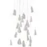 The Series 21 pendant light features a textured shape reminiscent of a calla lily with organically formed curves. Each light is crafted from raw porcelain that is flattened and rolled, then wrapped around a frosted borosilicate glass inverted trumpet diffuser. The porcelain naturally drapes over the diffuser, creating individual and unique shapes for each pendant. This 11-pendant configuration with rectangle canopy uses 20W Xenon bulbs and offers scalable options up to sixty-one pendants.