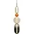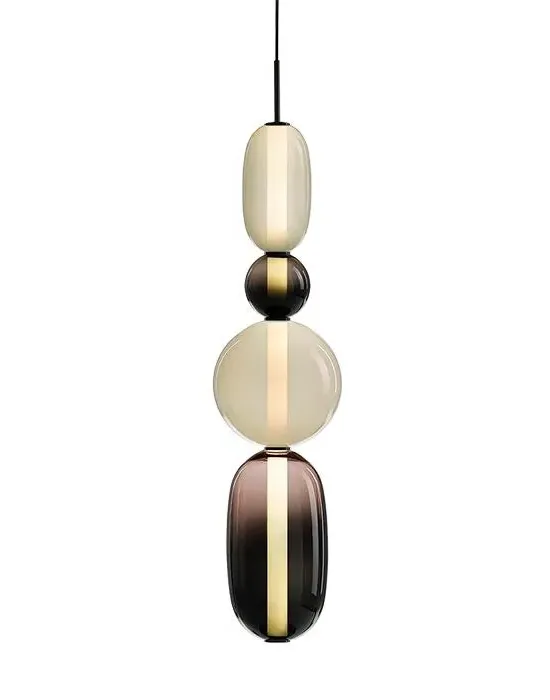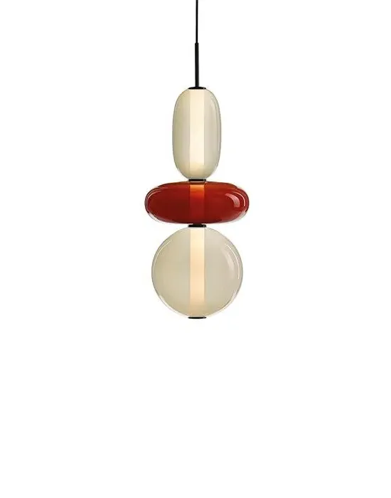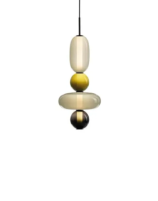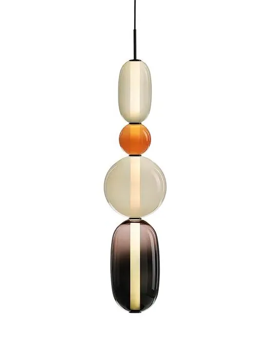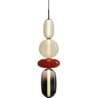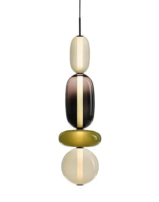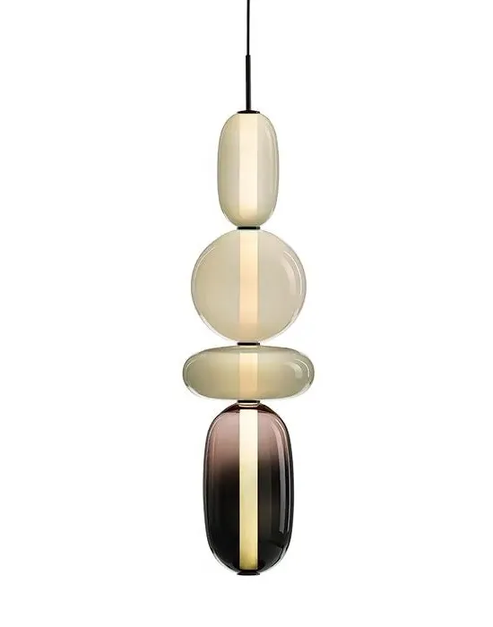 The Pebbles pendant light offers distinctive character with its hand-blown glass elements resembling polished pebbles. Each diverse shape connects through an internal light source, creating a vertical collection of varied forms and colours. The glass construction provides durability while delivering ambient illumination, and the bead-like elements add visual texture to any space.