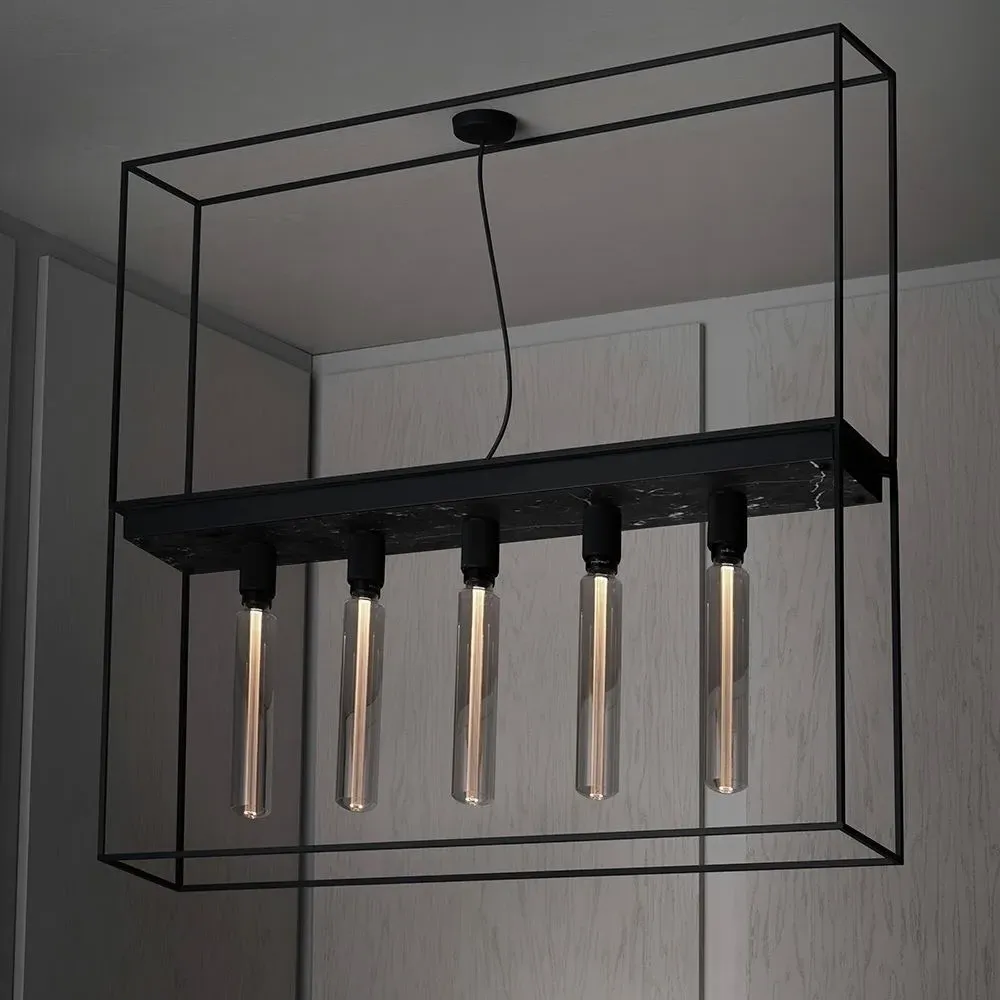 The Caged Ceiling 5.0 lamp is a ceiling light made from a matte black metal cage, and comes with a polished white or black marble back panel. Featuring 5 of Buster + Punch''s stunning Tube LED bulbs which are fixed into place with a matte black knurled lamp holder and the brand''s signature penny buttons, the Caged Ceiling 5.0 lamp is an eye-catching centerpiece perfect for placing over dining tables, kitchen islands and bars. Industrial yet contemporary in design, this light can be surface mounted directly to the ceiling or elongated with an extension cage. Please note: To be able to dim the light bulbs, please make sure you connect to a LED compatible dimmer.