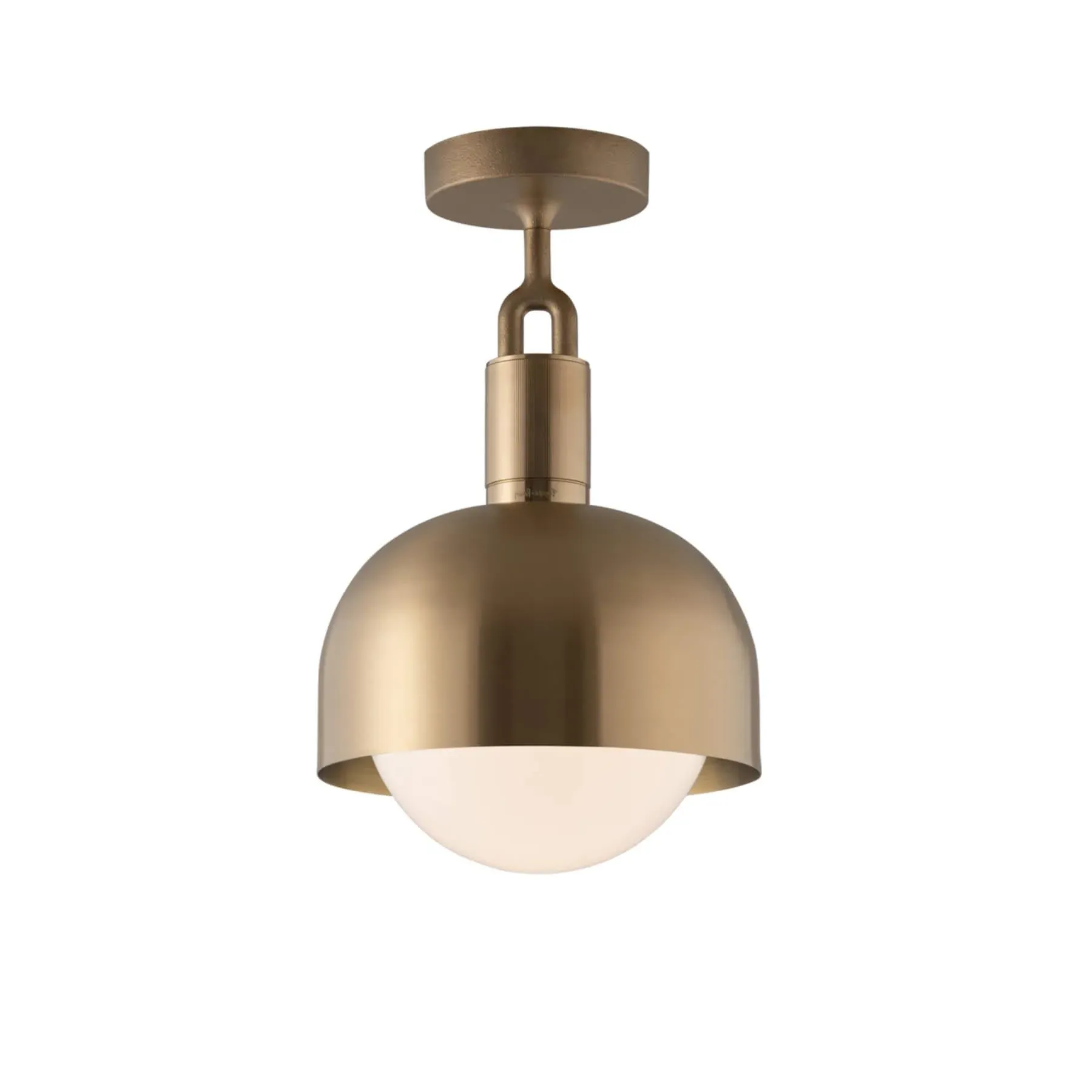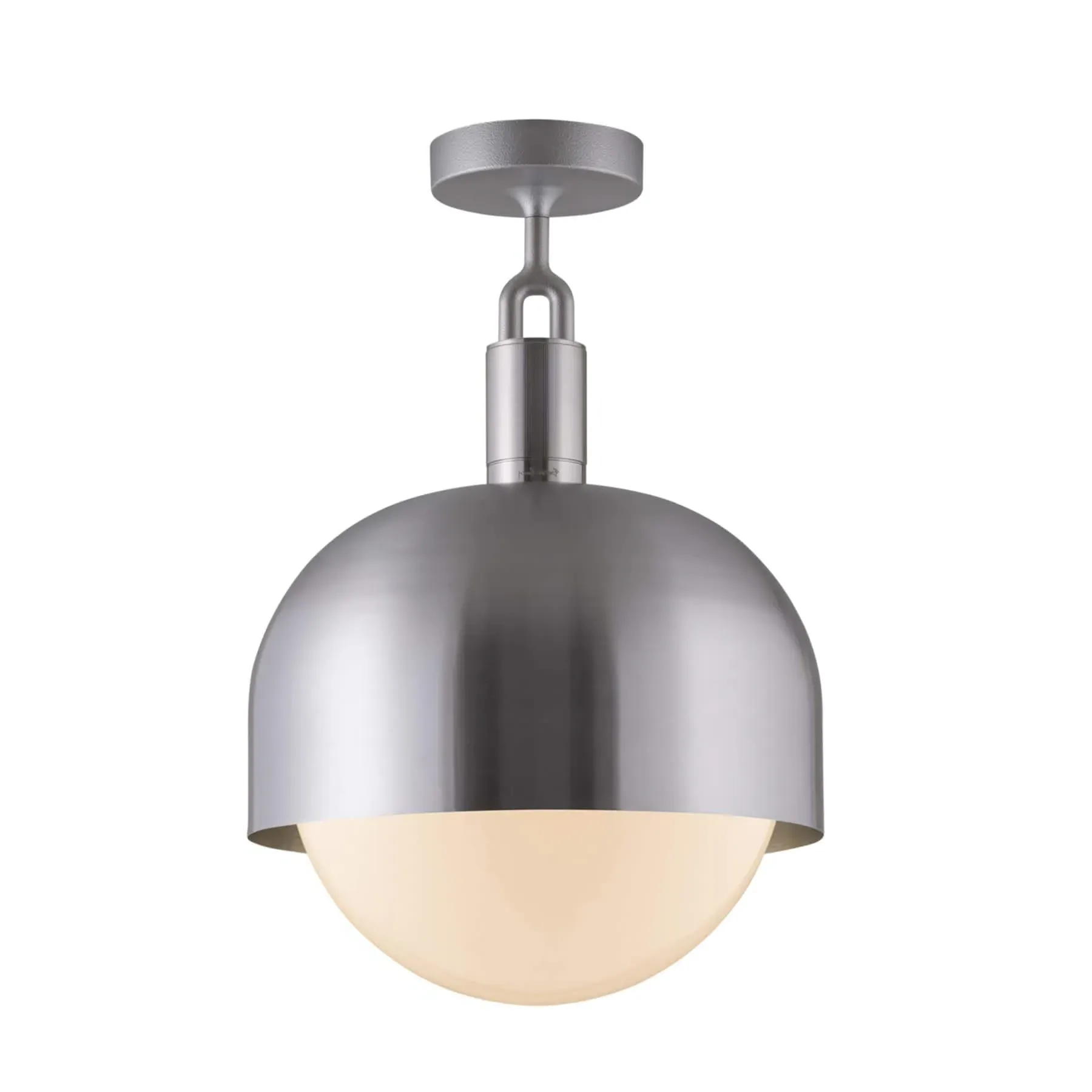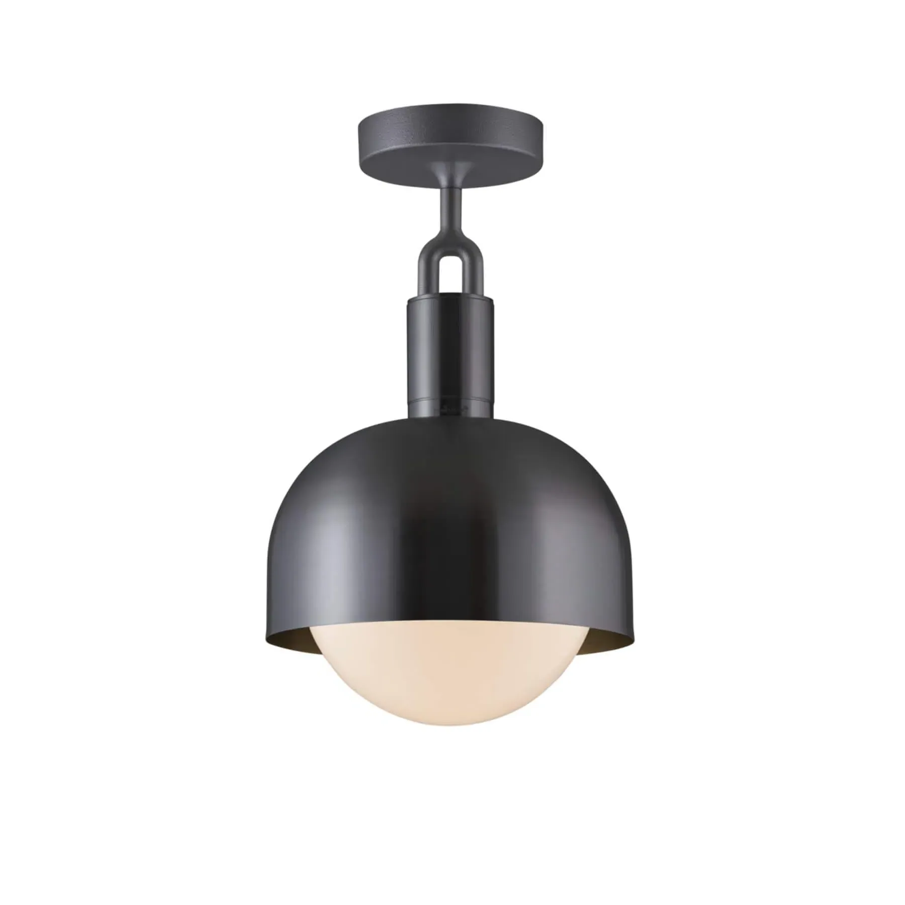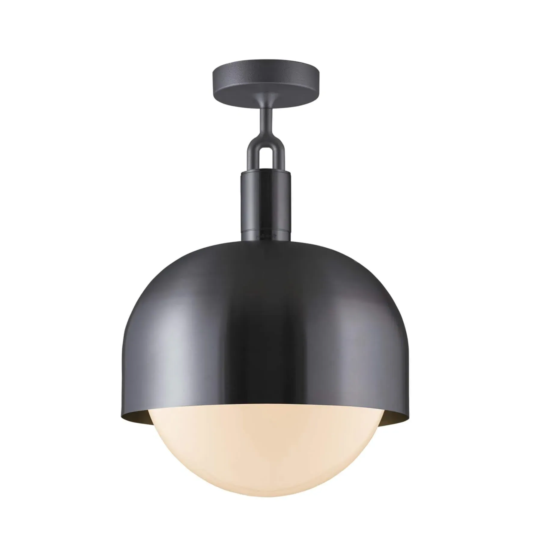 The ceiling globe light combines cast and machined metal construction with a hand-blown opal glass globe. Its diamond-cut linear knurl pattern and fork detailing provide distinctive visual appeal, while the metal frame ensures durability. The opal glass diffuses light evenly for ambient illumination, and the matte black ceiling rose offers secure mounting. Diameter: 20cm.