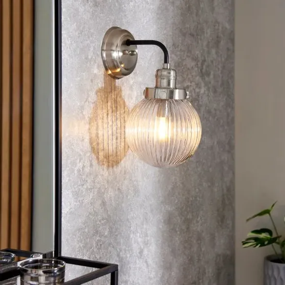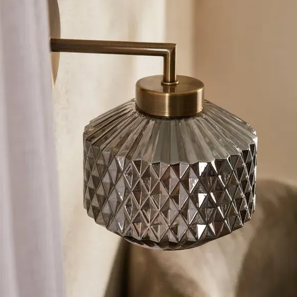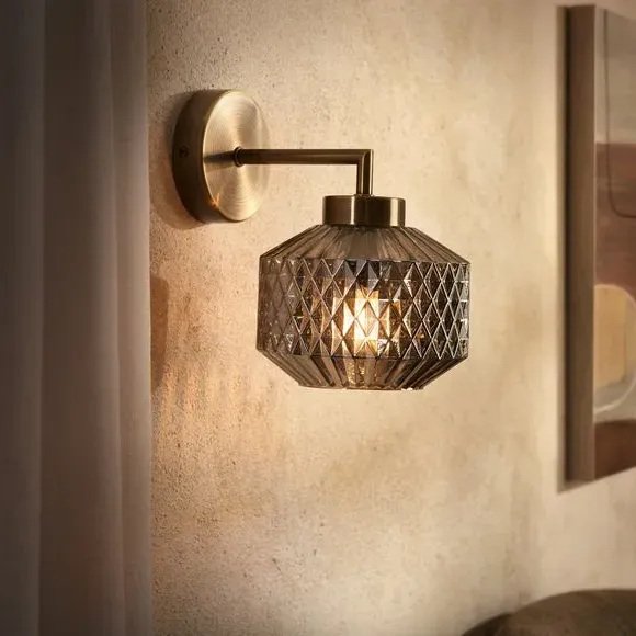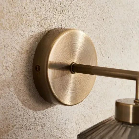 * Stunning Mid Century Design* Textured Glass Shade* Antique-Brass Finish* Dimmable Compatible - Requires Dimmable Bulb & Switch* Requires: SES E14 Cap Type & Golf Bulb* Energy Efficient E14 LED Lamp Compatible Add a flair of mid-century elegance to your walls with this stunning light, featuring a smokey, textured glass shade and antique-brass finish. Dimmable with the right bulb and switch, it’s perfect for creating a warm, inviting atmosphere.