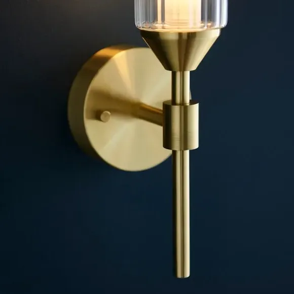 * Mid-Century Inspired* Clear Ribbed Glass Shade* Brushed Brass Metal Edging* Requires: G9 Cap Type & Capsule Bulb Illuminate your space with the Vogue Lighting Bailey Ribbed Wall Light, a modern masterpiece inspired by mid-century style. Its sleek design features a clear ribbed glass shade with a frosted inner, elegantly capped with brushed brass metal edging.