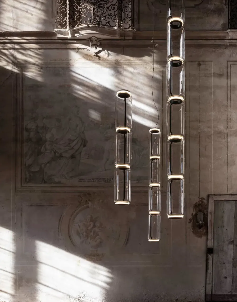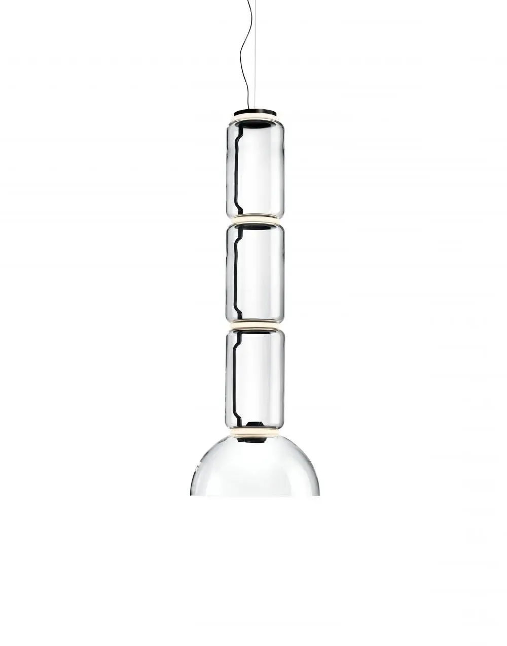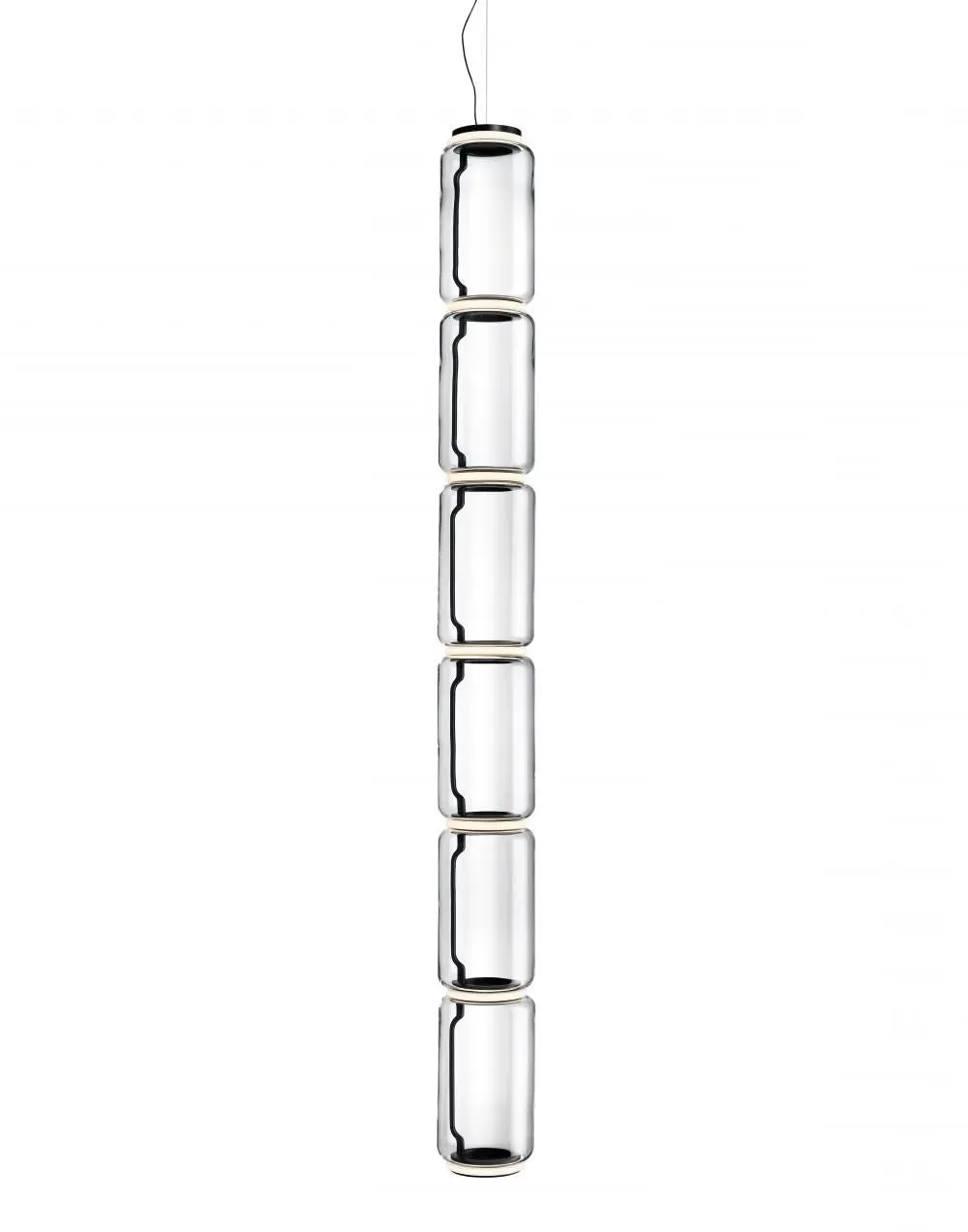 The pendant light combines conical and cylindrical glass modules in transparent hand-blown construction. Its stacked design creates a striking column form, featuring integrated LED rings at connection points that diffuse direct downlight. The modular glass system offers dynamic illumination, and the clear finish adds contemporary sophistication.