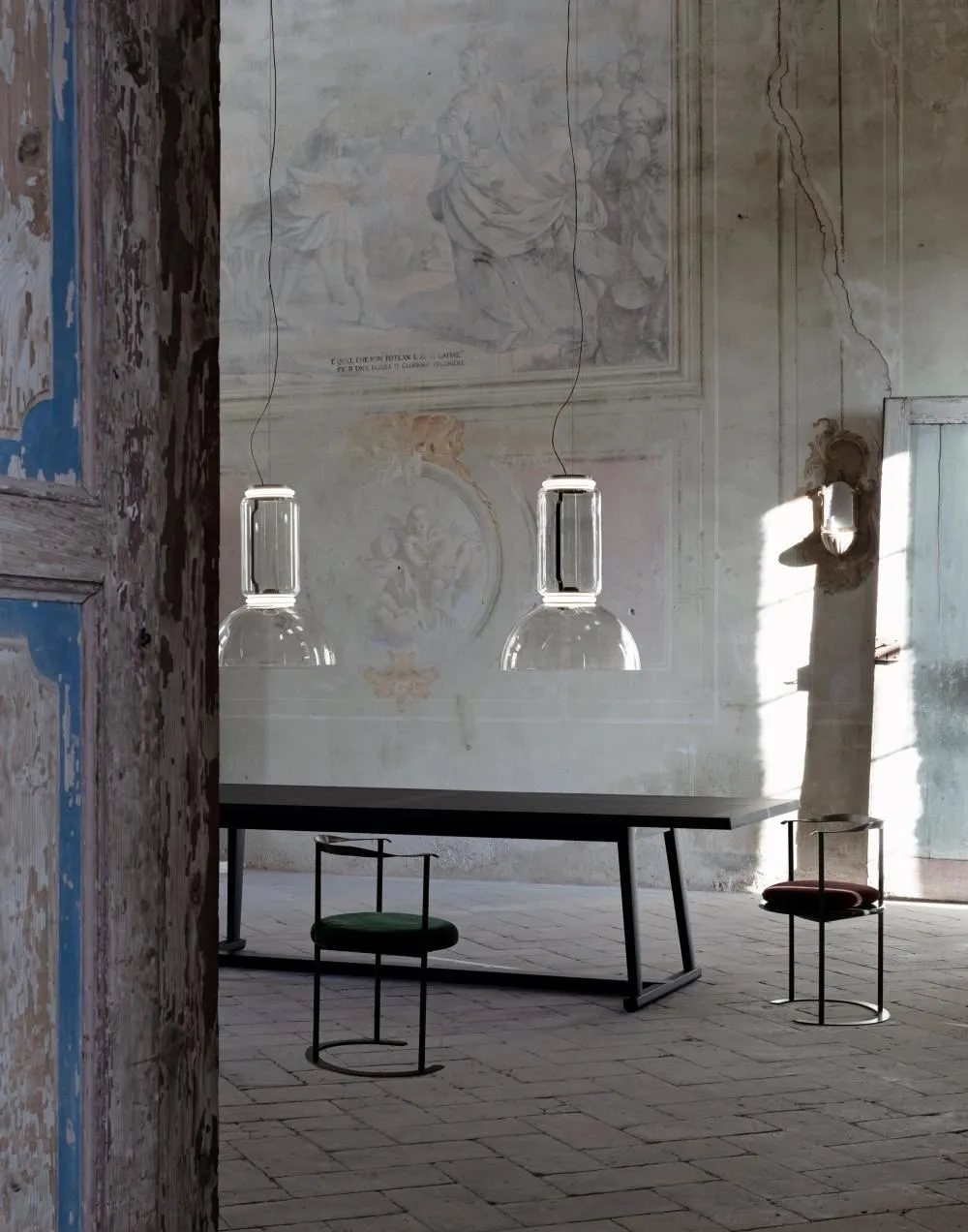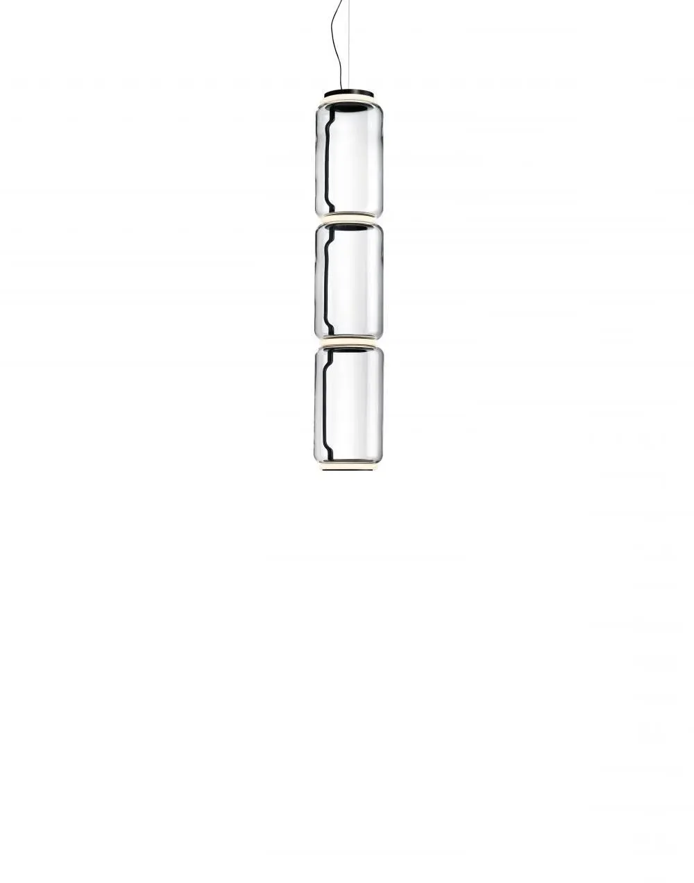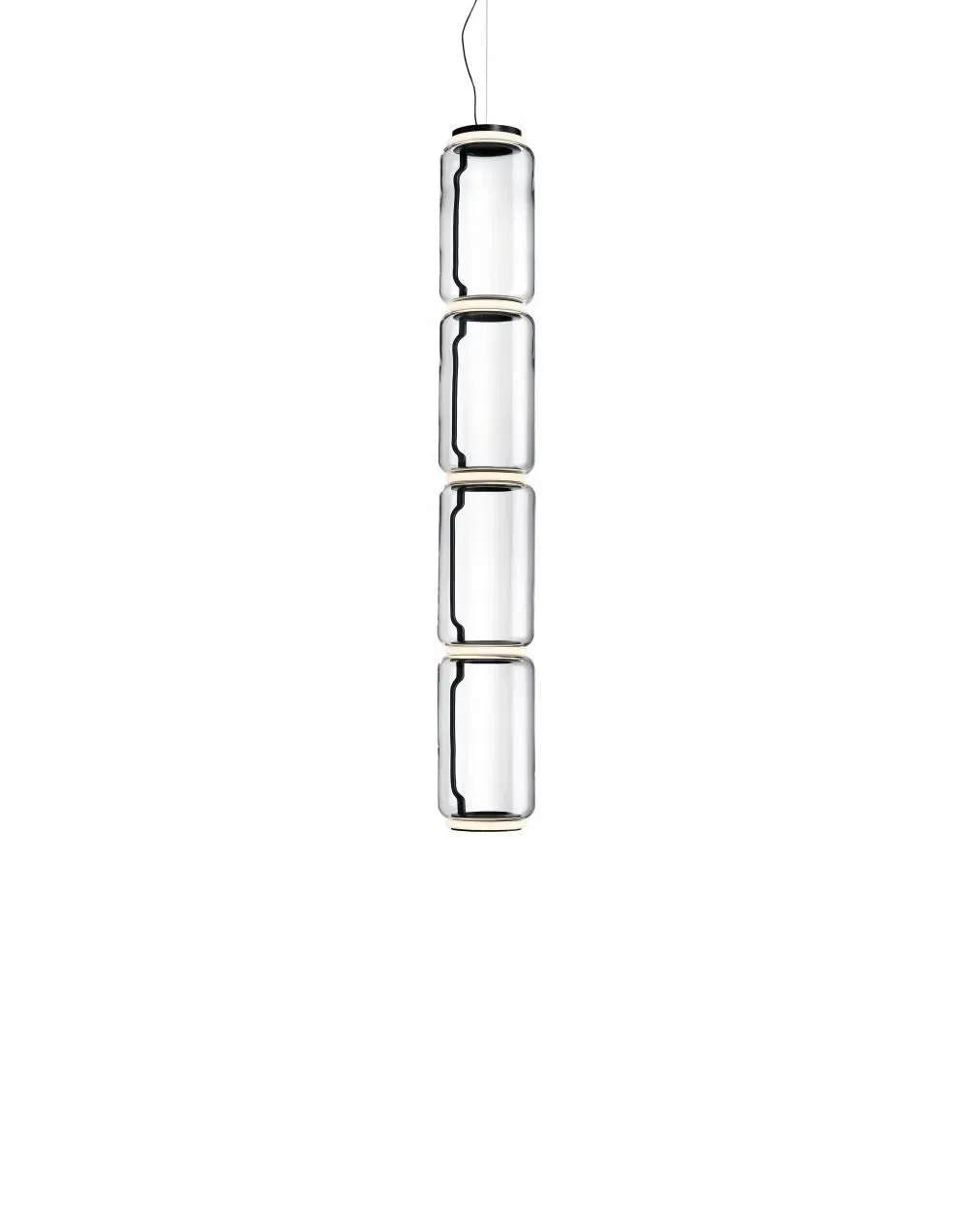 The pendant light combines conical and cylindrical glass modules in transparent hand-blown construction. Its stacked design creates a striking column form, featuring integrated LED rings at connection points that diffuse direct downlight. The modular glass system offers dynamic illumination, and the clear finish adds contemporary sophistication.