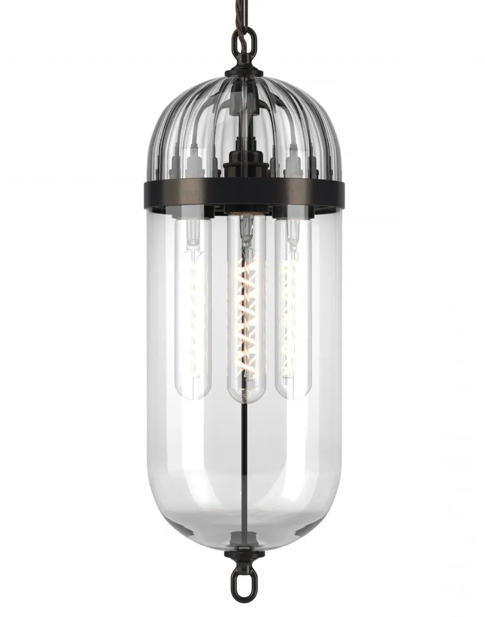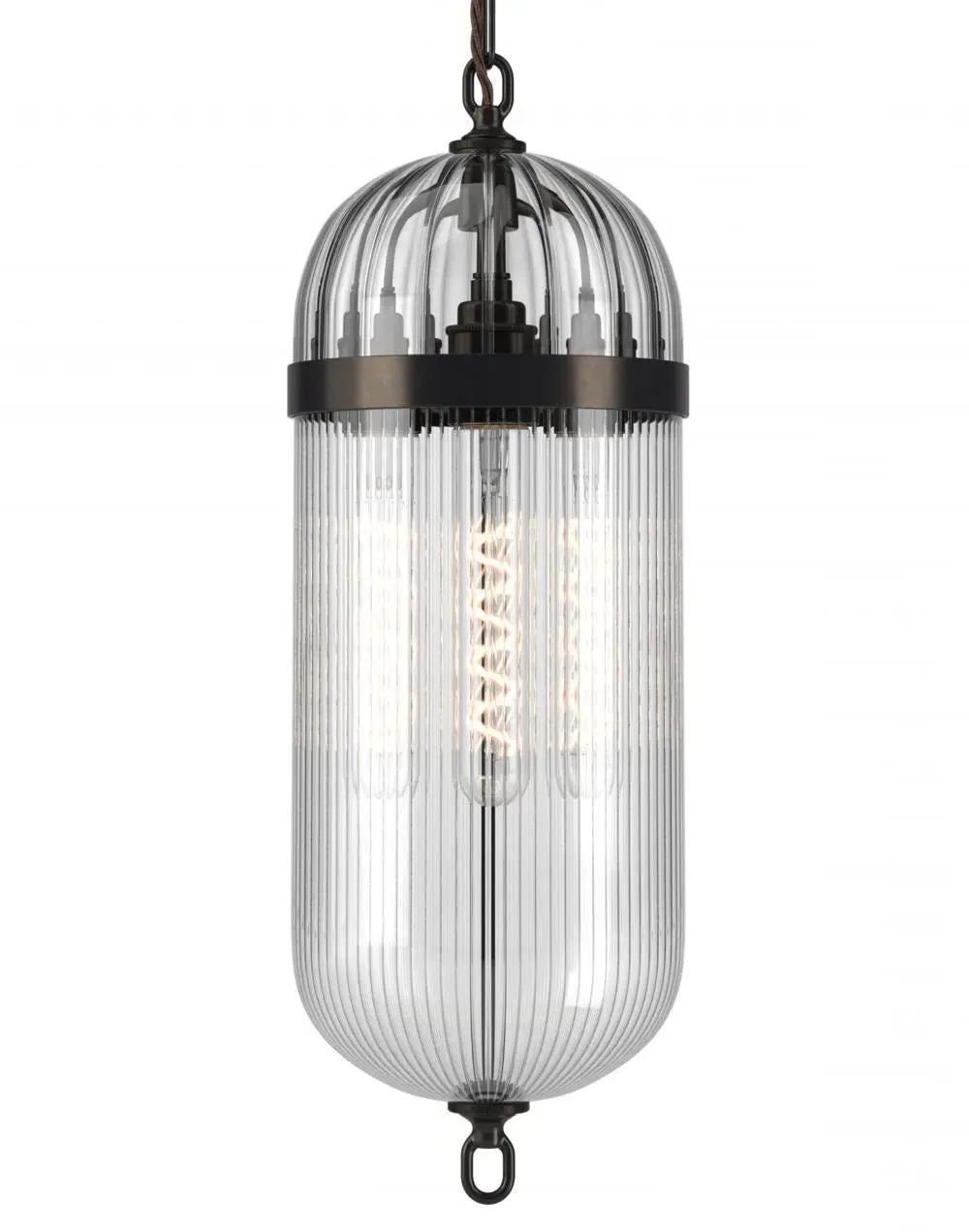 The Aston Pendant Lantern combines modern industrial style with bronze metalwork and skinny-clear glass configuration. Its watchmaking-inspired details provide versatile lighting solutions, while the waxed bronze finish offers superior longevity. The lantern produces bright ambient light through its clear glass panels, and the reinforced metal structure ensures stable suspension.