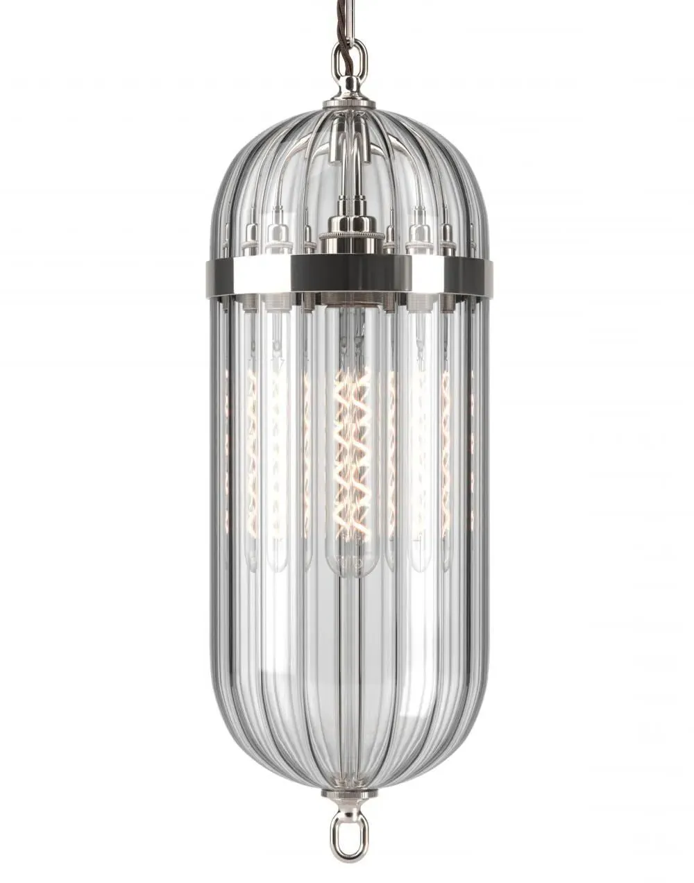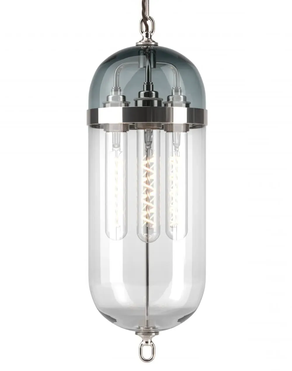 The Aston Pendant Lantern combines industrial design with modern craftsmanship, featuring a nickel metalwork frame and clear glass shade. Its watchmaking-inspired construction provides customizable glass options, while the waxed metal finish adds durability and character. The lantern offers warm ambient lighting with its clear glass configuration, and the sturdy pendant design ensures reliable overhead illumination.