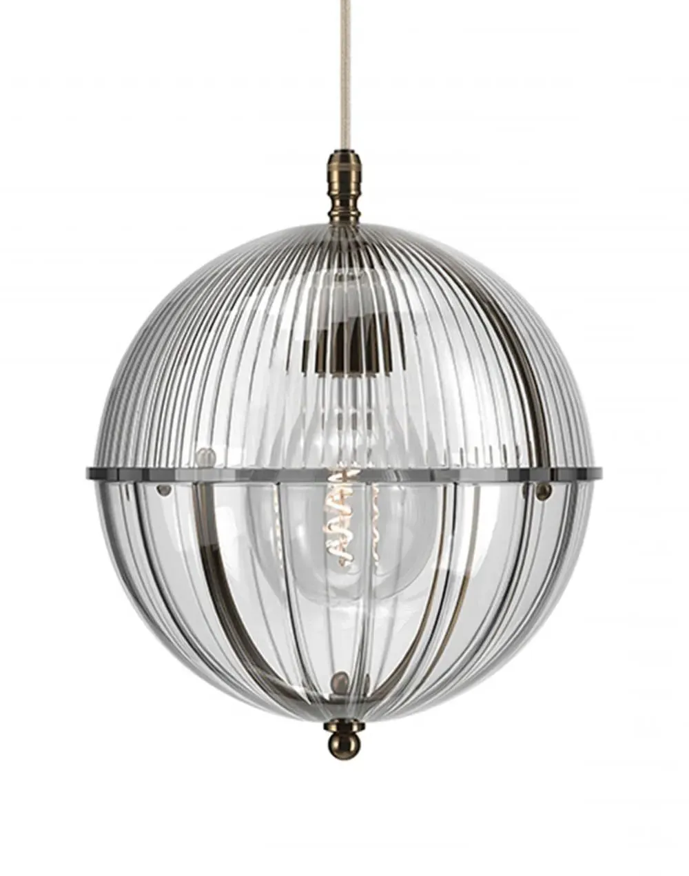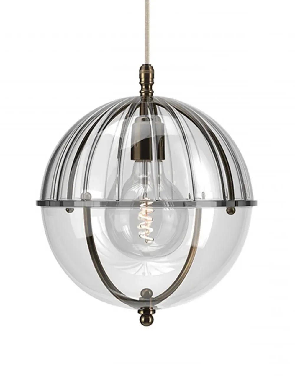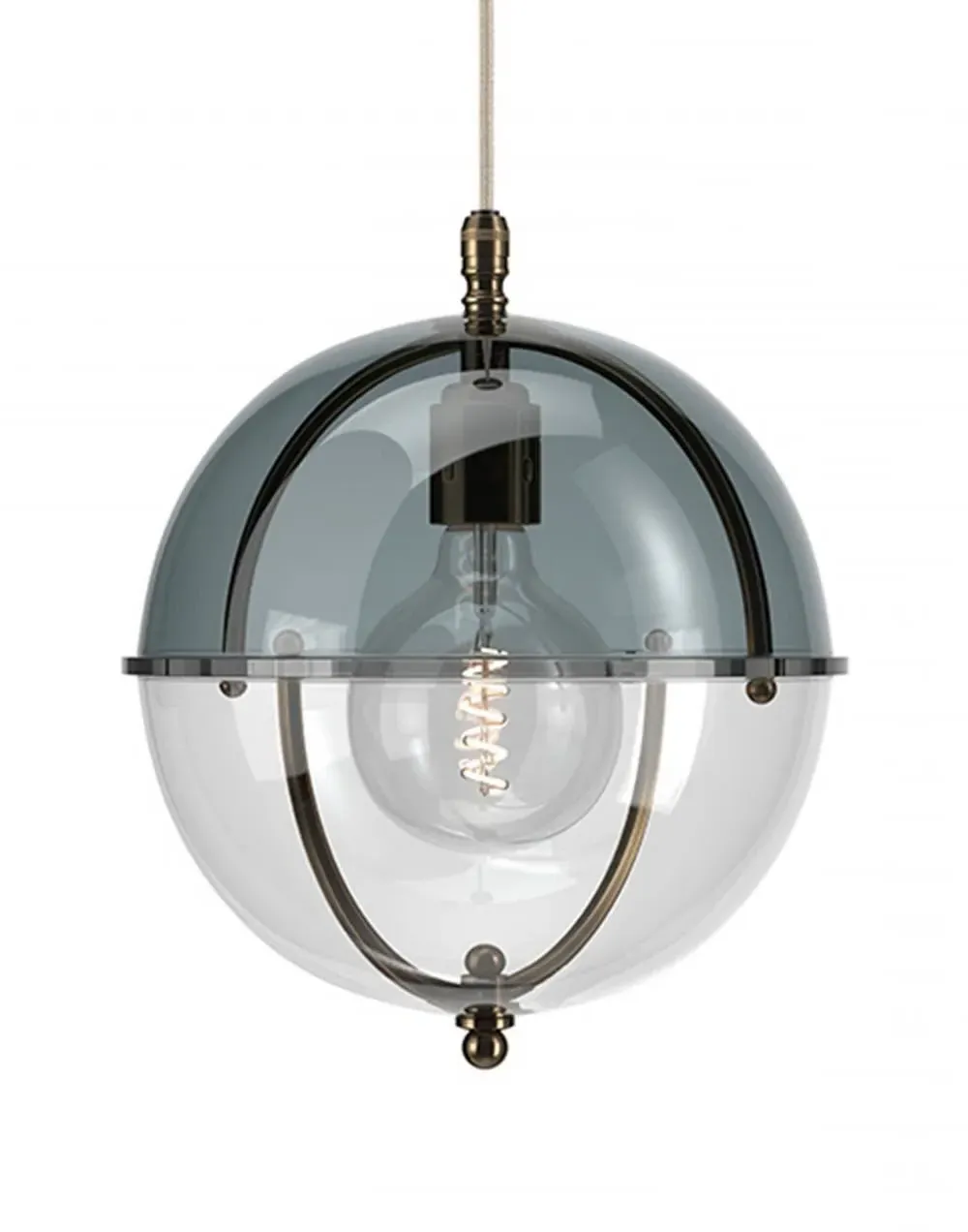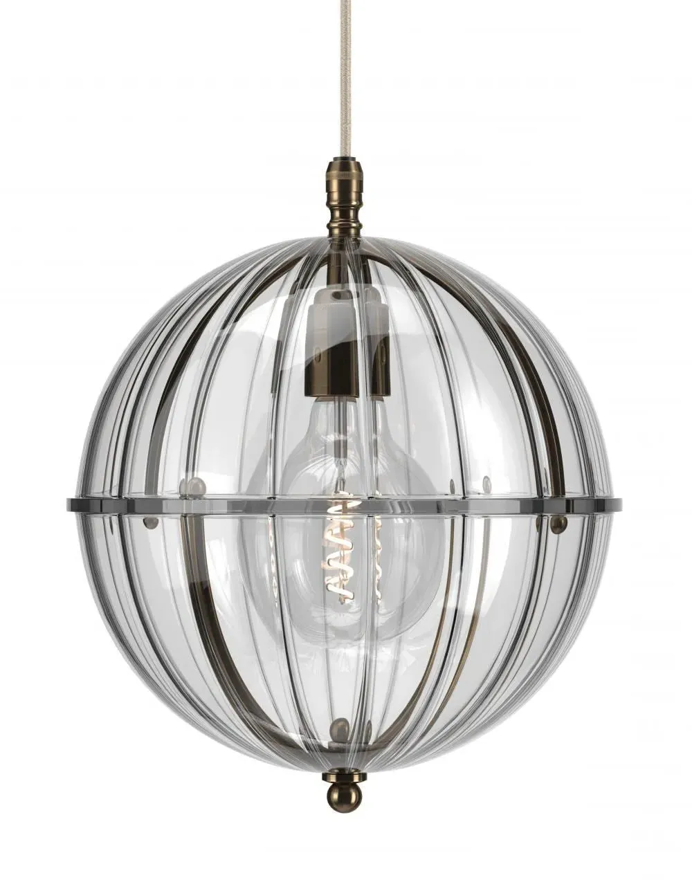 A striking new addition to the Fritz Fryer collection, the Grafton Globe pendant light was designed to emulate old Orrery models that showed how planets moved around the sun as time passed. Truly one-of-a-kind, this pendant looks as good on the inside as it does on the outside. Available to be personalised to your taste, the light comes with four types of metal fittings and five different top/bottom glass finishes. A unique choice for any traditional, modern or contemporary interior, the Grafton Globe pendant light will make a statement in any room. The Polished brass finish is lacquered. The other three options have a waxed finish. Please note: The pendant comes with a 1m black flex as standard. Please email customerservice@hollowaysofludlow.com for any coloured flex requests.