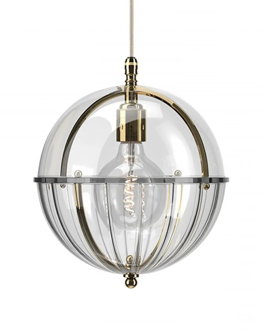 The Grafton Globe Pendant Light offers distinctive design inspired by old Orrery models that tracked planetary movement. Its polished brass finish features lacquered protection, while the clear glass globe provides bright illumination. The pendant comes with customizable metal fittings and glass finish options to suit your space. Complete with 1m black flex as standard, with coloured flex available upon request.