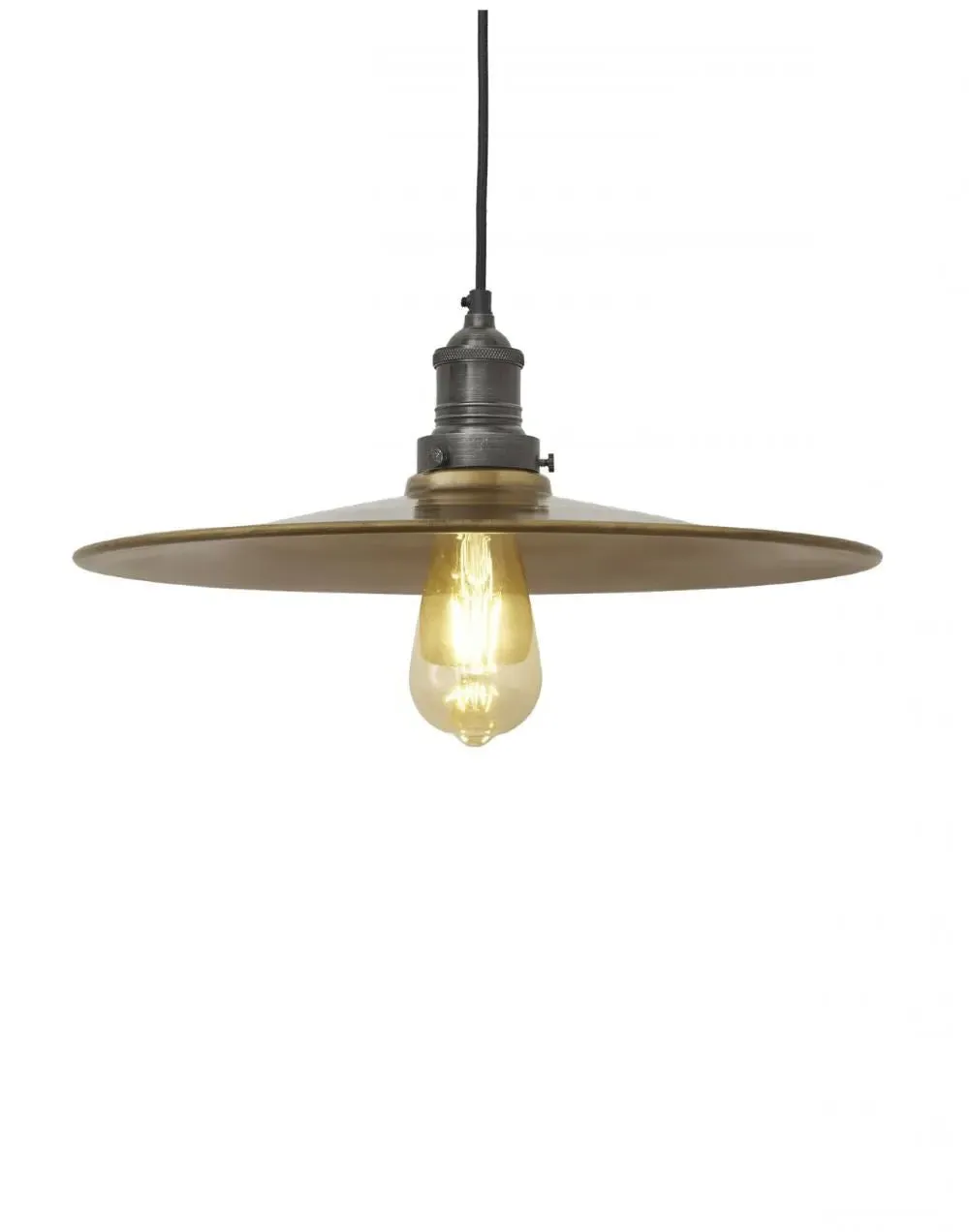 The pendant light features industrial styling with its flat metal shade and traditional bulb holder configuration. Its brass shade finish creates visual interest, while the black fabric flex provides clean contrast. The 1-meter cord offers flexible positioning options, and the metal construction delivers dependable quality. The design accommodates both single and grouped lighting schemes.