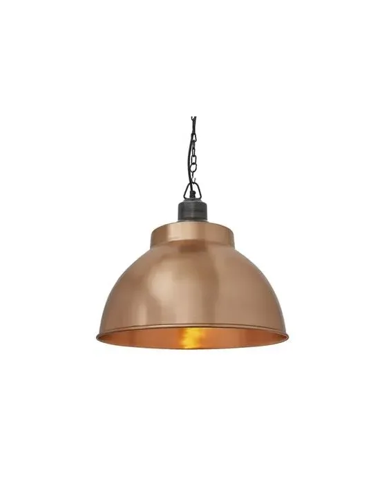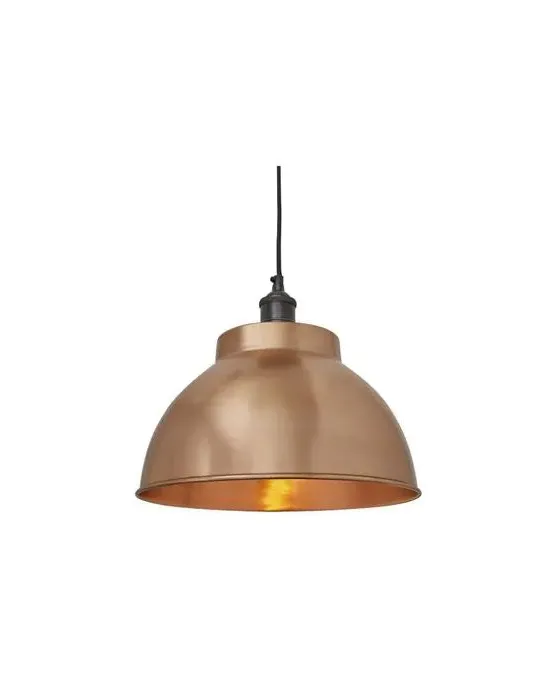 The dome pendant light features industrial styling with its smooth, domed shade and traditional-style fittings. Its copper finish delivers rich metallic warmth, while the matching holder and chain complete the unified aesthetic. The light comes with a 1-meter black fabric flex and matching ceiling rose for convenient installation. The classic design works effectively as a single fixture or in series arrangements.