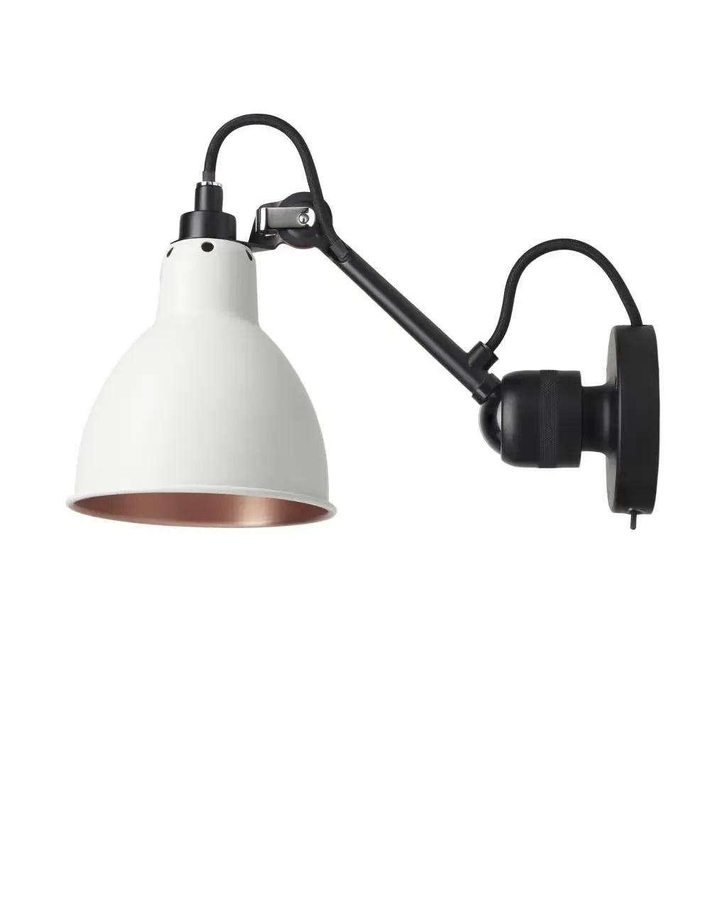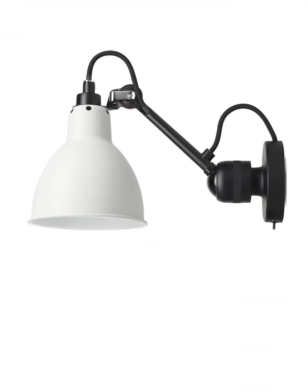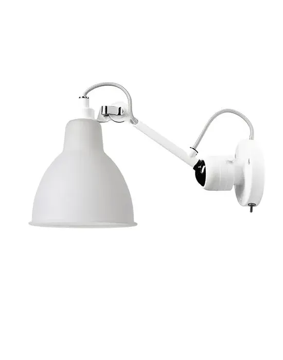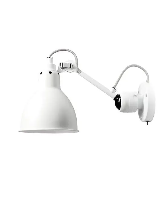 The wall light offers industrial-inspired design with its adjustable arm and round shade. Its robust metal construction provides durability, while the switched operation adds convenient control. The contrasting white arm and black shade create visual interest, and the articulated arm allows directional lighting for task or accent use.