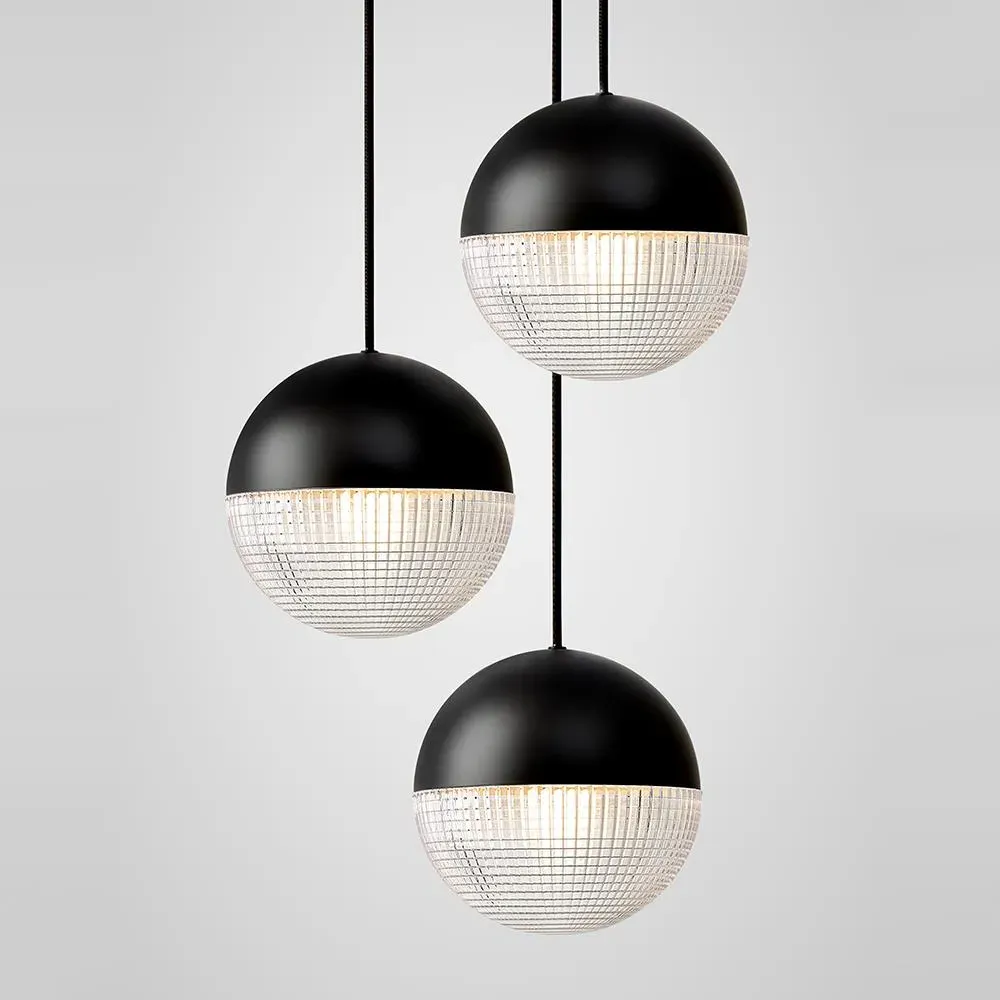 The pendant light combines solid metal casing with transparent cross-cut lens detailing. Its telescopic lens design emits soft deflected light, while the matte black finish adds contemporary appeal. The fixture demonstrates horizontal and vertical light refractions through its dual-material construction.