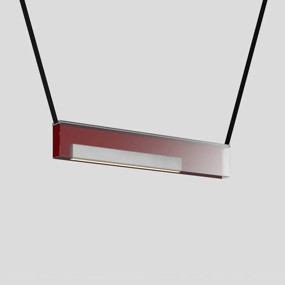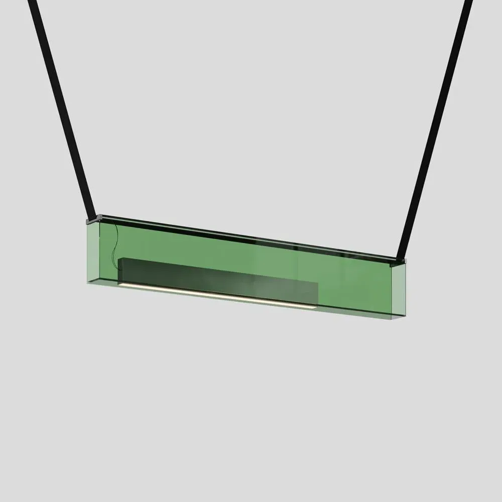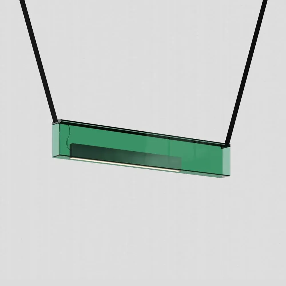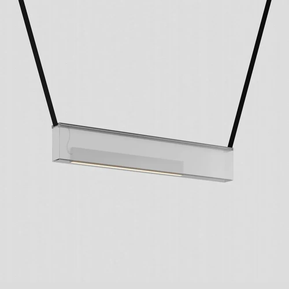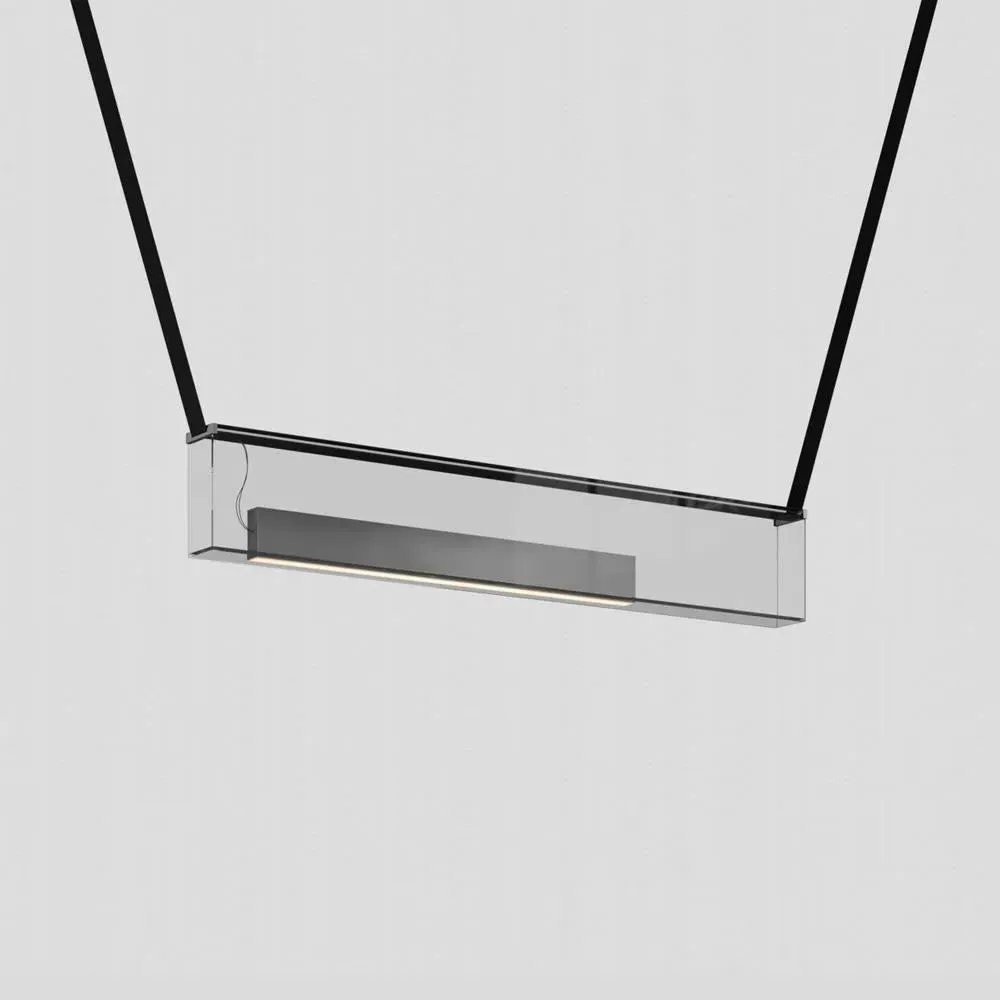 The pendant light features lightweight glass construction with an integrated aluminium box that casts directional illumination. Its transparent glass housing allows for versatile light distribution, while the suspended design accommodates various ceiling heights and angles. The minimalist construction suits both standalone installations and series arrangements, and the durable materials ensure long-lasting performance.