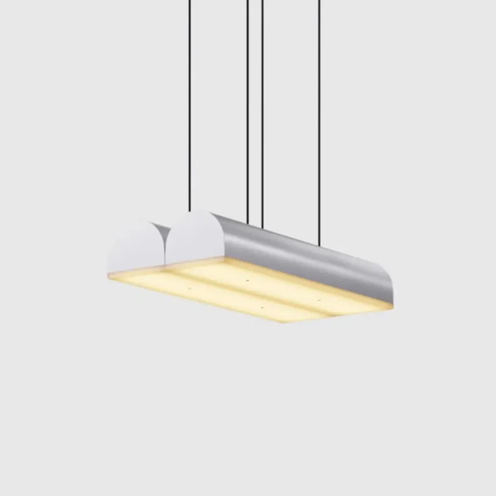 The pendant light features integrated PMMA frosted diffusers that provide ambient illumination with its quality aluminium construction. Its semi-circular body creates contrasting shapes, appearing cloud-like from one angle and rectangular from others. The design combines soft curves with hard lines, while the polyester flex suspension blends seamlessly with the overall aesthetic. The fixture can be installed individually or grouped to create architectural patterns.