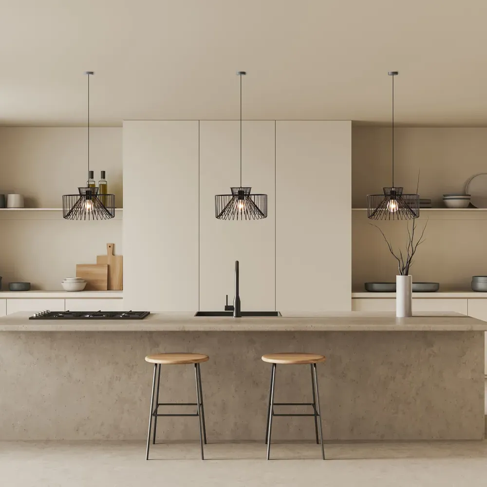 The Elandor E27 Pendant Light combines black metal framing with IP44 rating for bathroom installation. Its E27 fitting accommodates standard bulbs, while the metal construction ensures durability and longevity. The pendant can be installed individually or in groups over kitchen islands and dining areas, creating striking focal points with filament lamp pairings.