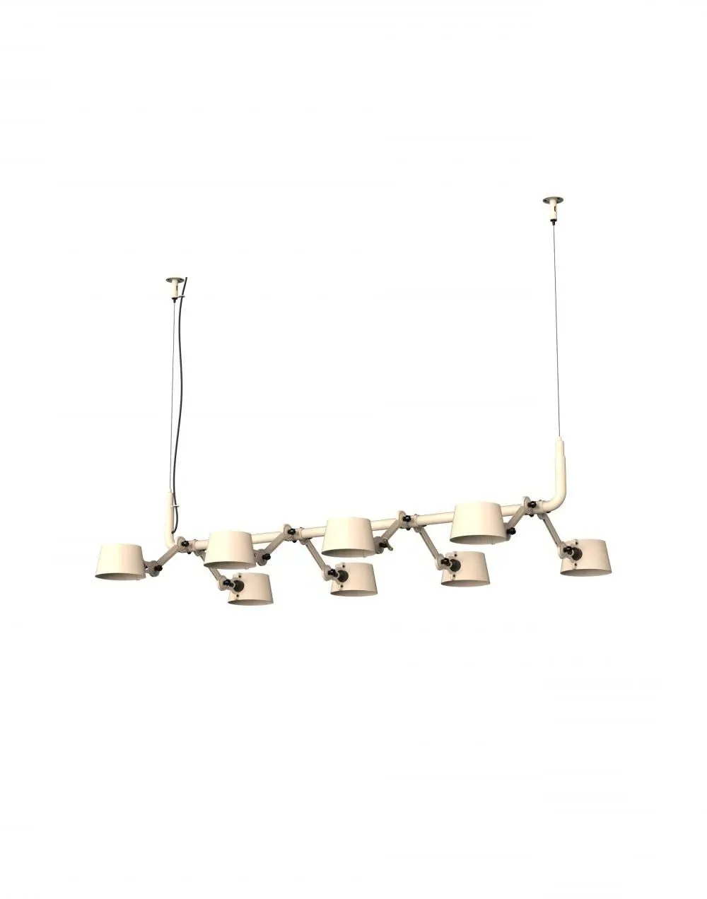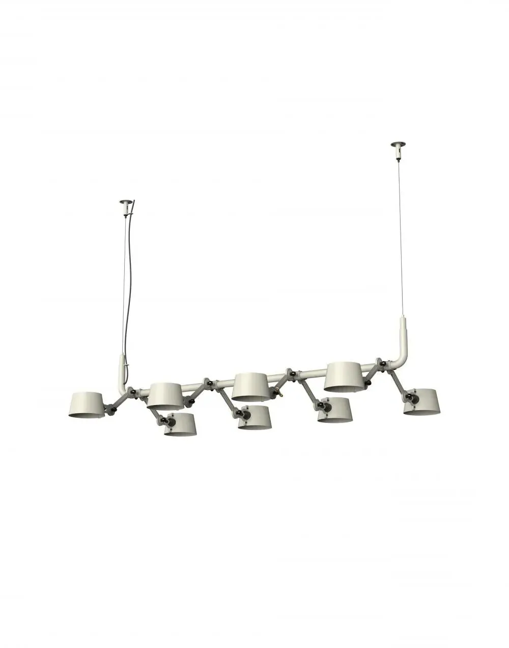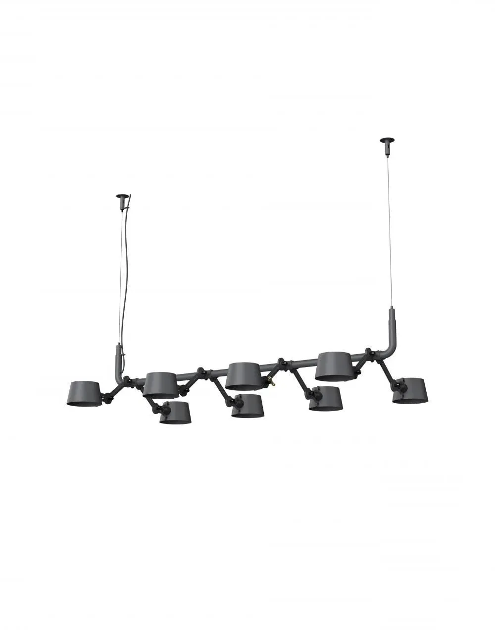 The pendant chandelier combines contemporary industrial design with solid brass accent finishes. Its eight-light configuration provides ample illumination, while the brass detailing adds warmth and sophistication. The sleek construction suits modern interiors, and the durable materials ensure long-lasting performance.