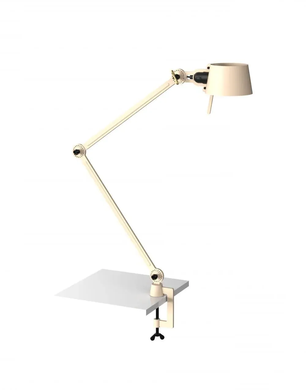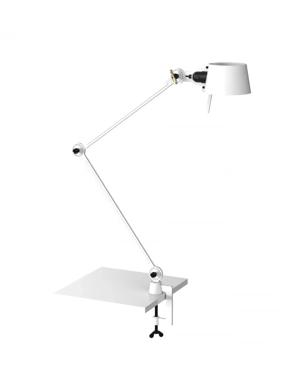 The desk lamp offers versatile positioning with its double articulated arm design, featuring solid brass accent finishes. Its clamp mechanism provides secure attachment to desk edges, while the adjustable arms allow precise light direction. The contemporary styling suits modern workspaces, and the brass hardware ensures lasting durability.