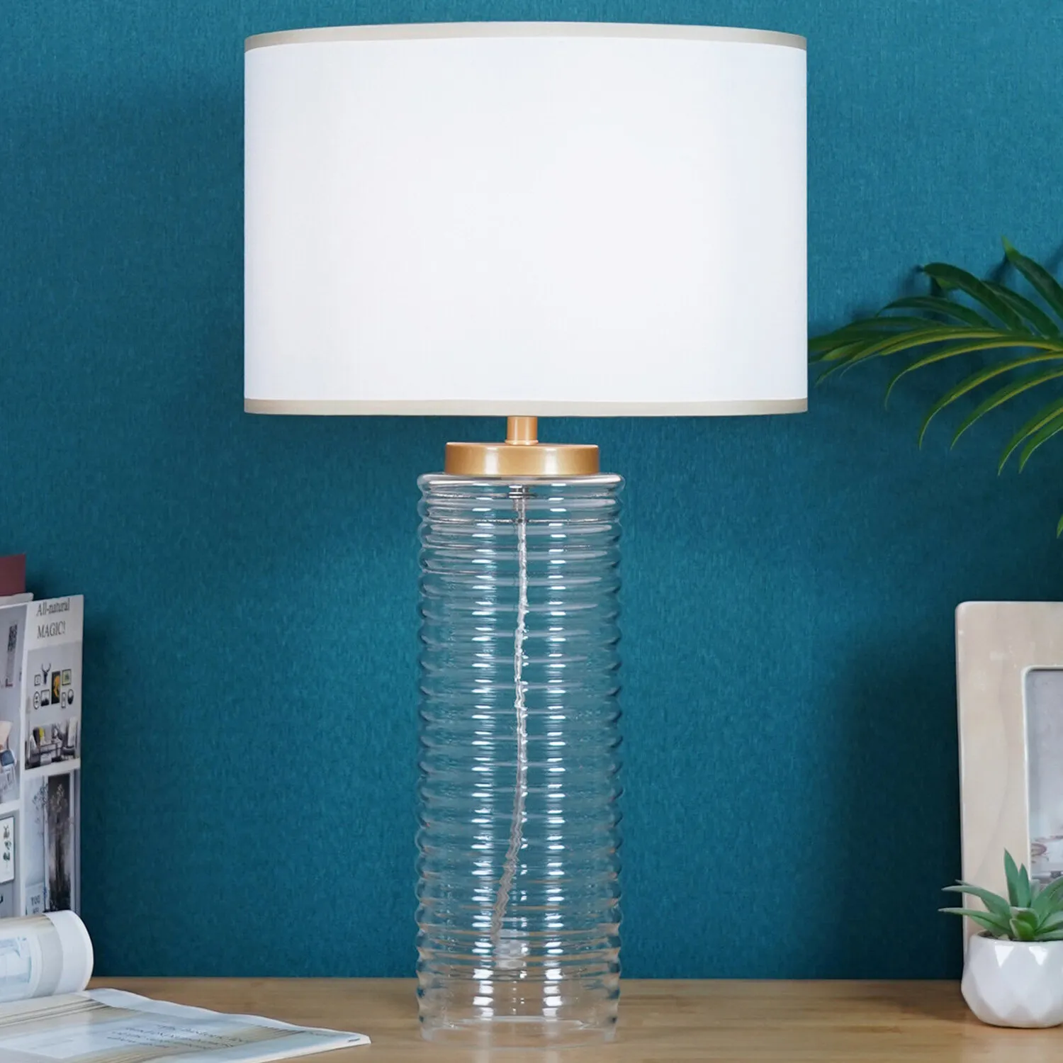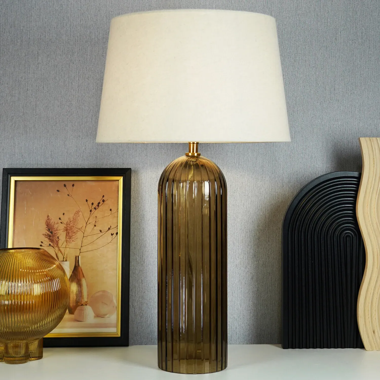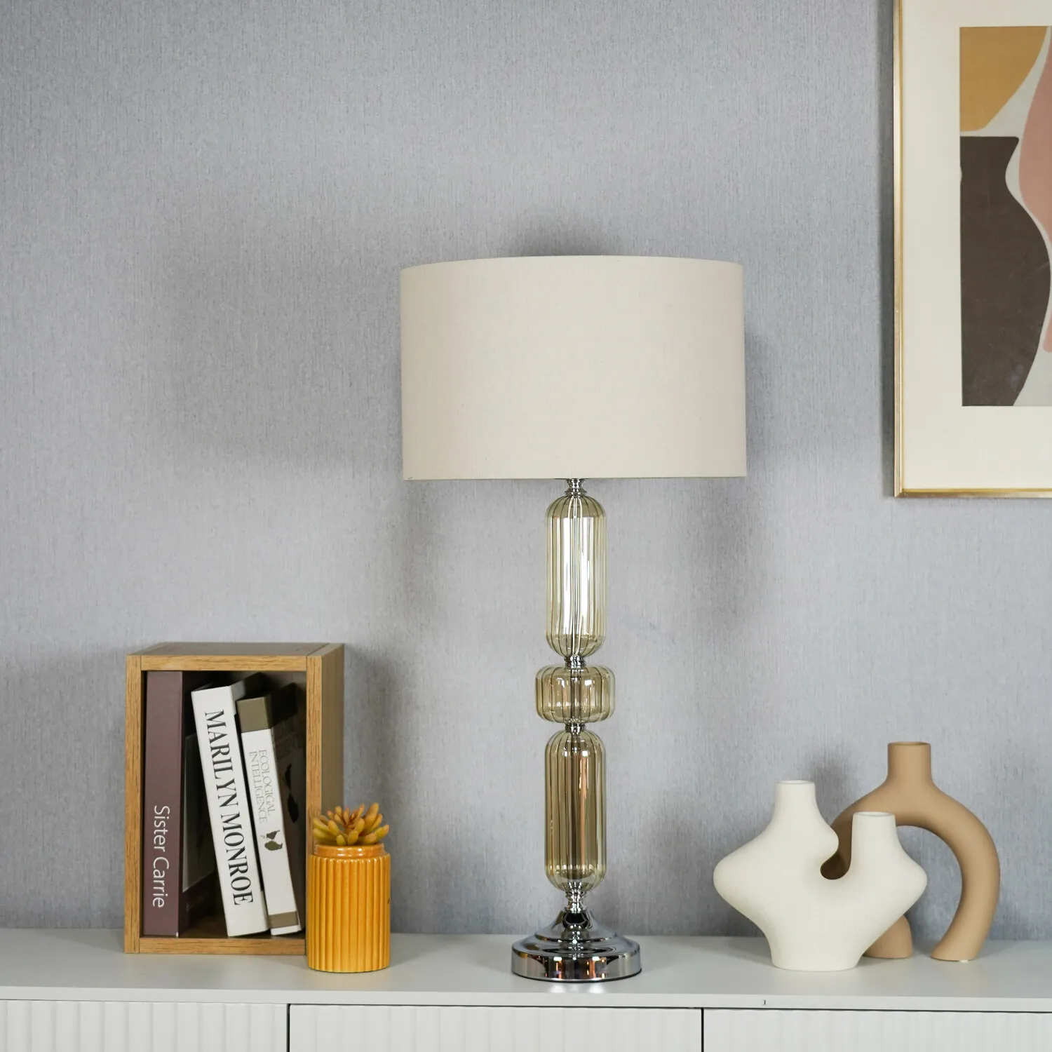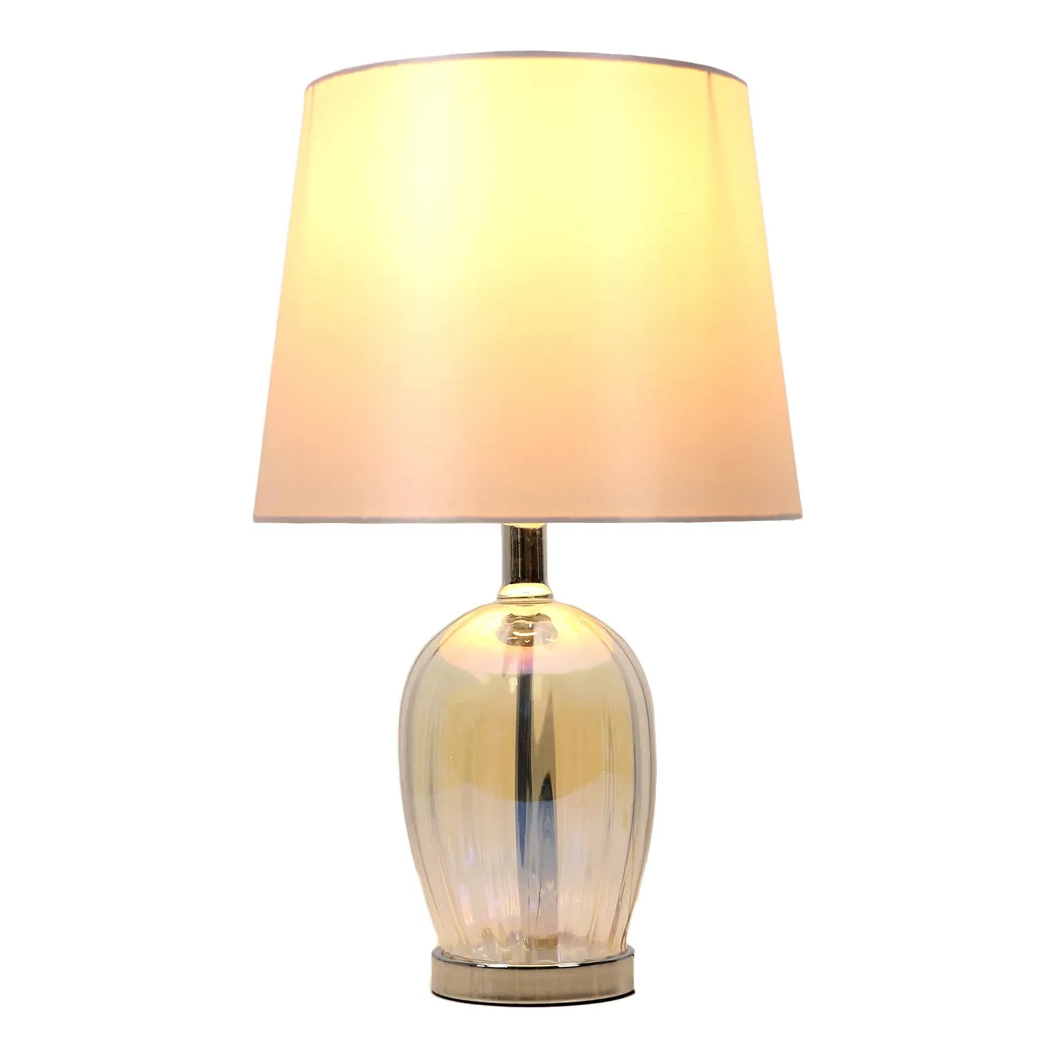 This lovely Otillie Glass Table Lamp is designed with a stylishly shaped glass cylinder shade above a beautiful silver base. When turned off, this stylish lamp takes on the appearance of a chic modern vase and illuminates with a warm and homely glow when switched on to flood your home with light. Please click here to find our range of lightbulbs.
