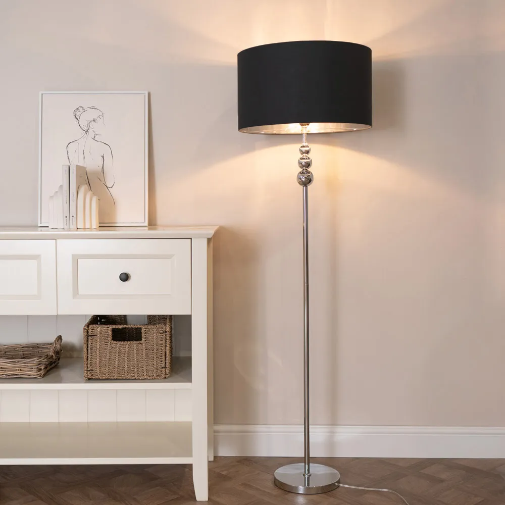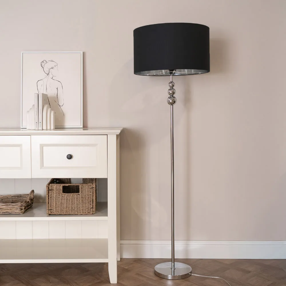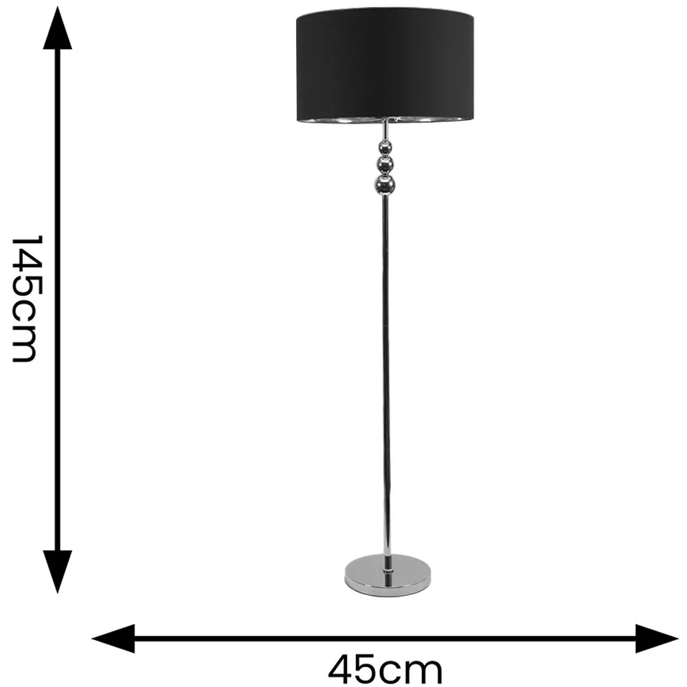 She’s beauty and she’s grace, she’ll brighten up your space. The Marissa chrome floor lamp features a chic, streamlined design with stacked globes perched at the top of its slender stem. Its effortlessly stylish vibe fits perfectly in various modern settings, whether you lean towards minimalism or an industrial aesthetic. Finished with a lampshade that’s available in either charcoal or black and boasts a chrome interior, this metal floor lamp is a space-saving gem packed with style. Dimensions - Height 145cm x Width 45cm x Depth 45cm.
