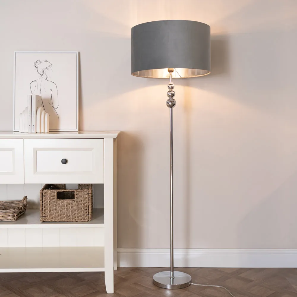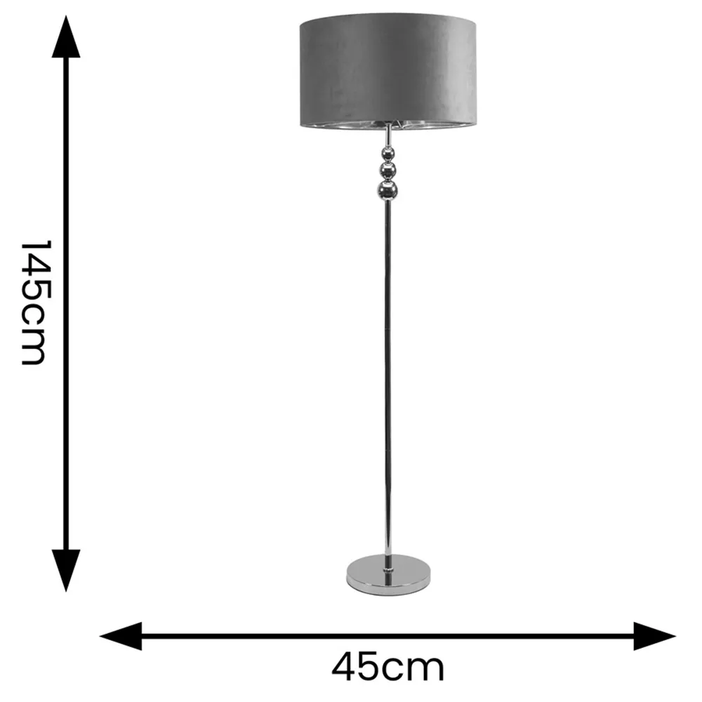 The Marissa LED floor lamp features a streamlined design with stacked chrome globes positioned at the top of its slender stem. The charcoal velvet lampshade includes a chrome interior that enhances light reflection, while the metal construction provides stability. Its compact footprint suits various spaces, and the chrome finish adds durability. W45 x D45 x H145 cm.