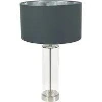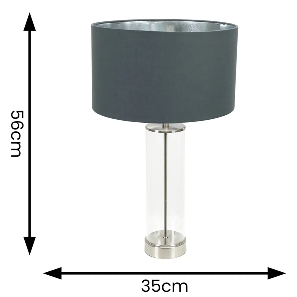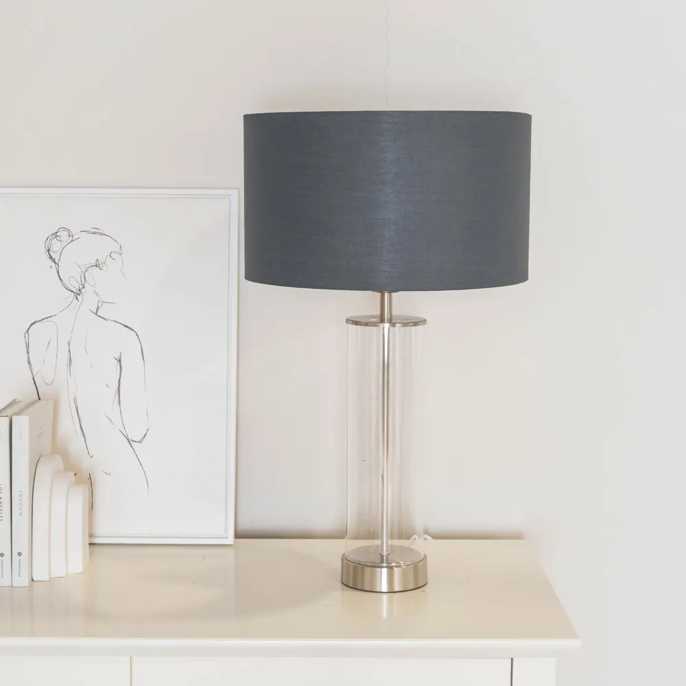 If you want to add classic charm to your home, you should check out the Balan glass table lamp with its sleek brushed chrome trim. This lamp boasts a timeless design with a vintage vibe, thanks to its clear tube base and brushed chrome finish. The fabric shade comes in either charcoal or black and has a shiny chrome interior that really makes your space pop. Whether you're looking for a stylish bedside lamp or something to light up a cosy corner in your living room, this lamp is a great choice. Dimensions - Height 56cm x Width 35cm x Depth 35cm