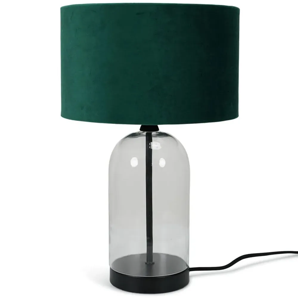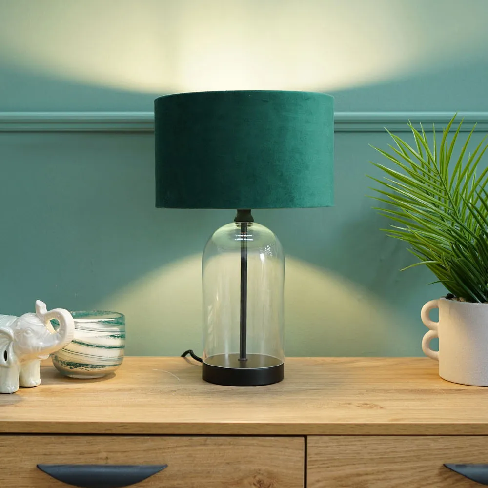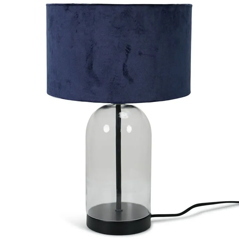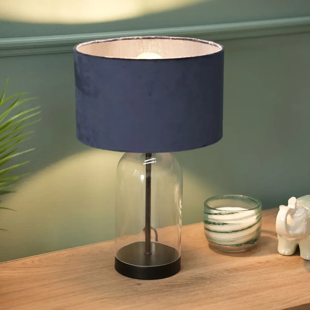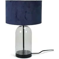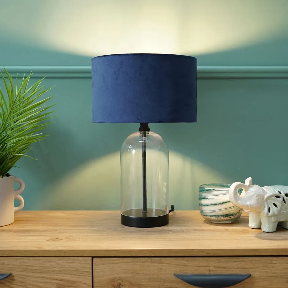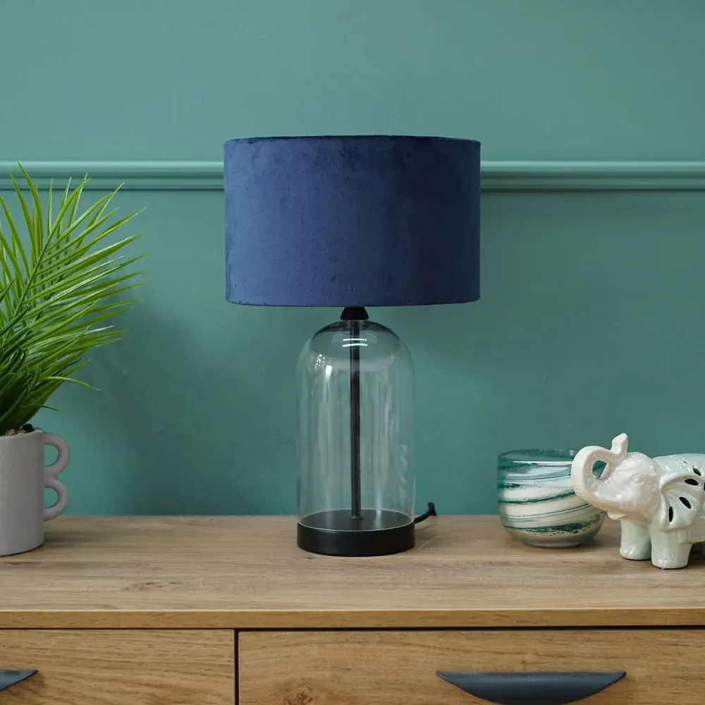 The Jessy Glass Table Lamp combines a clear glass base with gold trim finishing and navy blue velvet drum shade. Its glass construction provides durability while the gold accents add warmth and sophistication. The velvet shade offers soft ambient lighting, and the glass base ensures stability on any surface.