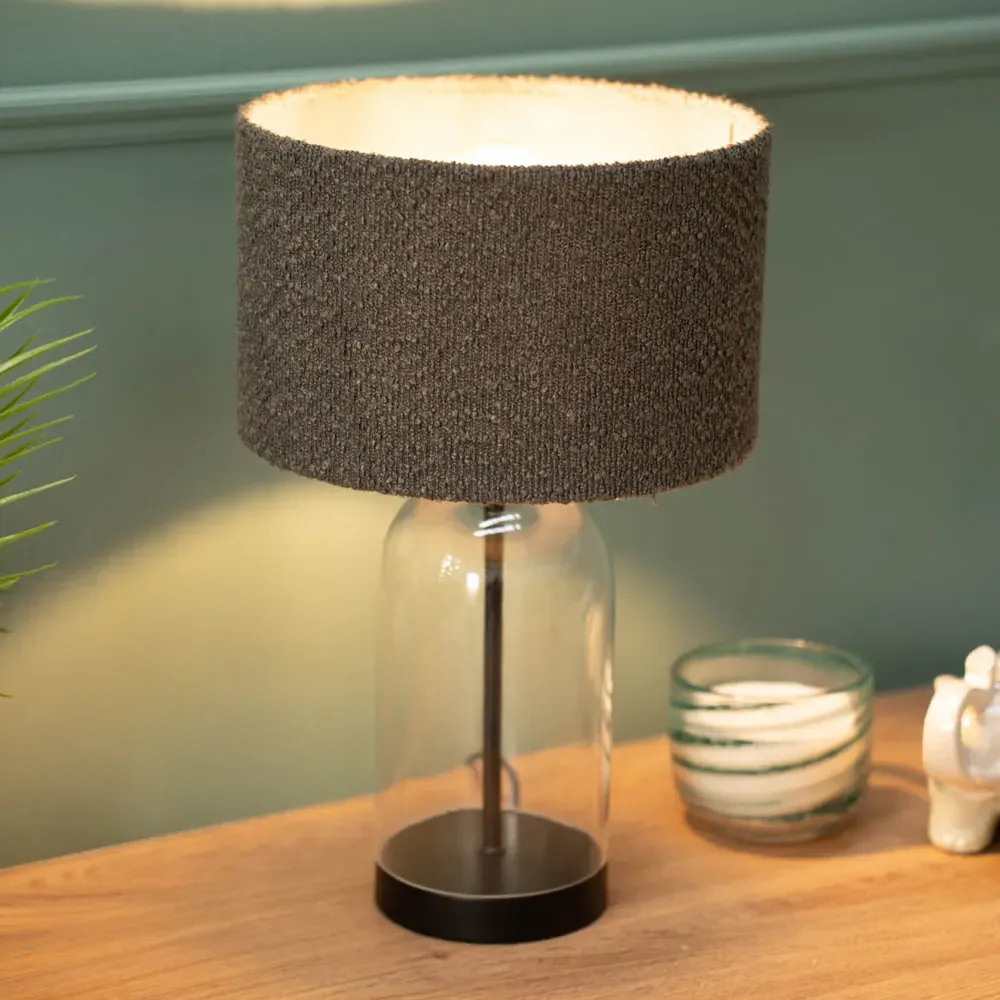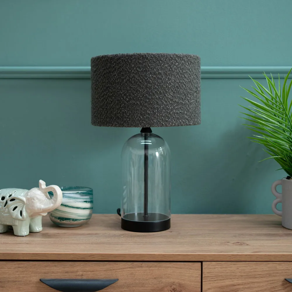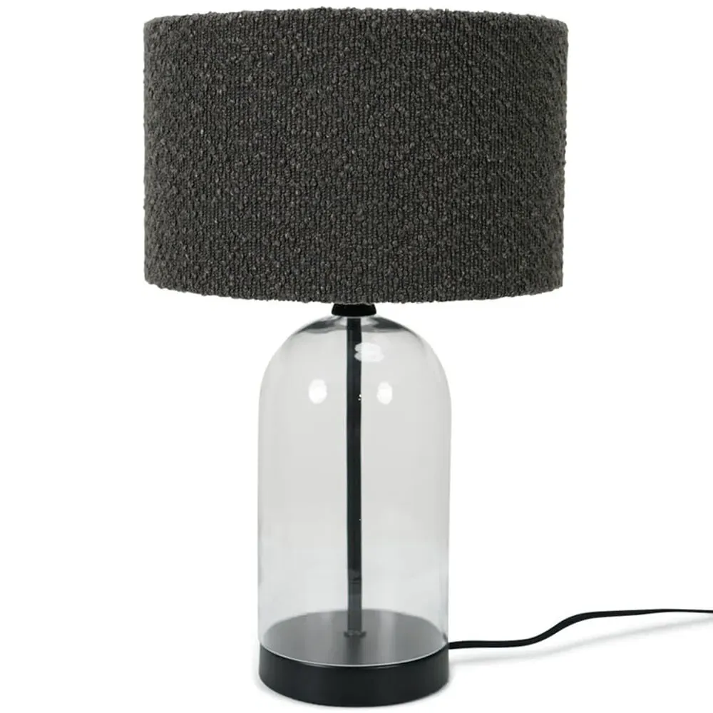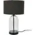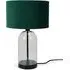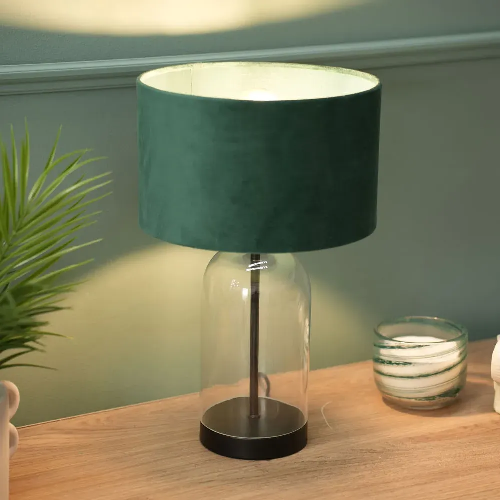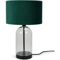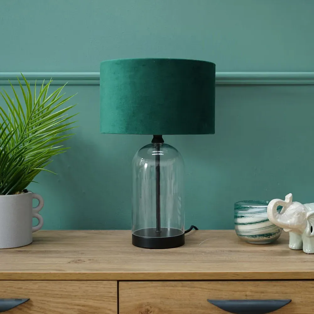 The Jessy Glass Table Lamp combines a clear glass base with gold trim finishing and navy blue velvet drum shade. Its glass construction provides durability while the gold accents add warmth and sophistication. The velvet shade offers soft ambient lighting, and the glass base ensures stability on any surface.