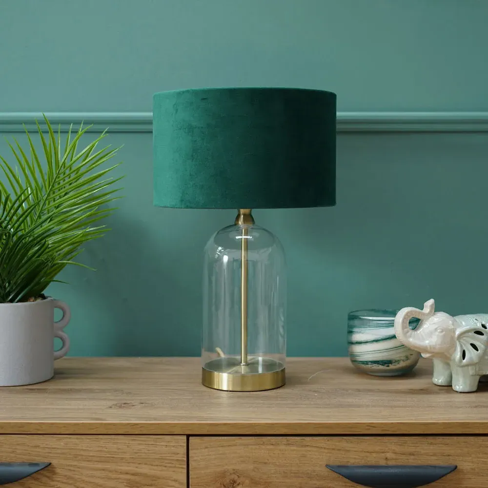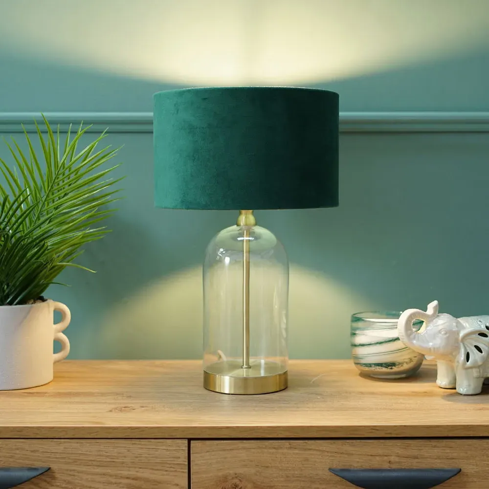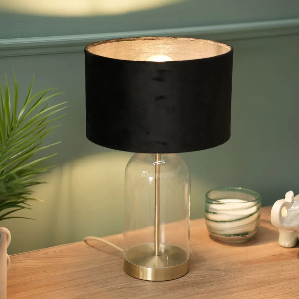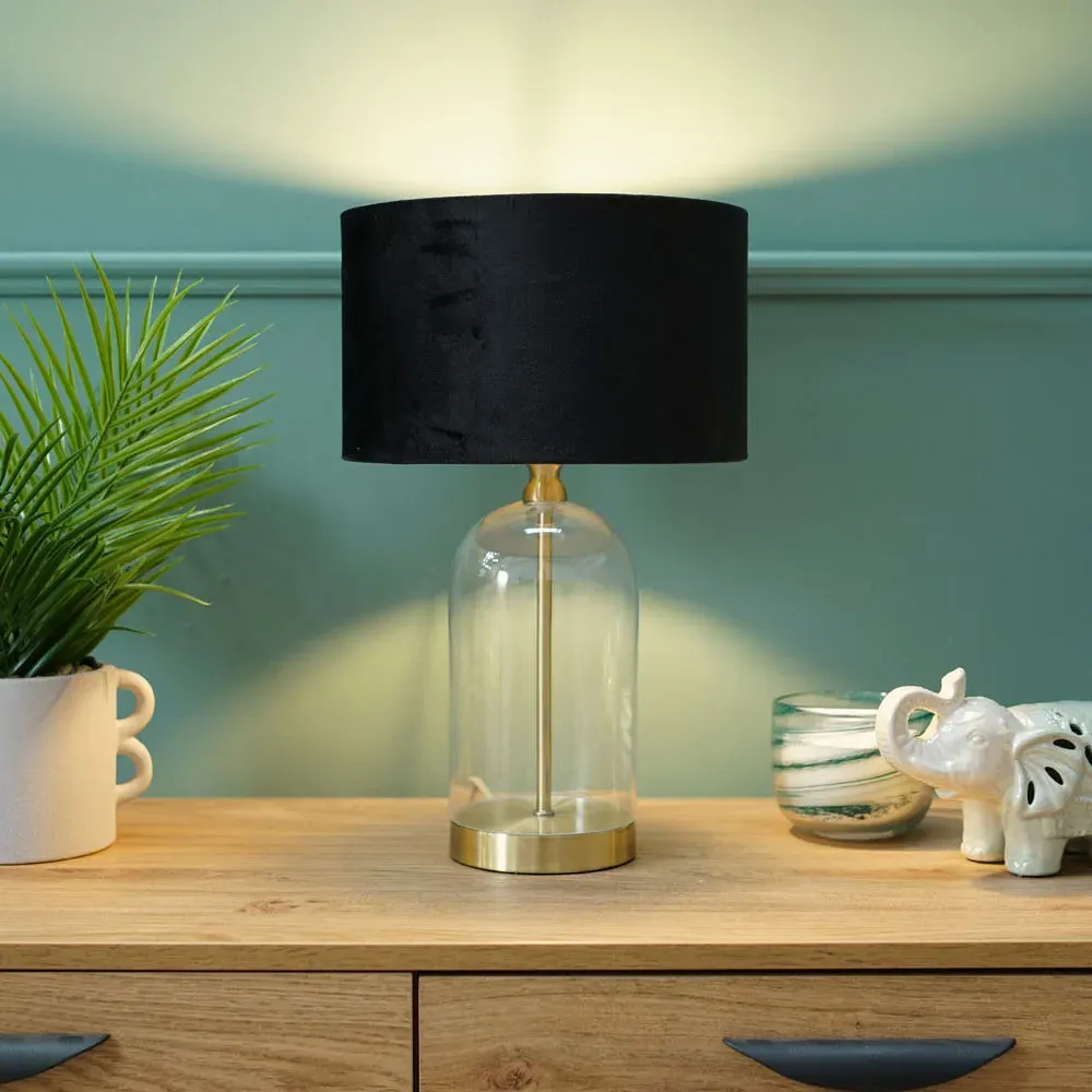 Add a timeless addition to your home with this stunning table lamp base, made of clear glass with gold trim finishing. Featuring a glass base with a simple, modern design that complements any décor. Whether your style is a vintage, or sleek and minimalist, this lamp will fit perfectly into any room in your home. Paired with navy blue velvet drum lamp shade for the perfect finish.