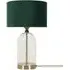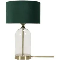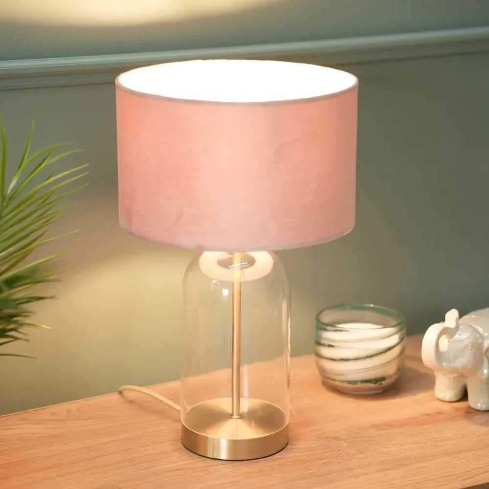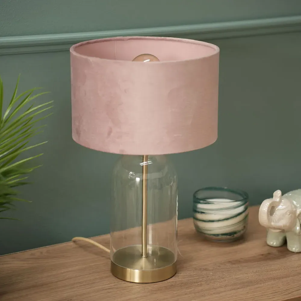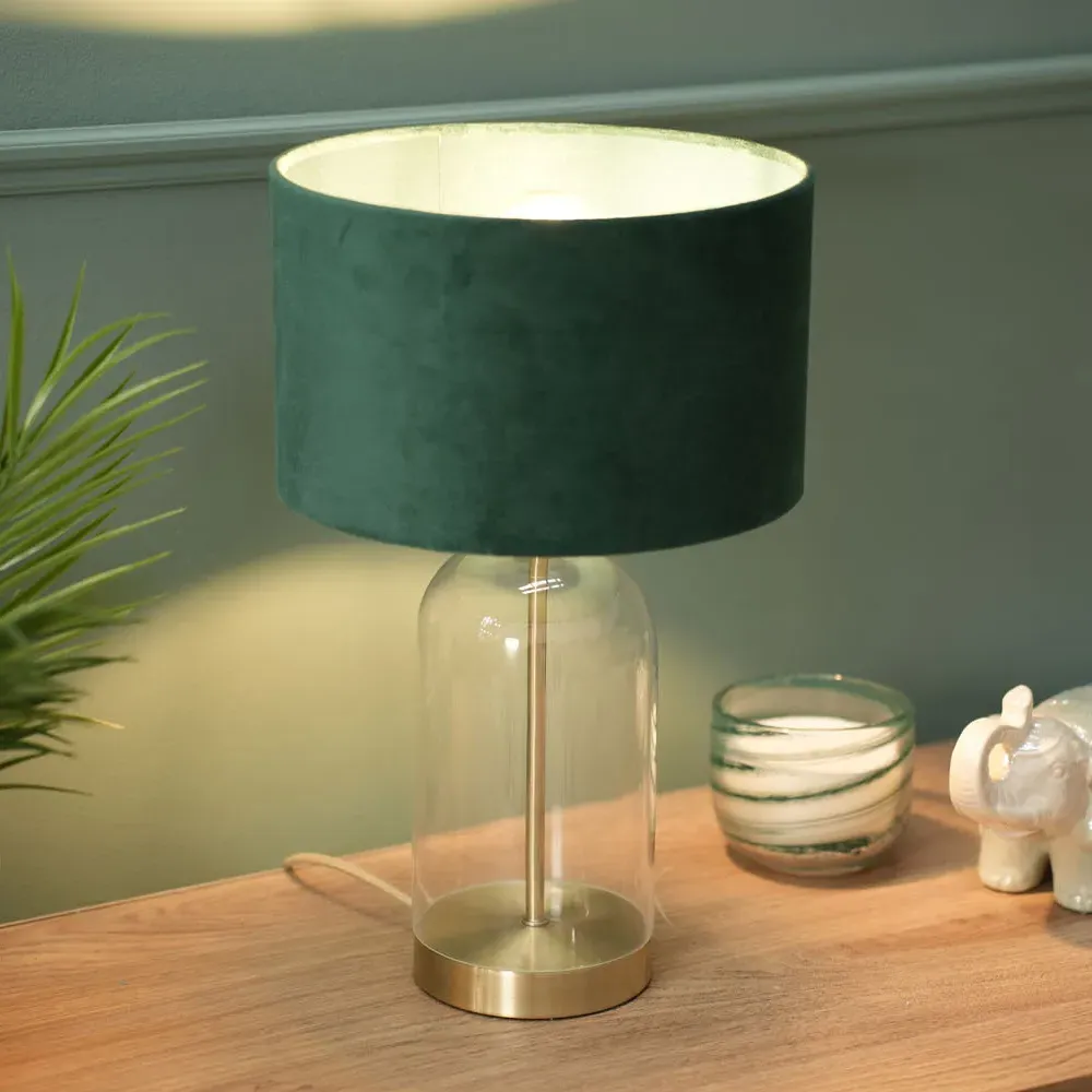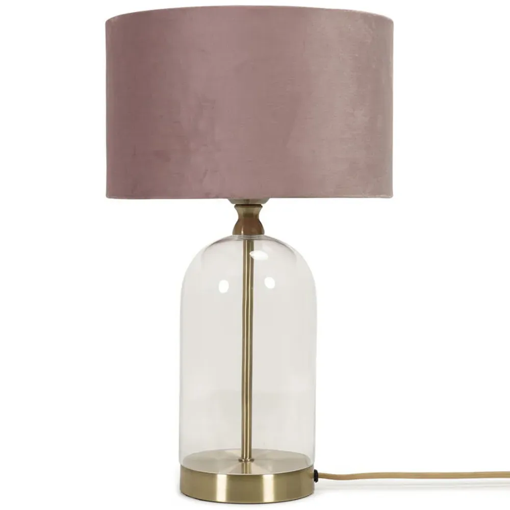 Add a timeless addition to your home with this stunning table lamp base, made of clear glass with gold trim finishing. Featuring a glass base with a simple, modern design that complements any décor. Whether your style is a vintage, or sleek and minimalist, this lamp will fit perfectly into any room in your home. Paired with navy blue velvet drum lamp shade for the perfect finish.