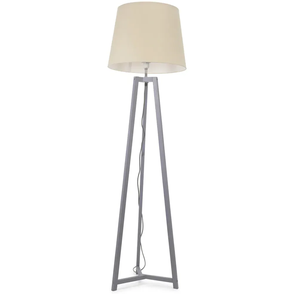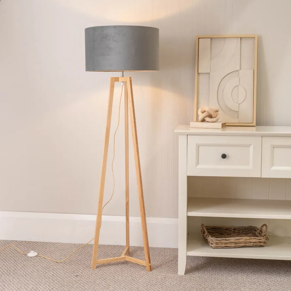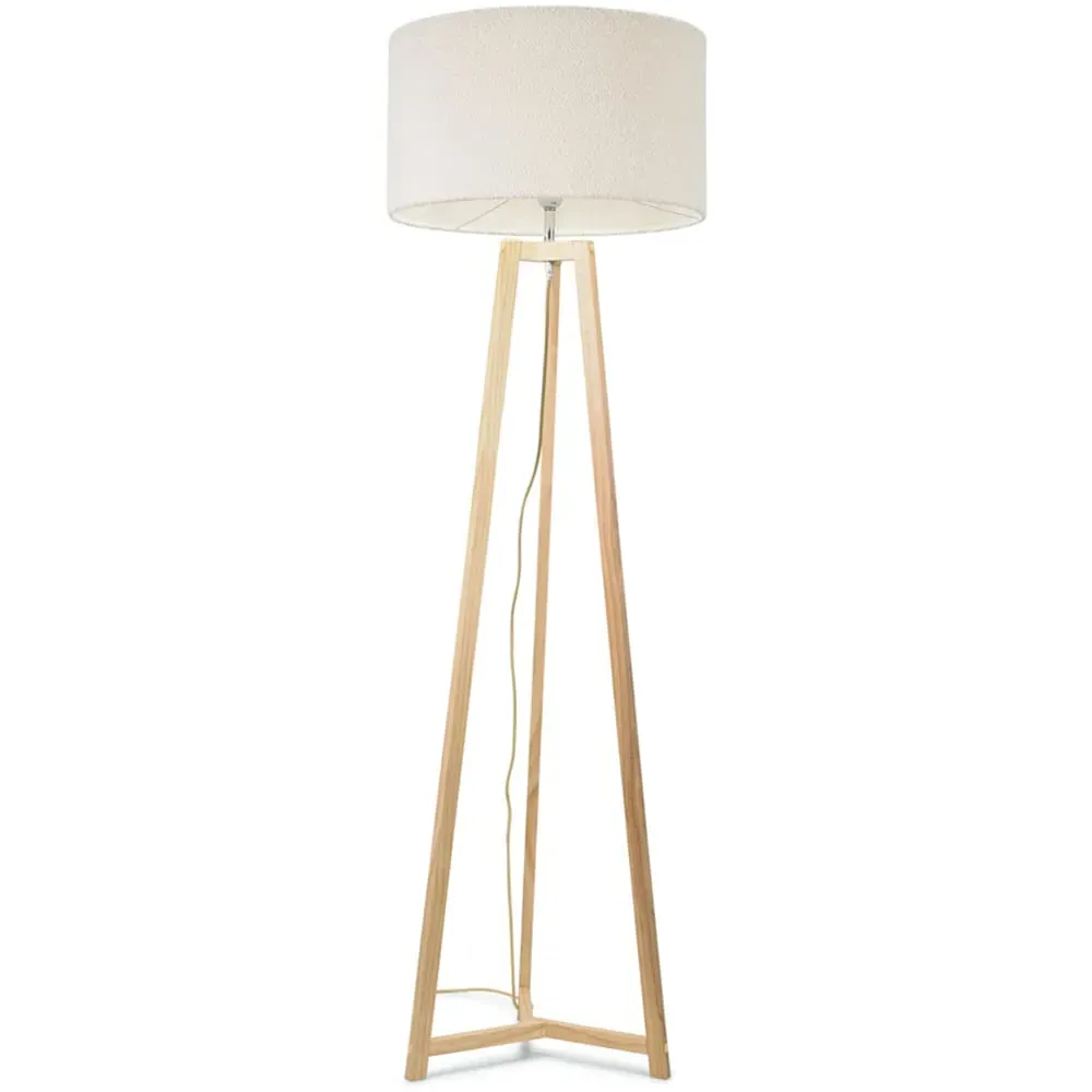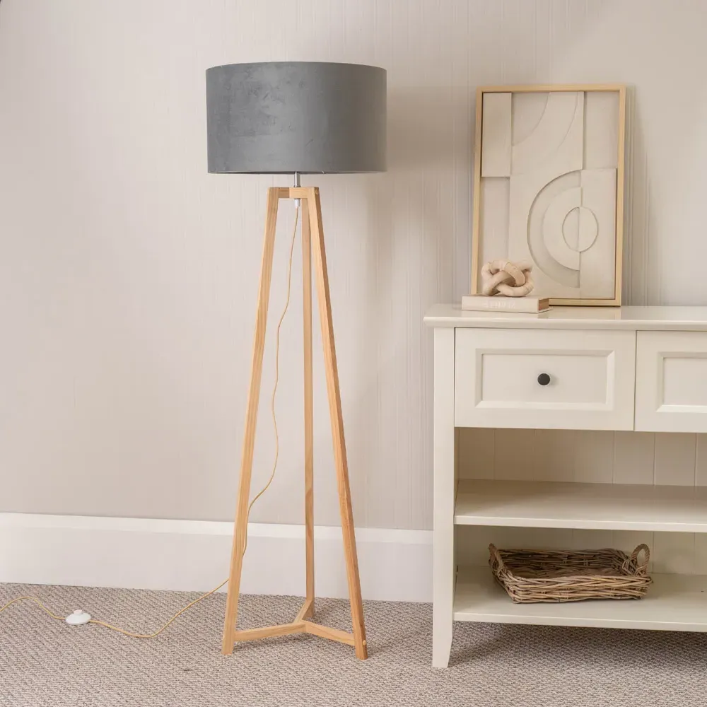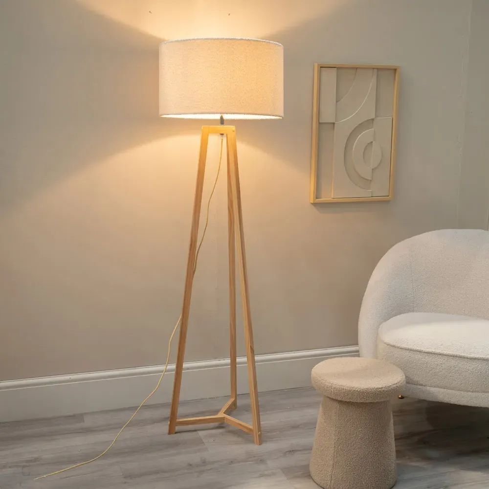 The Lottie Tripod Floor Lamp combines a natural wood base with a beige fabric tapered shade. The tapered design creates visual interest while the wooden tripod provides a stable foundation. The neutral tones offer versatile styling options.