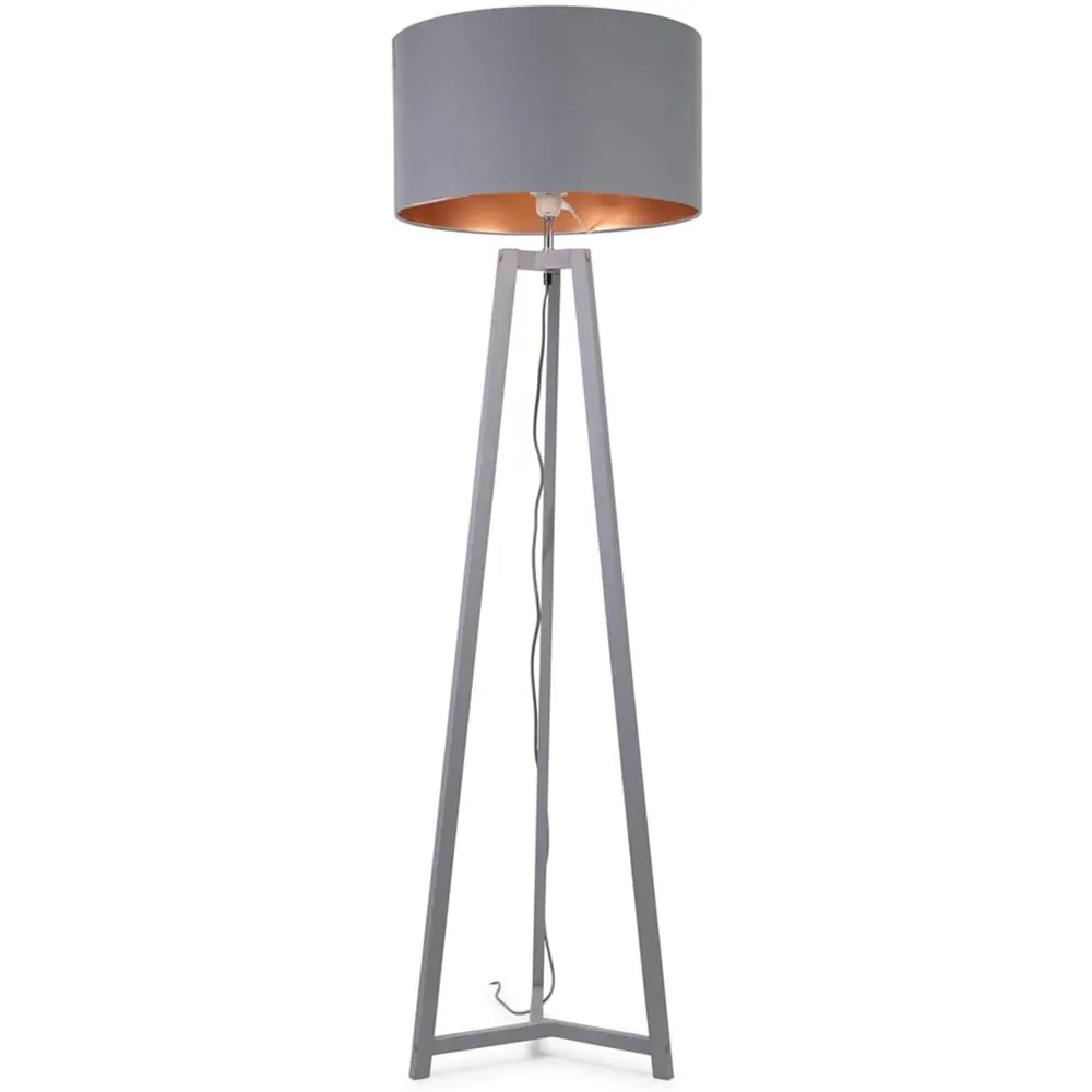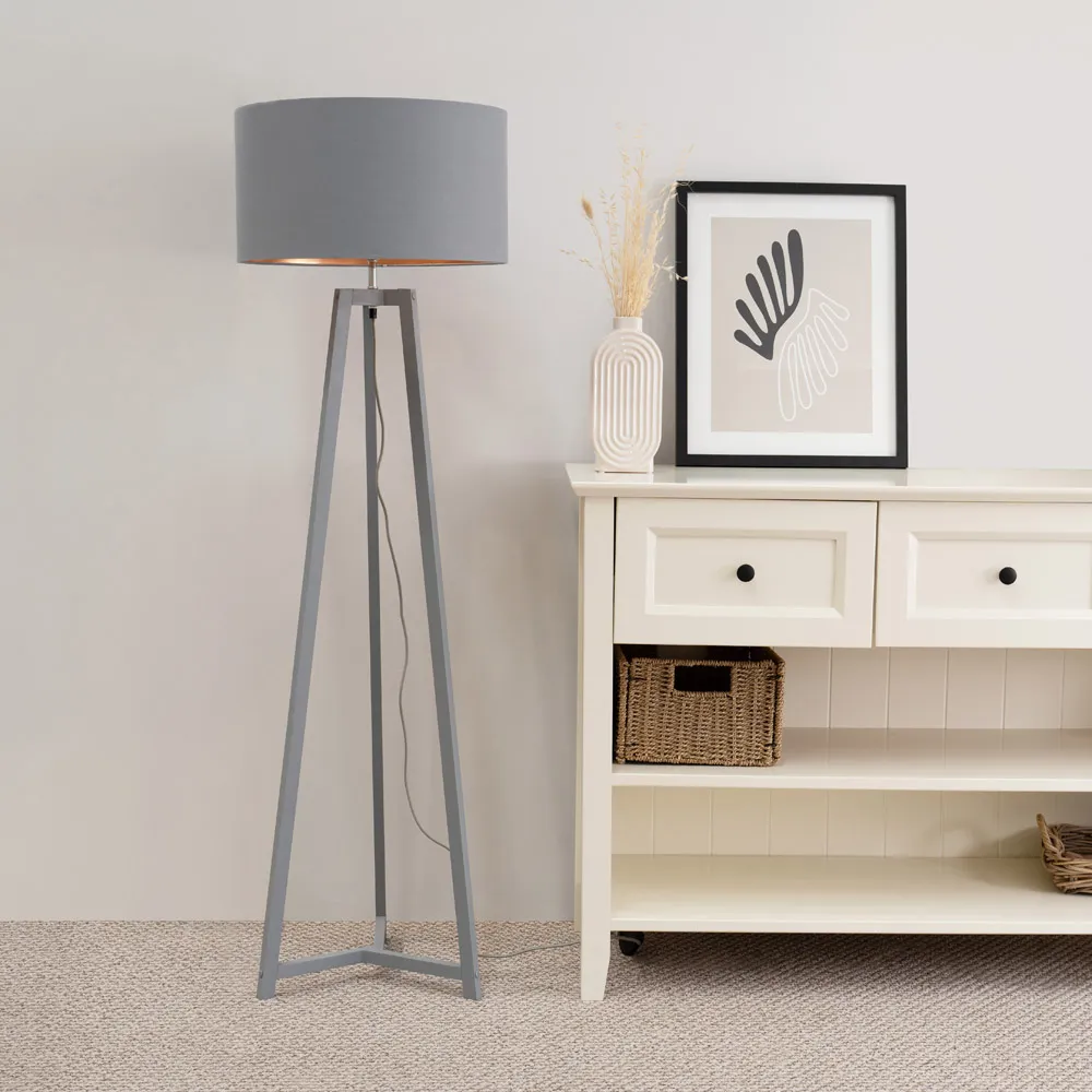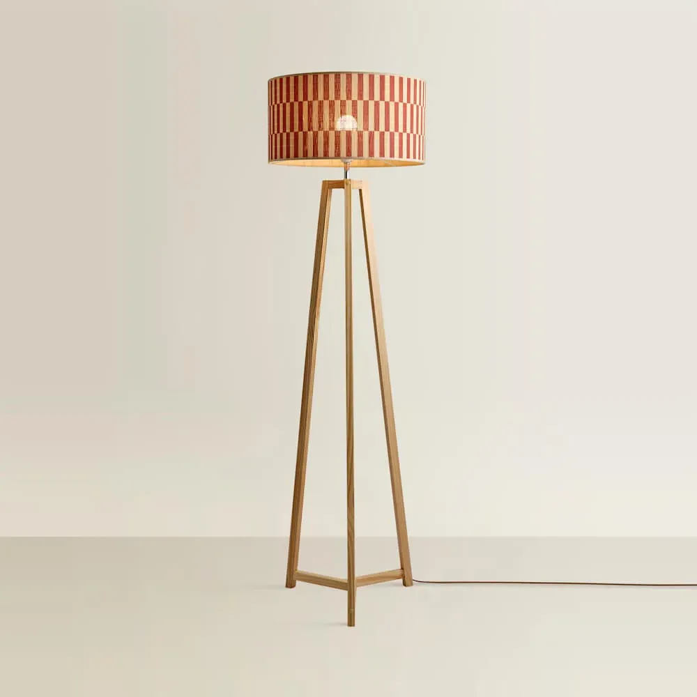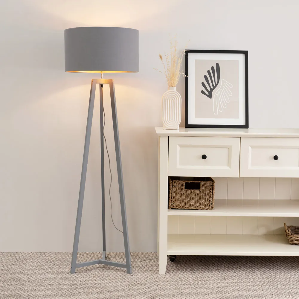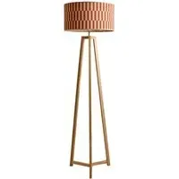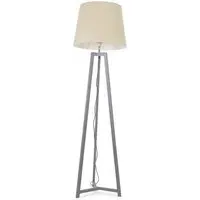 The Lottie Tripod Floor Lamp combines a natural wood base with a beige fabric tapered shade. The tapered design creates visual interest while the wooden tripod provides a stable foundation. The neutral tones offer versatile styling options.