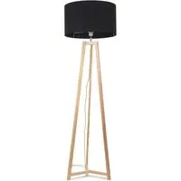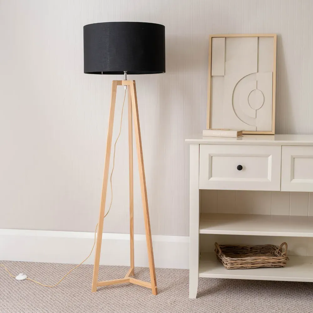 The Lottie tripod floor lamp in natural wood is the perfect neutral base for this black fabric tapered shade. The natural wood base adds a chic and modern feel to any home.