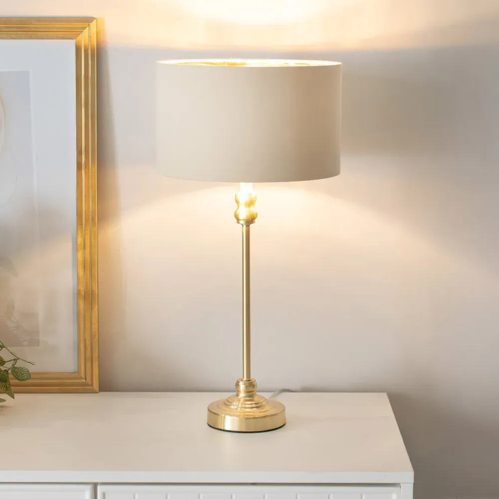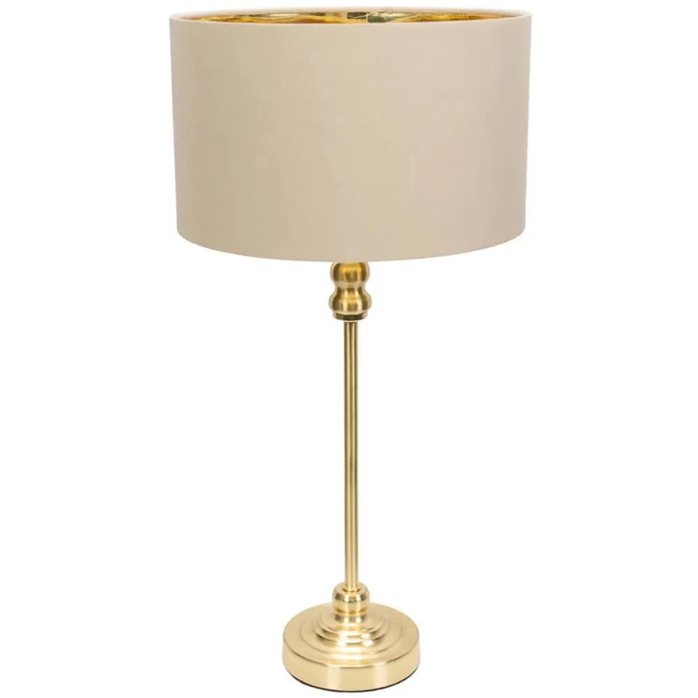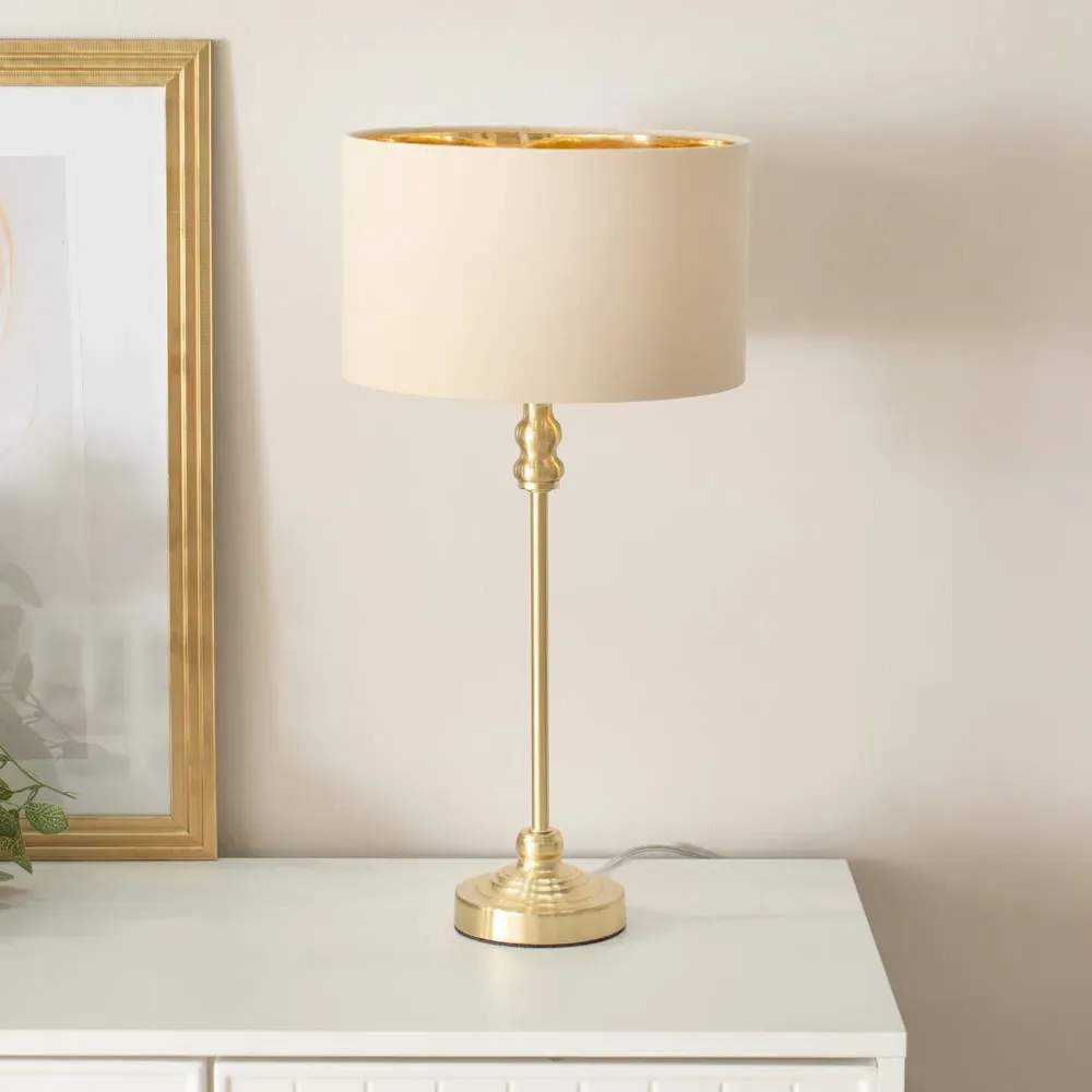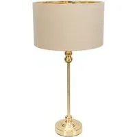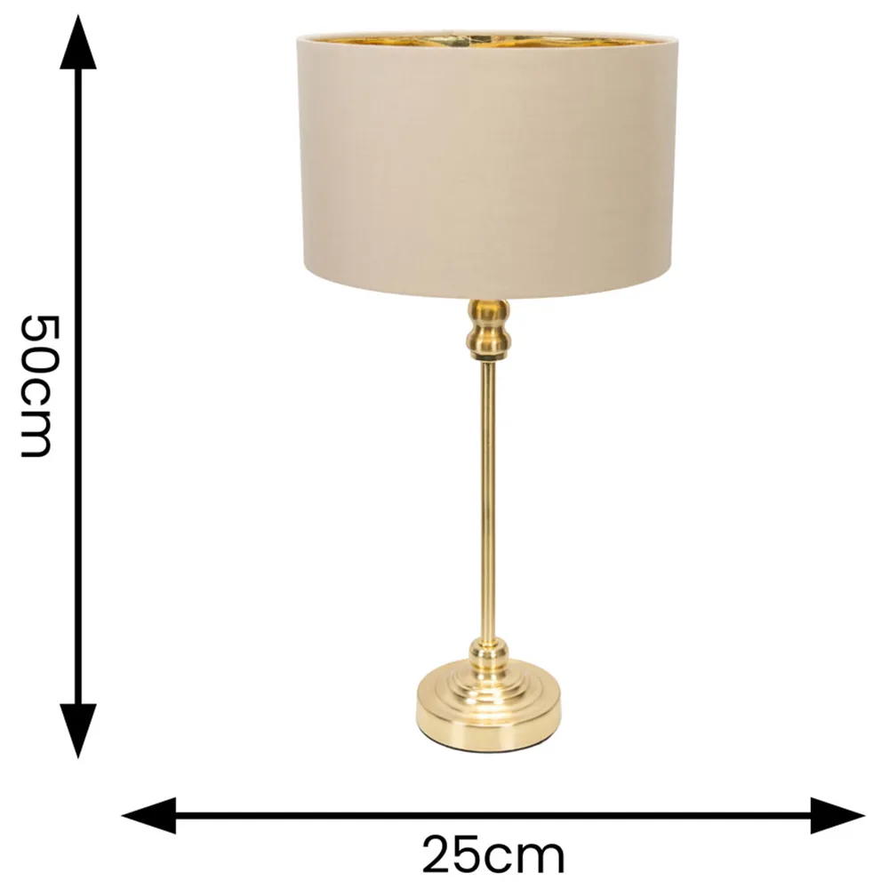 Bring a touch of glamour to your interior with the ValueLights Maggie Natural and Gold Drum Shade Candlestick LED Table Lamp. Featuring a luxurious, slim gold base, this table lamp is designed for tighter spaces, making it an ideal addition to any room. The natural fabric drum shade adds a touch of elegance while softly diffusing the light to create a warm and inviting ambience. Equipped with an energy-efficient LED bulb, it is ready for immediate use. For added peace of mind, it includes a 12-month warranty, making it a reliable choice for any home. Dimensions: H50 x W25 x D25cm.
