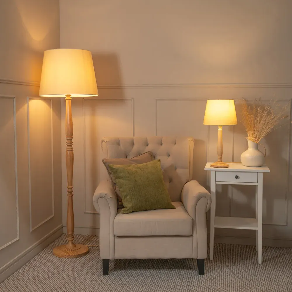 The Victoria LED Table Lamp combines a light wood candlestick stem with a beige fabric tapered shade. Its wooden construction provides durability and warmth, while the LED technology offers energy-efficient lighting. The tapered shade design creates focused illumination, and the stable base ensures reliable support for everyday use.
