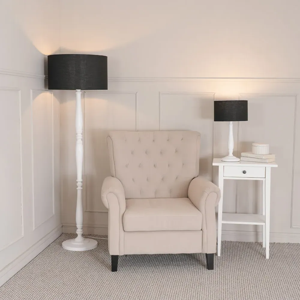 The Victoria table lamp offers compact lighting with its candlestick-style stem and drum-shaped black fabric shade. Its grey wood construction provides durability while the LED technology ensures energy efficiency. The drum shade distributes light evenly, and the wooden base maintains stability.