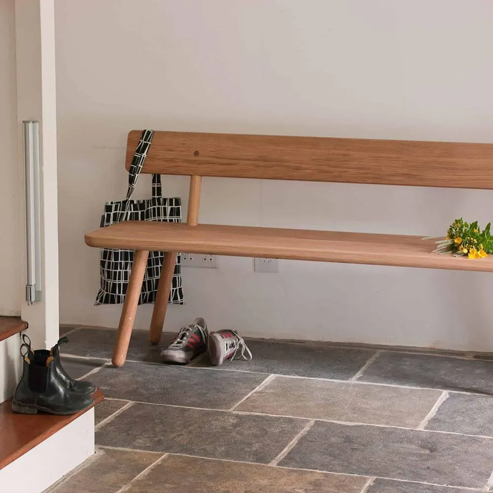 Bench Back One is an exceptionally good-looking piece of furniture. As an evolution of our popular Bench One it includes the addition of a back rest and a deeper seat, making it extremely comfortable. The back rest displays the craft-inspired peg detail that characterises Series One whilst the turned legs are attached using our screw leg system. For dimensions refer to the technical drawing below.