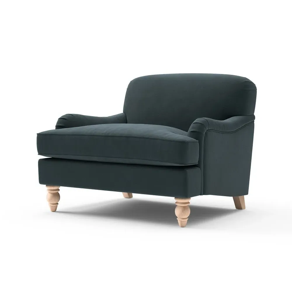 The Love Seat offers comfort with its neatly tailored sprung back, featuring gentle curves from the arm detail to hand-turned feet. Its sophisticated shape provides excellent support, while the luxurious velvet upholstery adds softness and durability. The sprung back construction ensures lasting comfort, and the hand-turned feet deliver stability with visual appeal.
