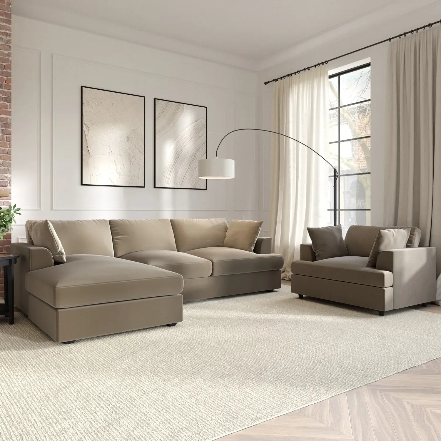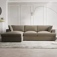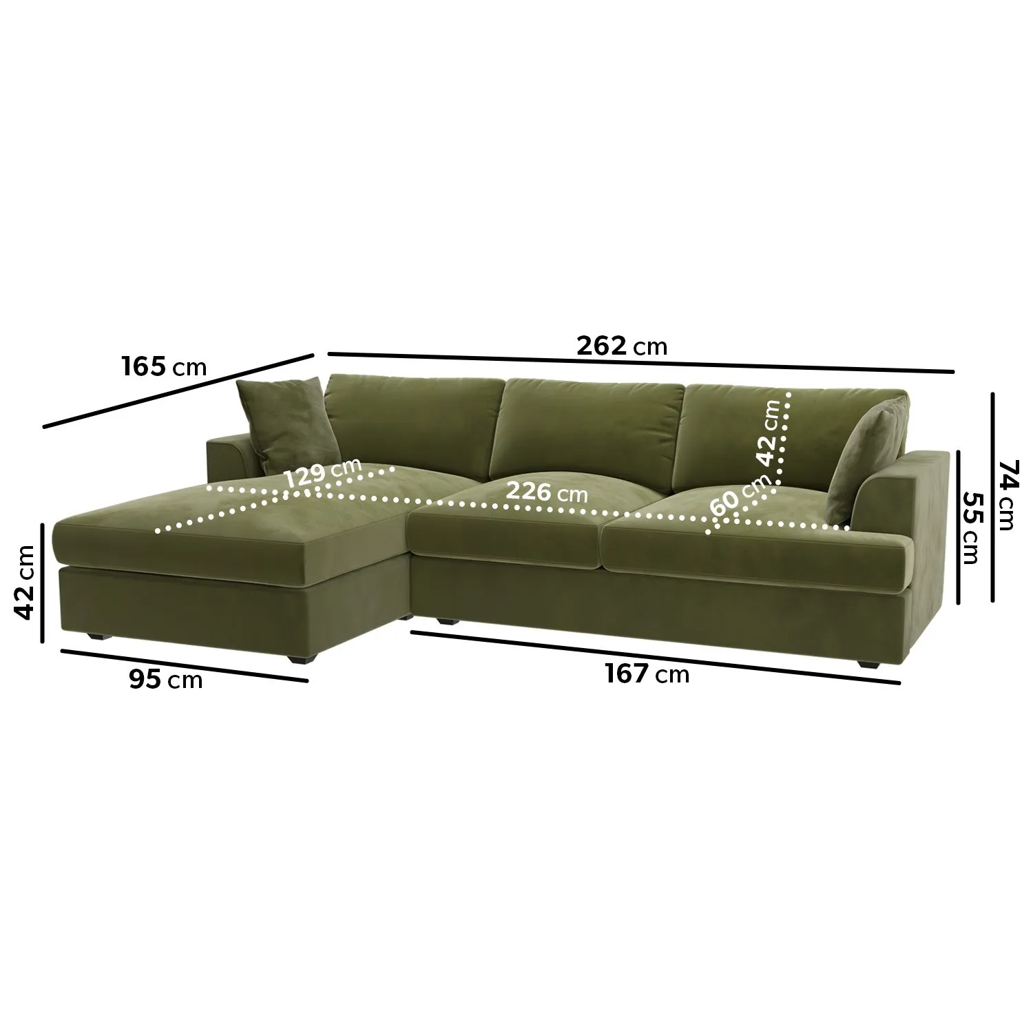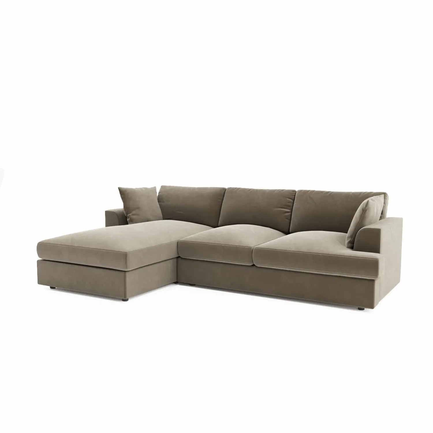 Features we love Luxuriously soft mink velvet L-shaped sofaClean lines create a beautiful modern silhouetteDeep seat saddle arms and comfy chaise featureSeat and back cushions filled with spongey foamIncludes two matching scatter cushions All about meBeautifully crafted in a soft mink velvet the August 4 seater corner sofa brings big comfort and modern luxury to your home. With a deep chaise offering the perfect place to stretch out and relax this spacious sofa is ideal for family homes. The warming mink velvet is durable and easy to clean combined with a minimalistic silhouette that blends seamlessly with any interior style.Generously filled with foam throughout the seats August offers a great balance of comfort and support keeping you cosy during those long lounging sessions. The back and seat cushions can be removed for regular plumping and easy cleaning ensuring the August sofa keeps its looks whilst keeping you comfyNeed to know . Dimensions . W262 x D165 x H74 cm Packed dimensions . Box 1 W170 x D97 x H61 cm / Box 2 W167 x D97 x H61 cm Packed weights . Box 1 42 kg / Box 2 40 kg Seats . 4 Colour . Mink Finish . Velvet upholstery and dark wooden legs Material . Velvet (100% polyester) wooden frame Filling . Foam Assembly required . Yes – simply attach pieces together .