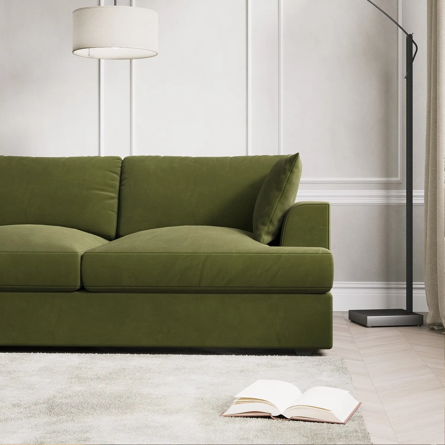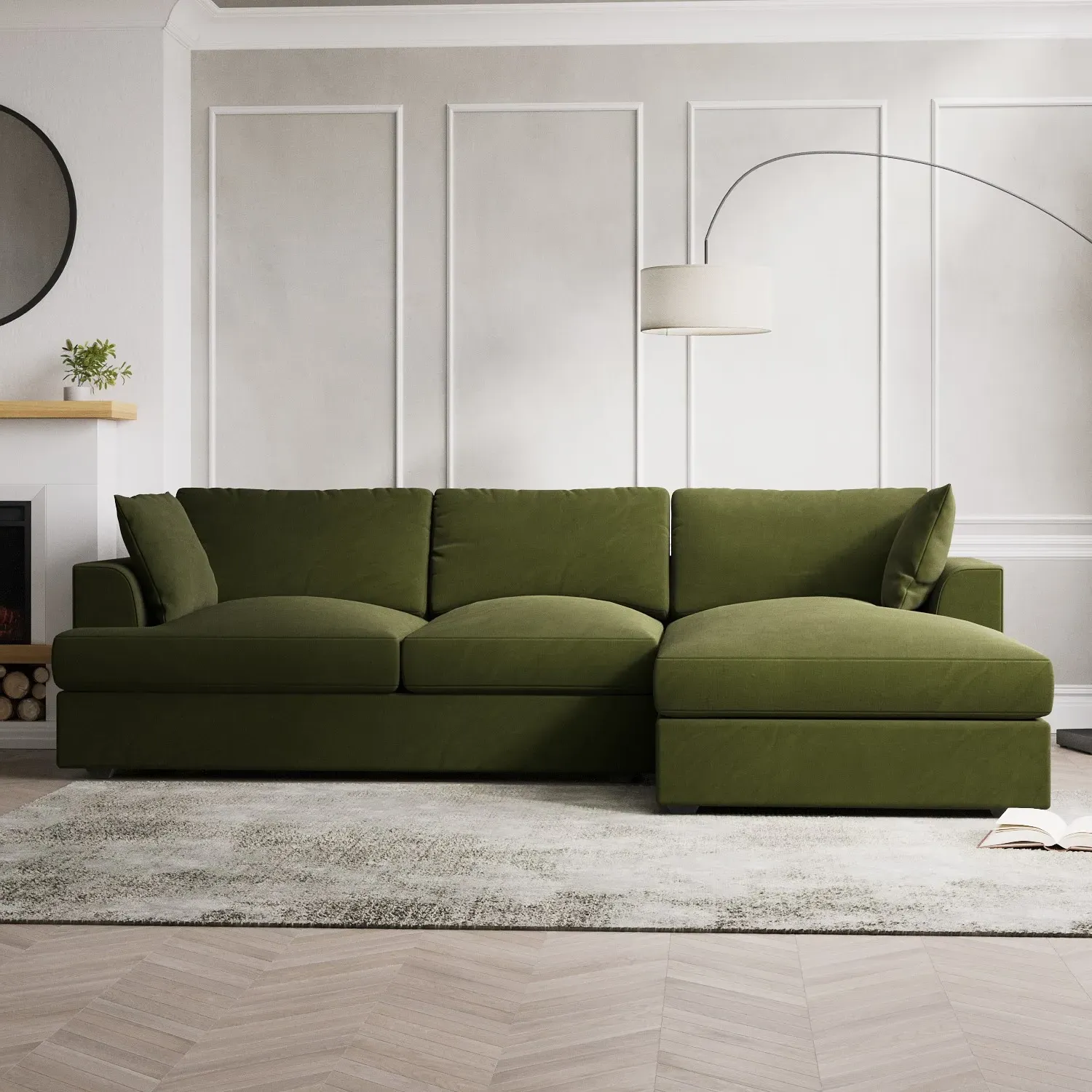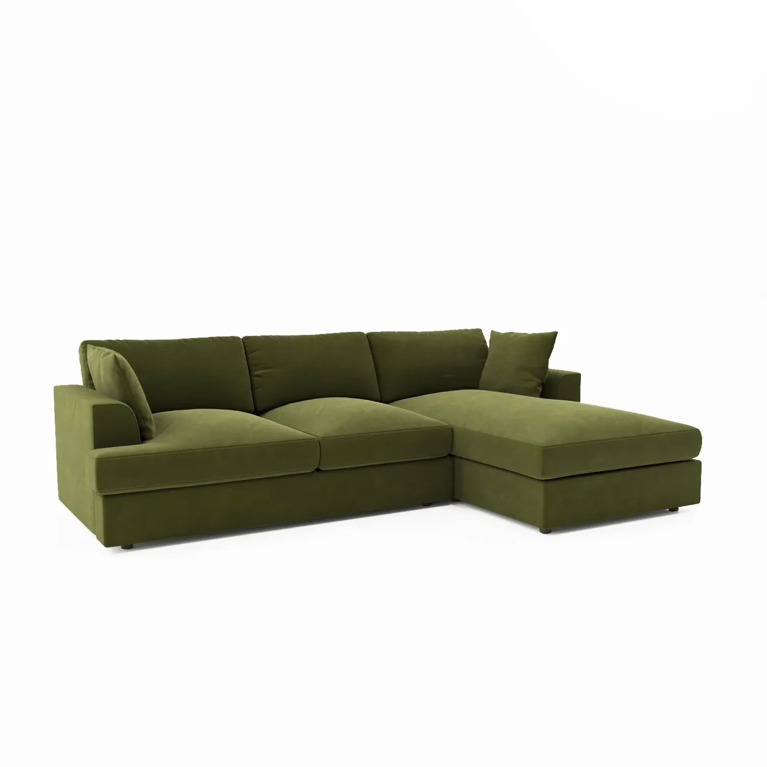 Features we love Luxuriously soft mink velvet L-shaped sofaClean lines create a beautiful modern silhouetteDeep seat saddle arms and comfy chaise featureSeat and back cushions filled with spongey foamIncludes two matching scatter cushions All about meBeautifully crafted in a soft mink velvet the August 4 seater corner sofa brings big comfort and modern luxury to your home. With a deep chaise offering the perfect place to stretch out and relax this spacious sofa is ideal for family homes. The warming mink velvet is durable and easy to clean combined with a minimalistic silhouette that blends seamlessly with any interior style.Generously filled with foam throughout the seats August offers a great balance of comfort and support keeping you cosy during those long lounging sessions. The back and seat cushions can be removed for regular plumping and easy cleaning ensuring the August sofa keeps its looks whilst keeping you comfyNeed to know . Dimensions . W262 x D165 x H74 cm Packed dimensions . Box 1 W170 x D97 x H61 cm / Box 2 W167 x D97 x H61 cm Packed weights . Box 1 42 kg / Box 2 40 kg Seats . 4 Colour . Mink Finish . Velvet upholstery and dark wooden legs Material . Velvet (100% polyester) wooden frame Filling . Foam Assembly required . Yes – simply attach pieces together .