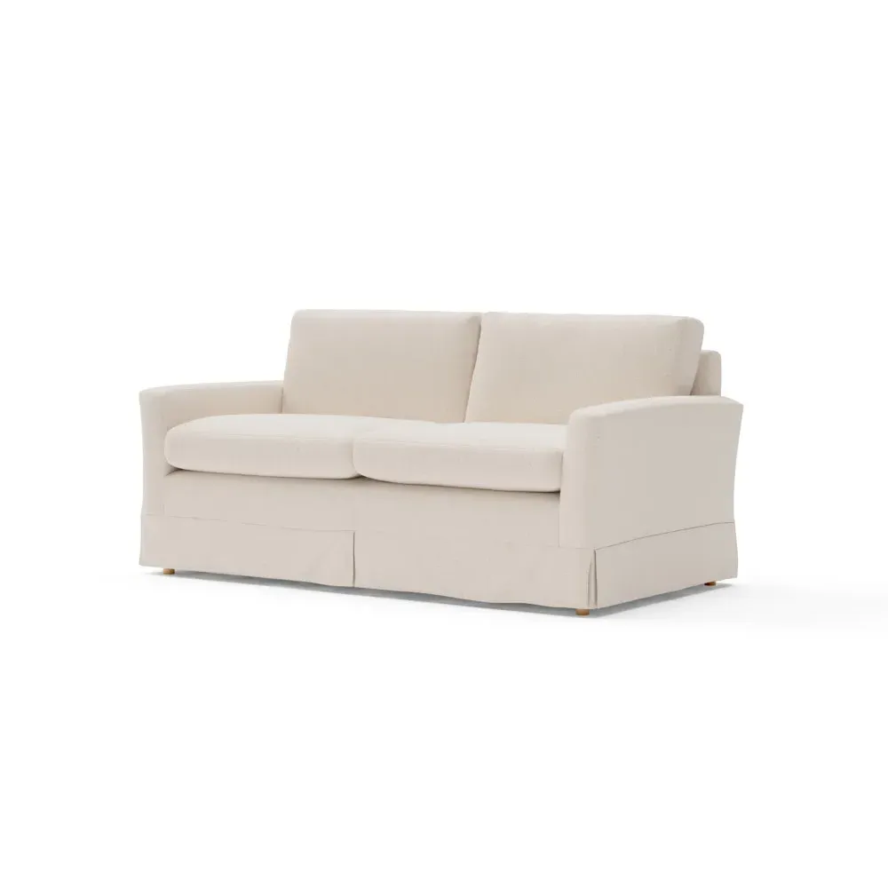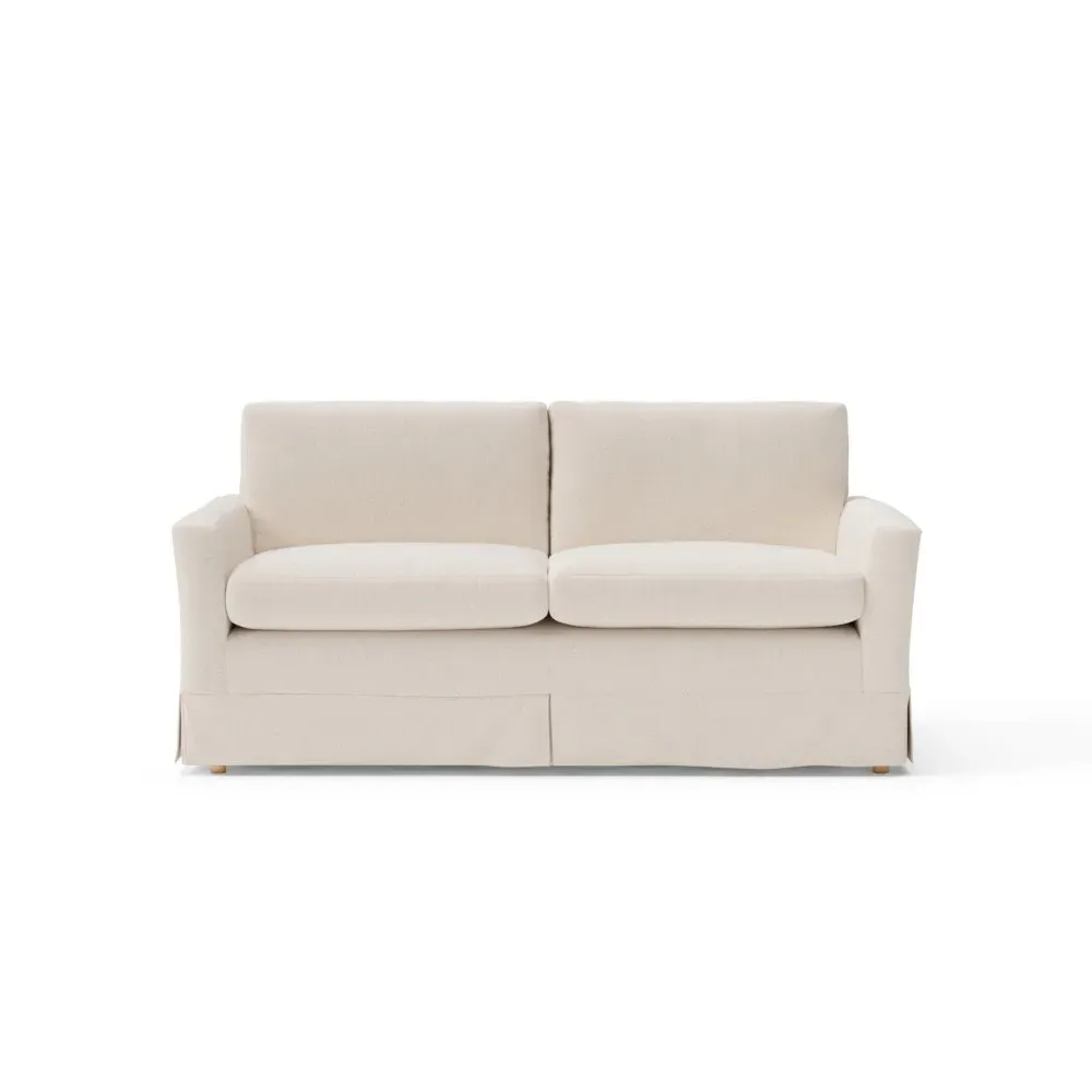 The sofa provides comfort through its slim arms and streamlined silhouette, featuring a straight back that accommodates additional cushions. Available with luxurious feather or practical low maintenance interiors, while the loose covers can be removed for easy care. The solid construction delivers reliable support for daily use.