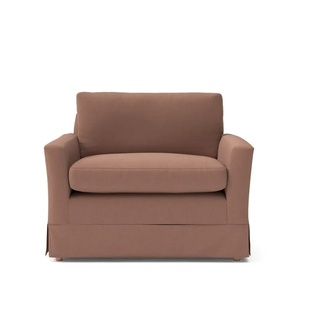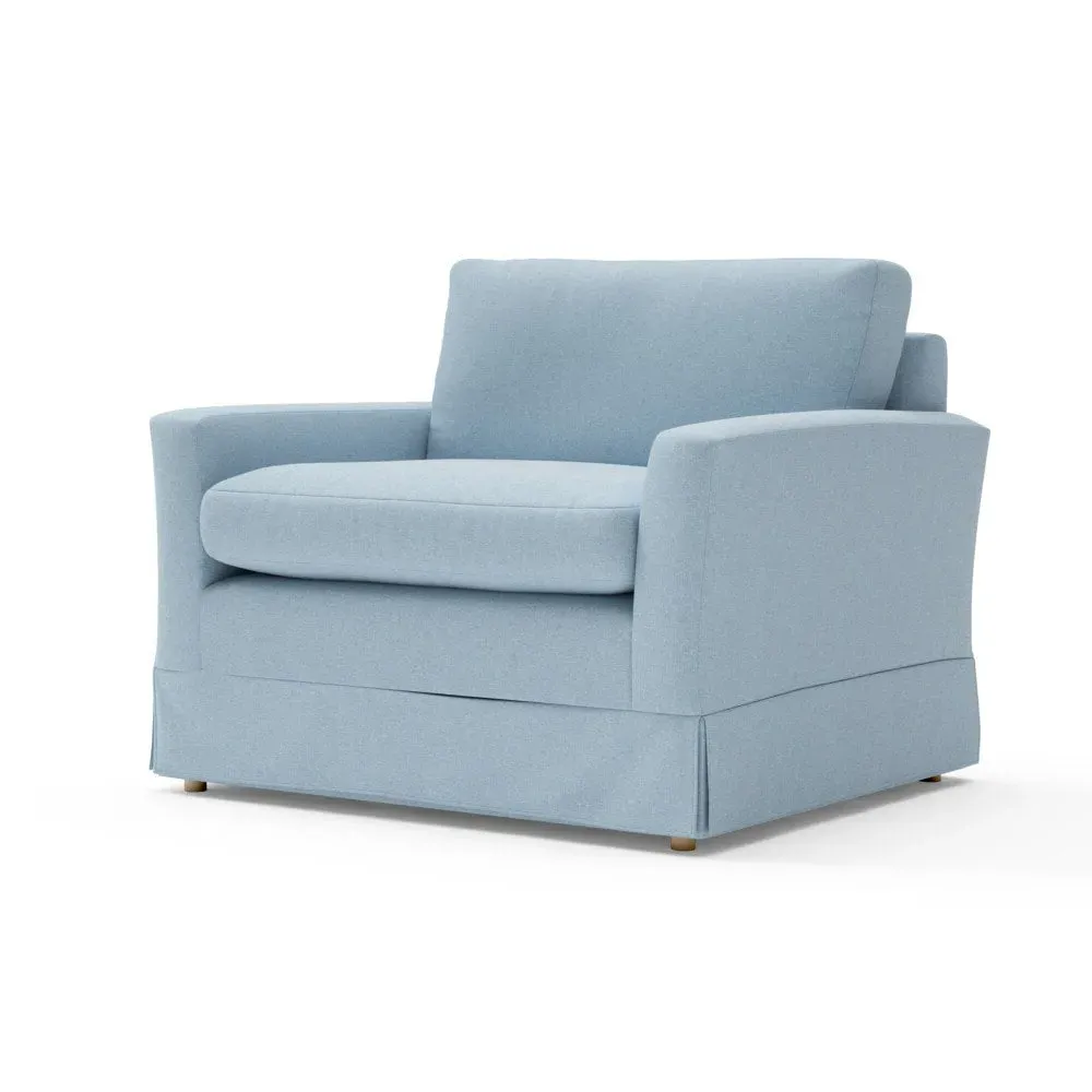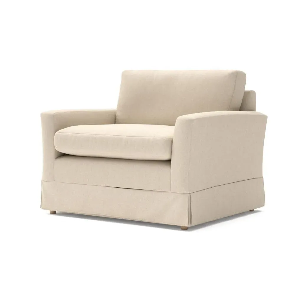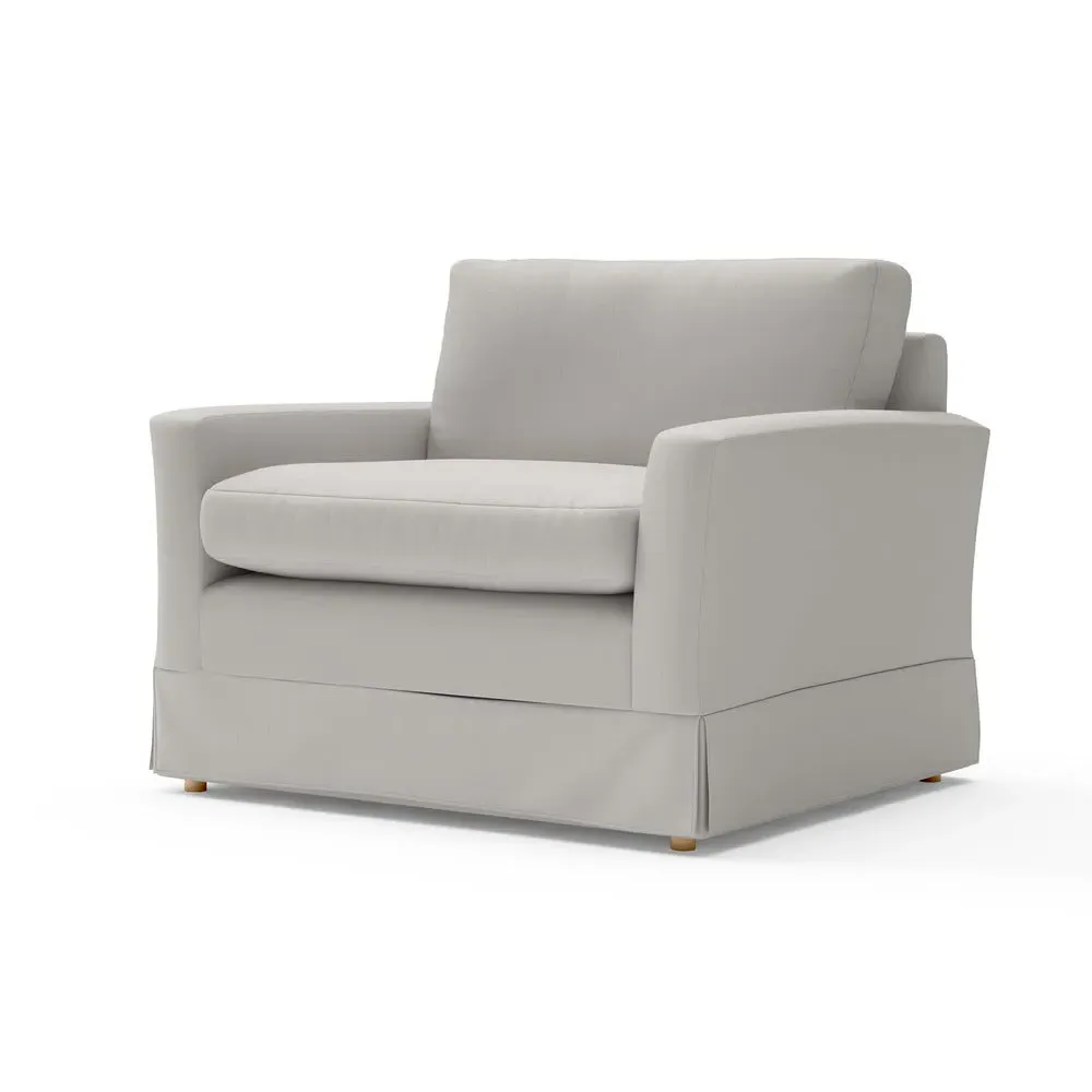 The Love Seat offers comfort with its slim arms and clean-lined silhouette, accented by house linen mix upholstery. Its straight back provides support for additional cushions, while the streamlined design adds versatility to any space. The construction allows for both feather and low maintenance interior options, and the frame ensures lasting durability with removable loose covers available separately.