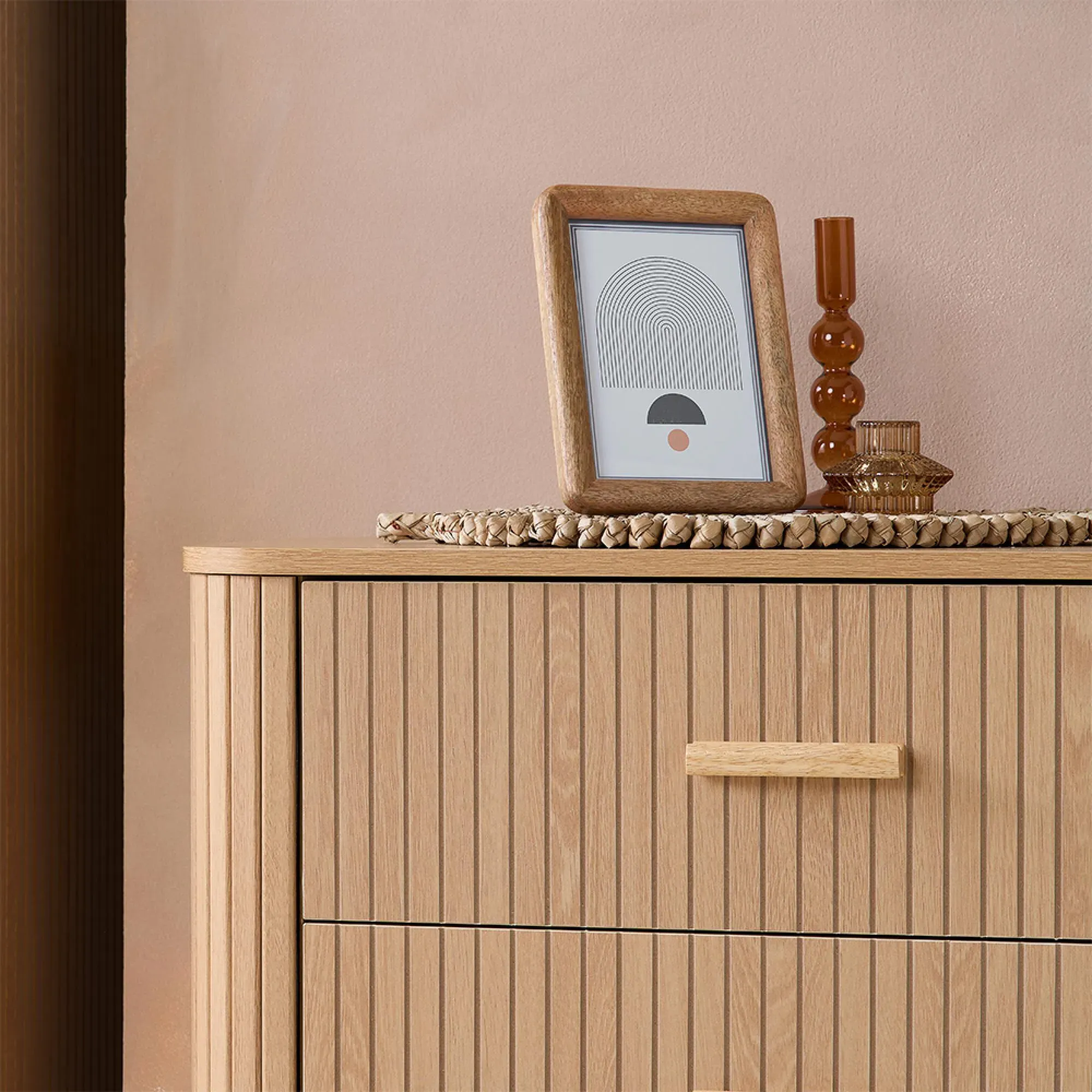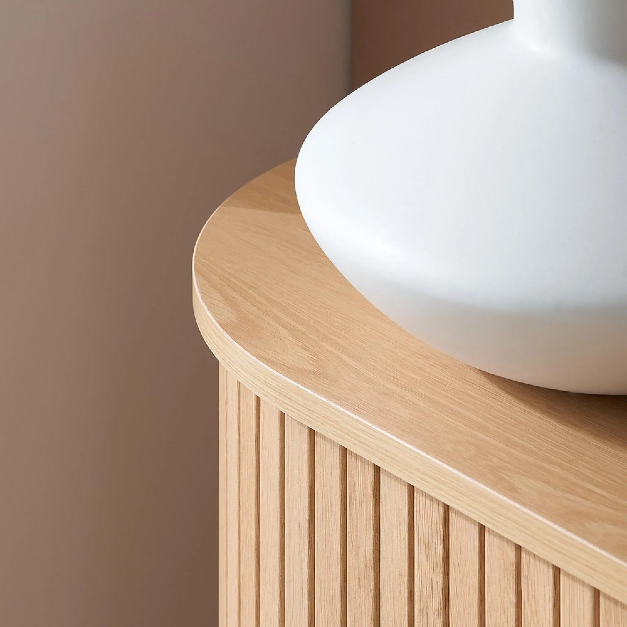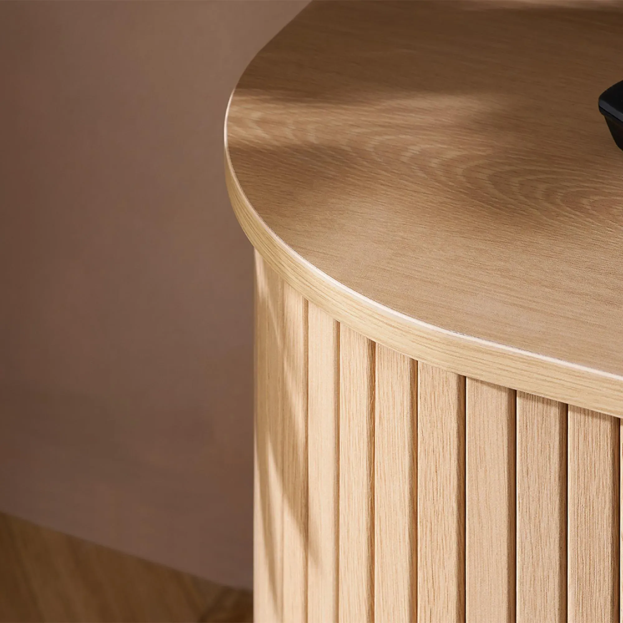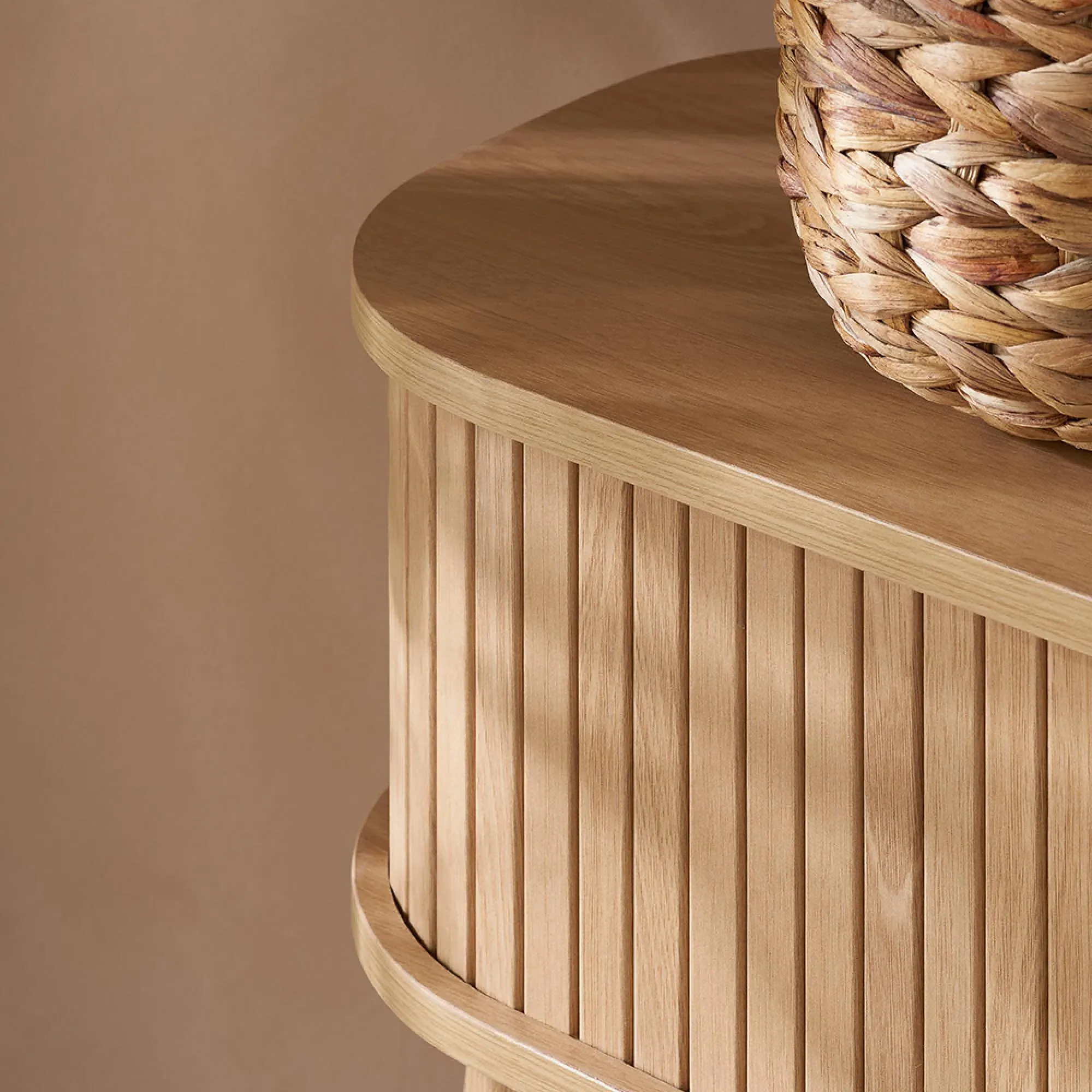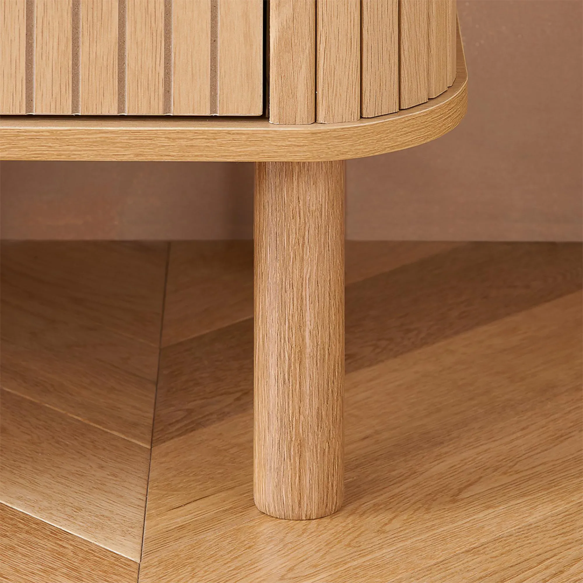 The Axel bedside cabinet combines curved design with fluted detailing for a distinctive look. Its single drawer provides convenient storage for bedside essentials, while the oak finish adds natural warmth to any space. The curved profile softens the overall appearance, and the sturdy construction ensures lasting durability.