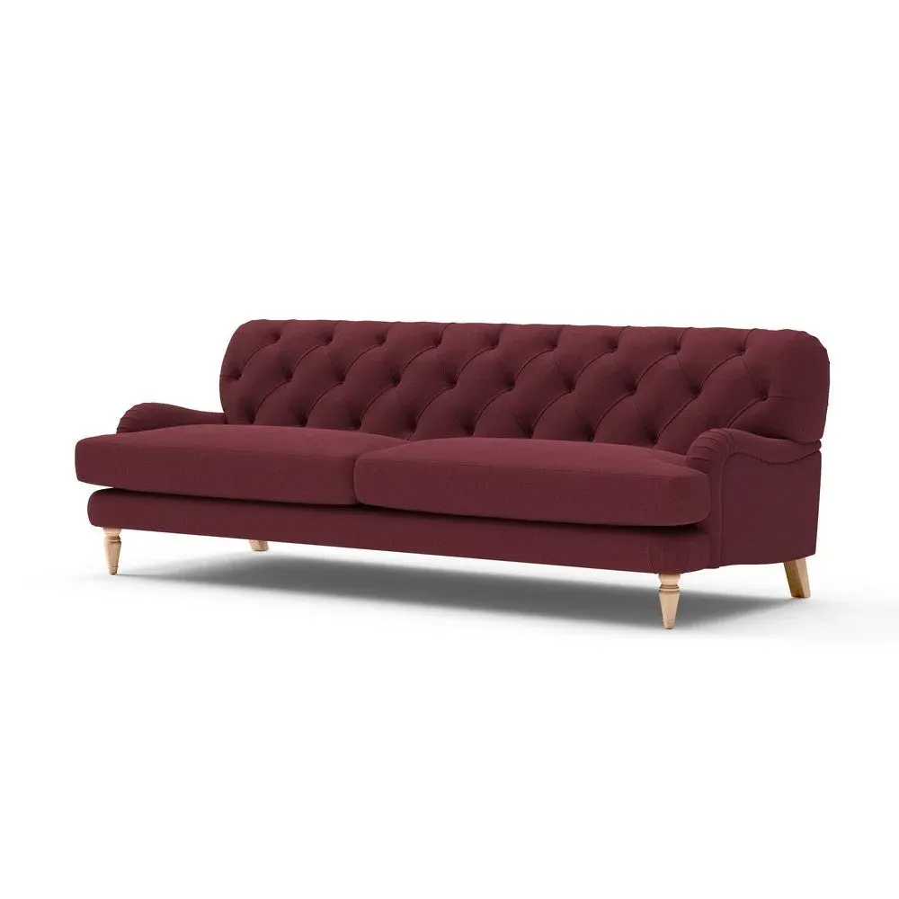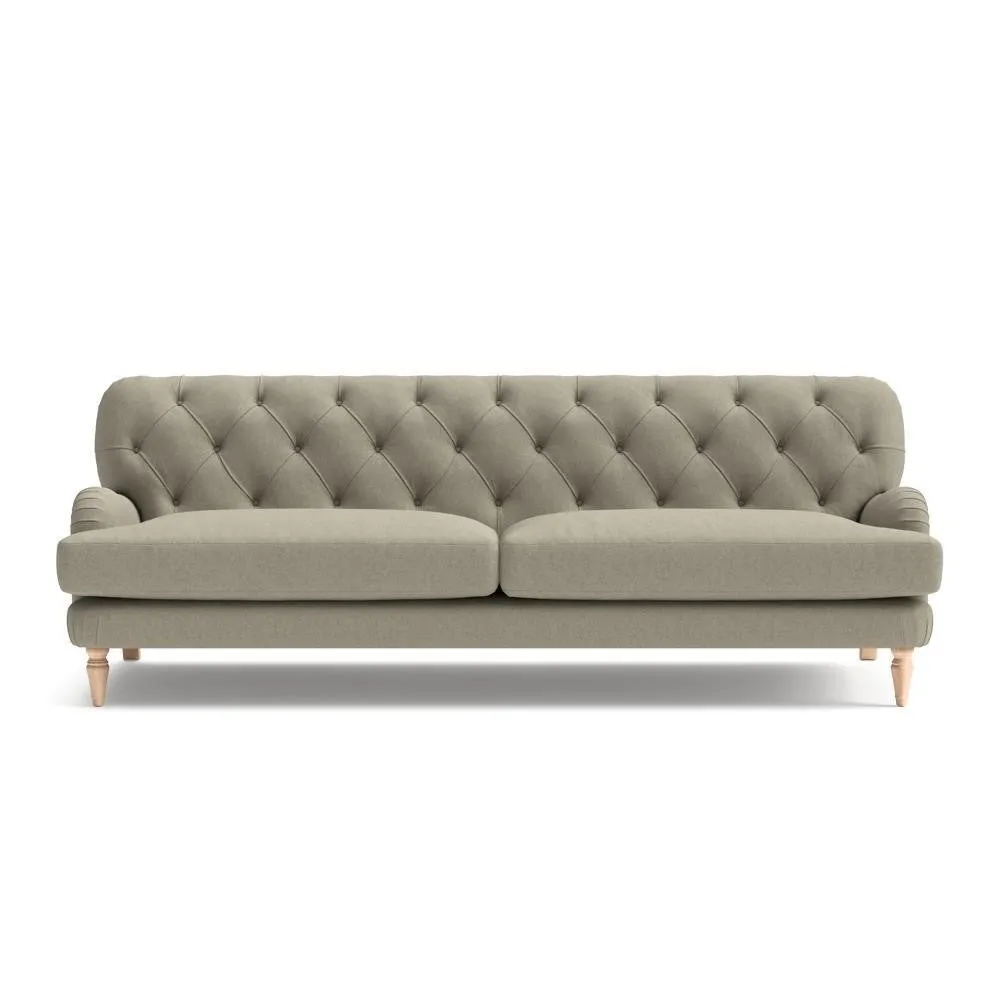 The sofa features sophisticated comfort through its deep-buttoned back and curved low arm design. Its house linen mix upholstery offers natural breathability and texture, while the spacious seating provides room for relaxation. The low arm height creates space for extra cushions, and the choice between feather or low maintenance seat interiors ensures optimal comfort.