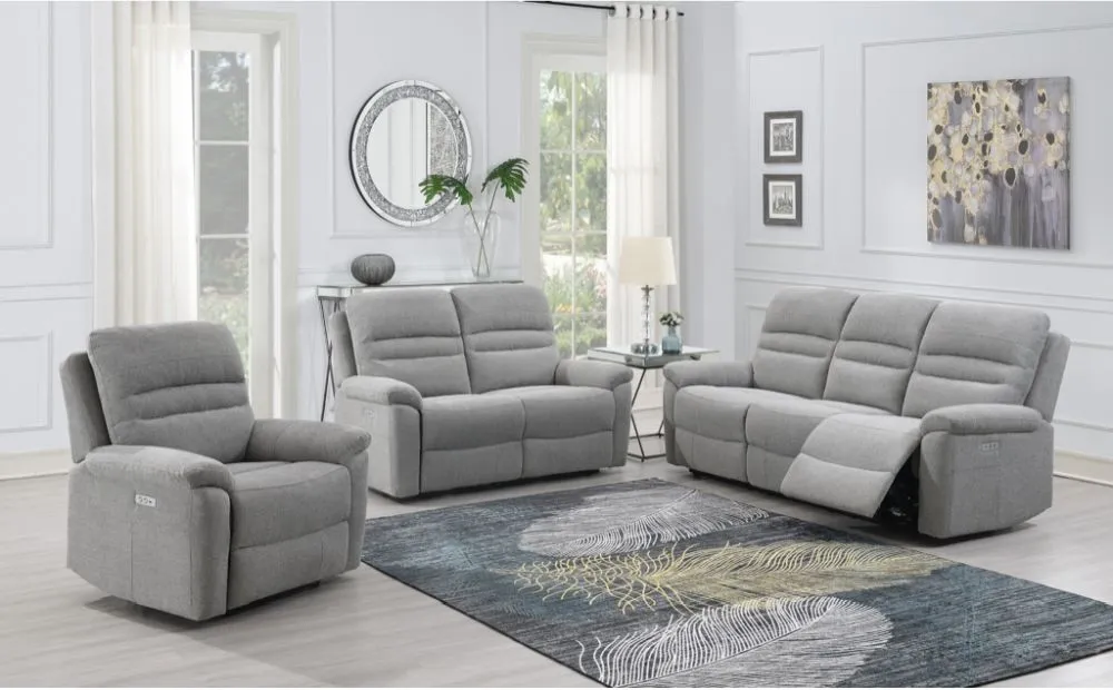 The Belmont Recliner Sofa Suite combines functionality with comfort through its 3+1+1 seating arrangement, each piece featuring independent reclining action. The grey fabric upholstery offers a versatile color that works with contemporary and traditional settings, while the quality construction provides reliable support. The reclining mechanism operates smoothly across all three pieces, delivering customizable comfort for relaxation.