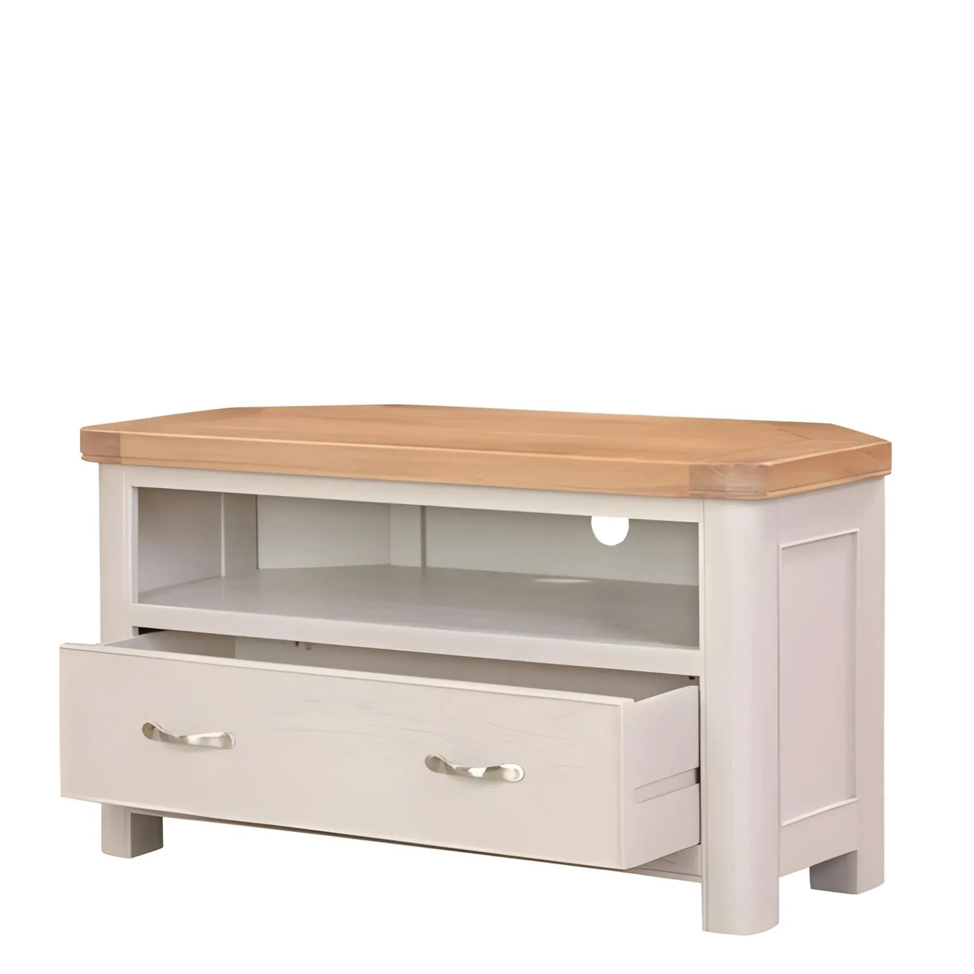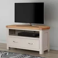 The Dorset Corner TV Unit combines practical storage with rustic charm through its hand-waxed oak finish. The single drawer provides convenient media storage, while the corner design maximizes space efficiency. Its solid oak construction ensures durability, and the rustic hand-waxed finish adds natural character to any living space.