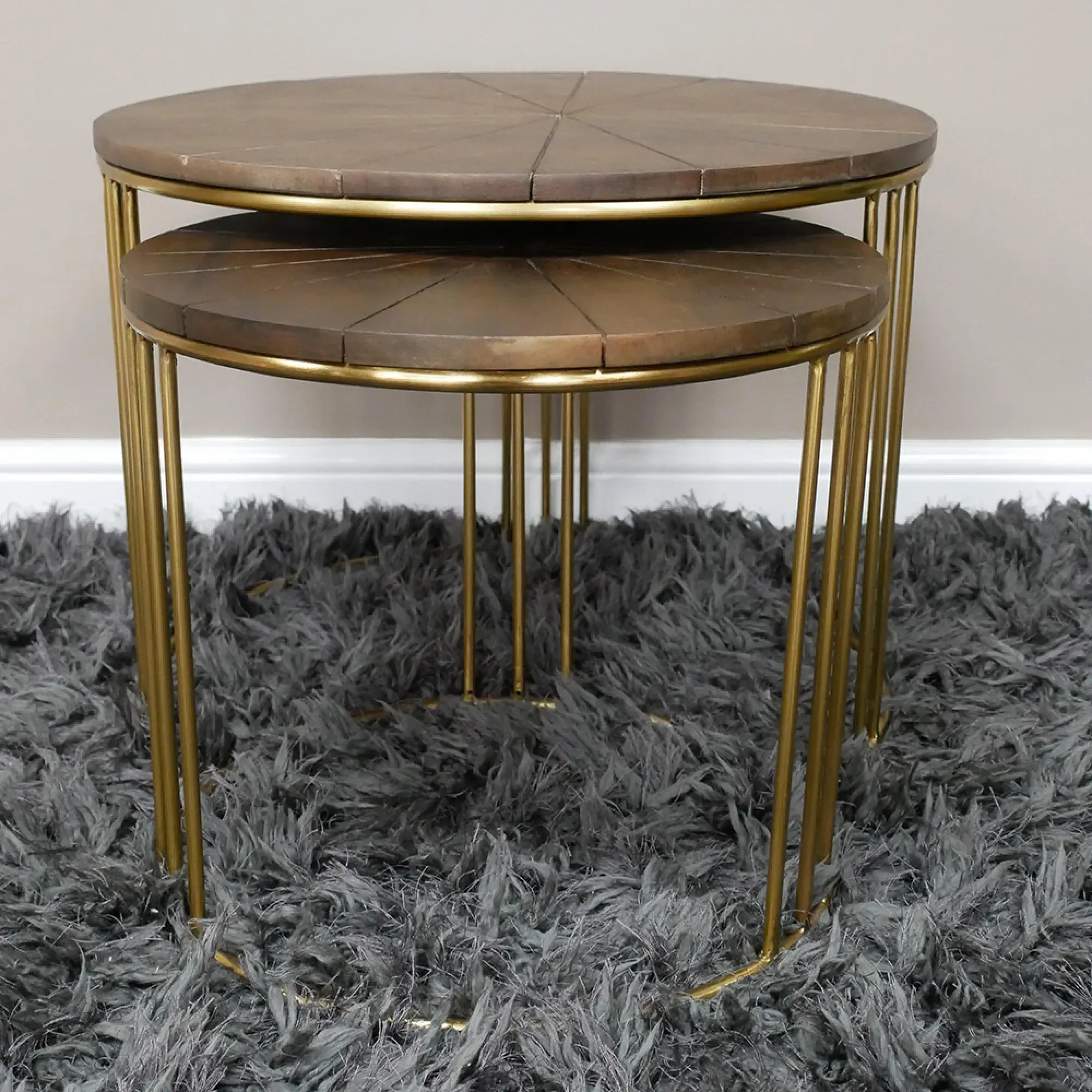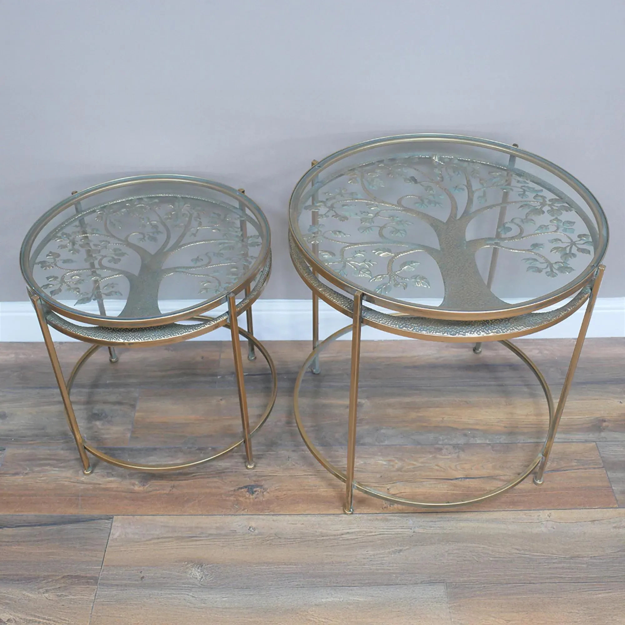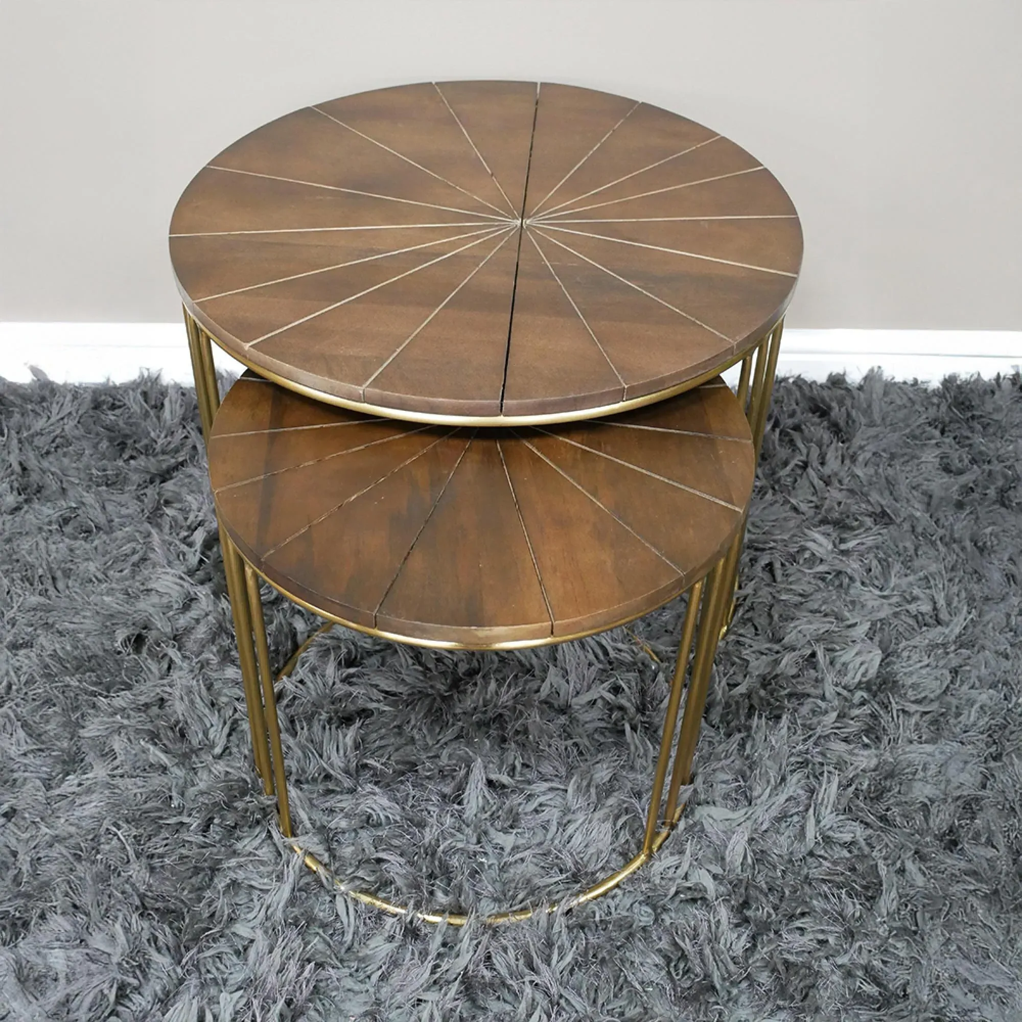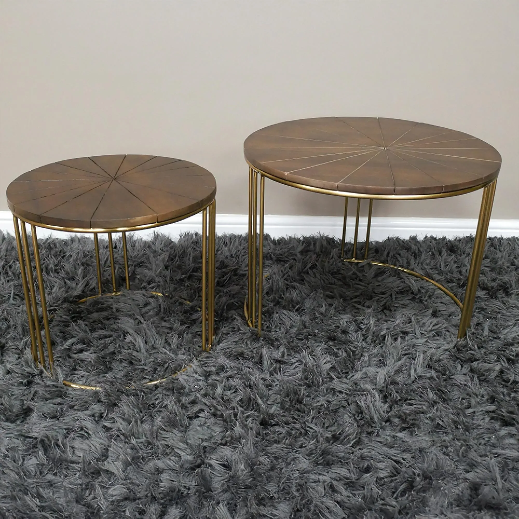 The coffee table set features sleek black glass tops supported by sturdy metal frames. Each round table combines contemporary materials for a refined appearance, while the tempered glass surface provides easy maintenance. The metal base construction ensures stability and the set of two offers flexible styling options.